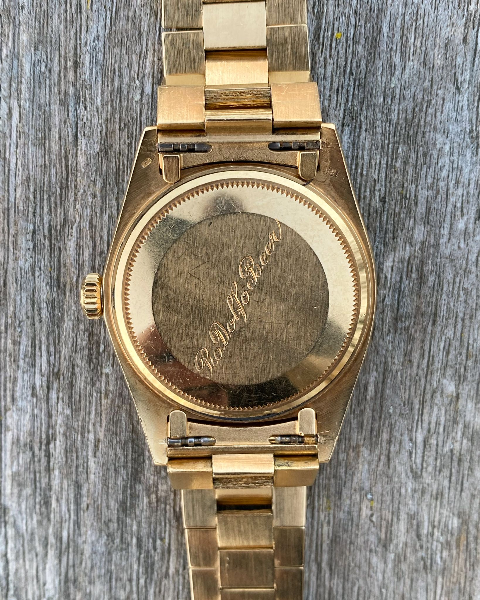 For sale is an excellent condition 36mm 18 karat yellow gold Rolex Day-Date Bark “President”. The 1807 is a 3,205,xxx serial, circa 1972 production, and bears an engraving on its caseback with the name of its original owner, but is not accompanied by box or papers.