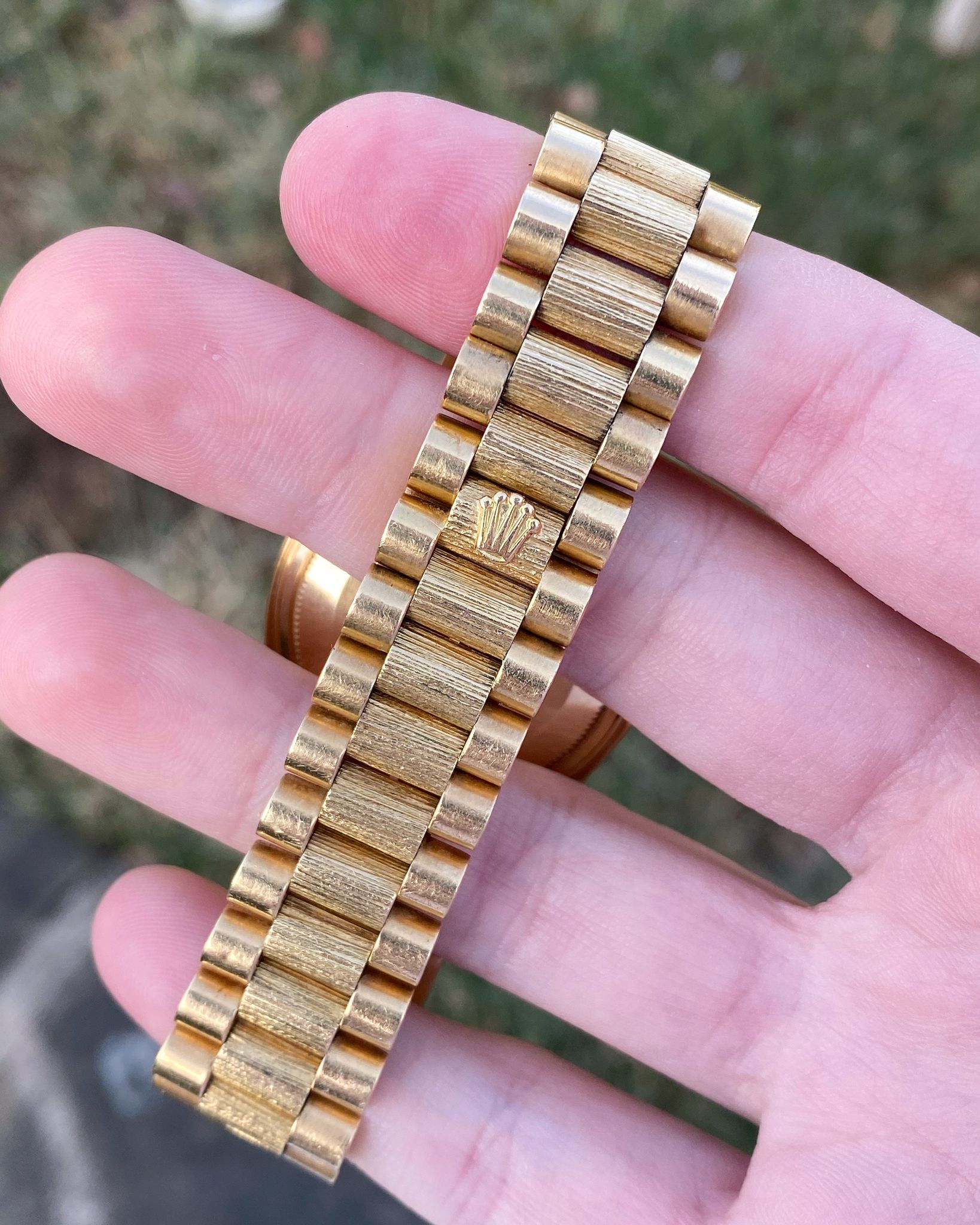 The Rolex features a brushed yellow gold case, which is accented by a factory set gold 12 diamond bark finish bezel from a reference 18108 Day-Date, which was fitted upon special request at some point after the 1807’s initial purchase. The Day-Date is mounted on its original first generation concealed clasp yellow gold bark finish President bracelet, which contains a production stamp from the fourth quarter of 1972. The President bracelet contains 21 full size links (6 screw links), and will comfortably fit a 7.25 inch wrist. The Rolex features a gorgeous matte blue “Pie-Pan” minute track dial with applied gold index hour markers, polished gold tritium coated hands, a magnified date window aperture at 3 o’clock, and a day window aperture at 12 o’clock. The tritium lume plots and hands have developed a wonderful custard colored patina with age, which is even in color. The movement used in the 1807 is the Rolex Caliber 1556, which features approximately 42 hours of power reserve.