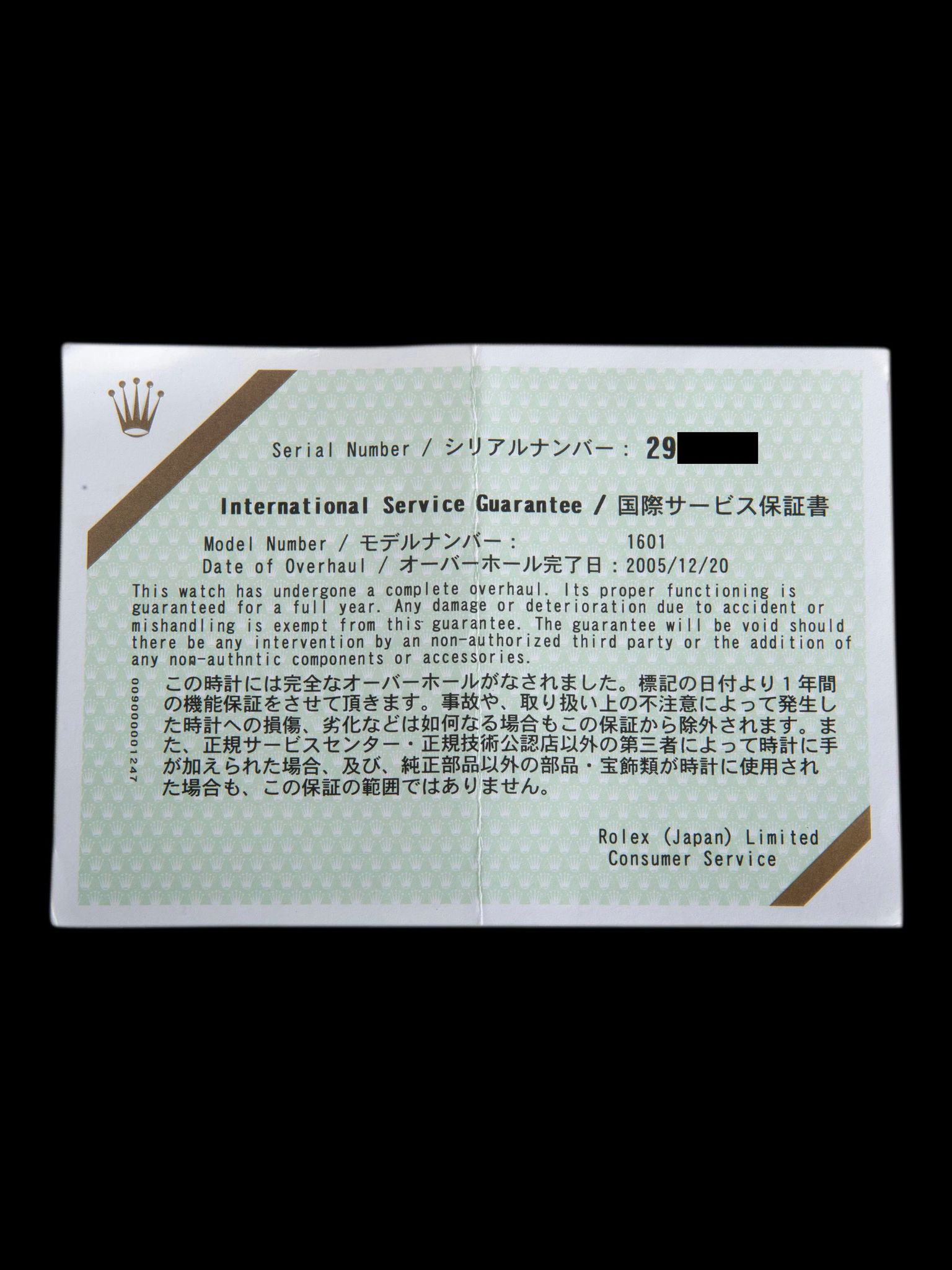 The watch comes with two Rolex Service Center cards as well as the accompanying service documents. The watch was serviced by Rolex in 2005 and 2019. The watch is keeping time perfectly.
