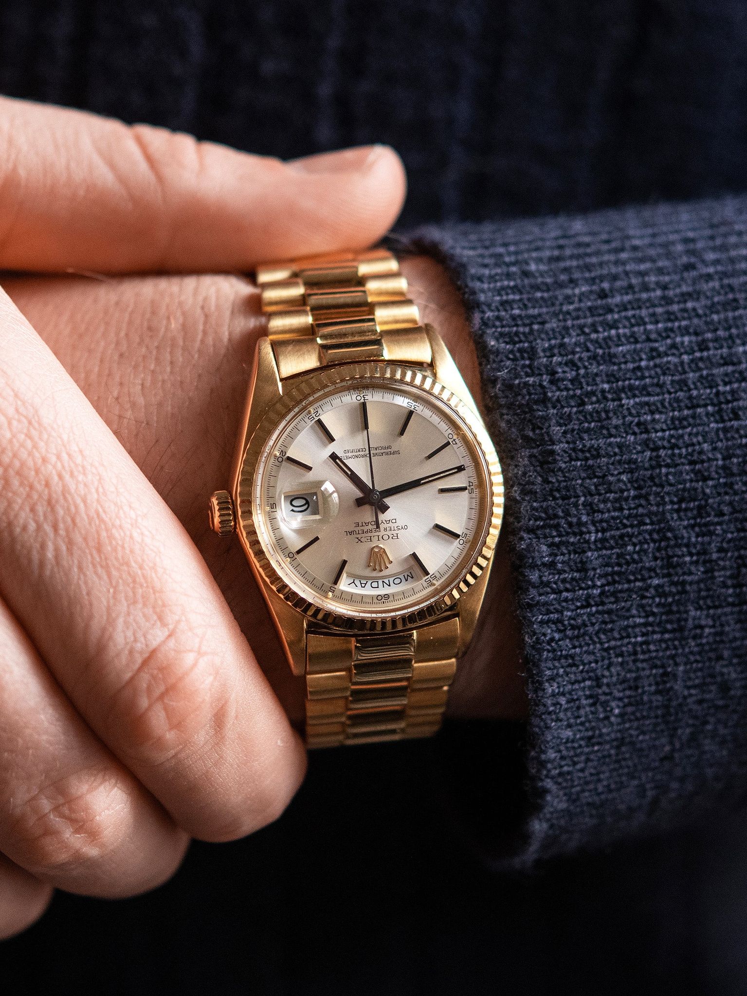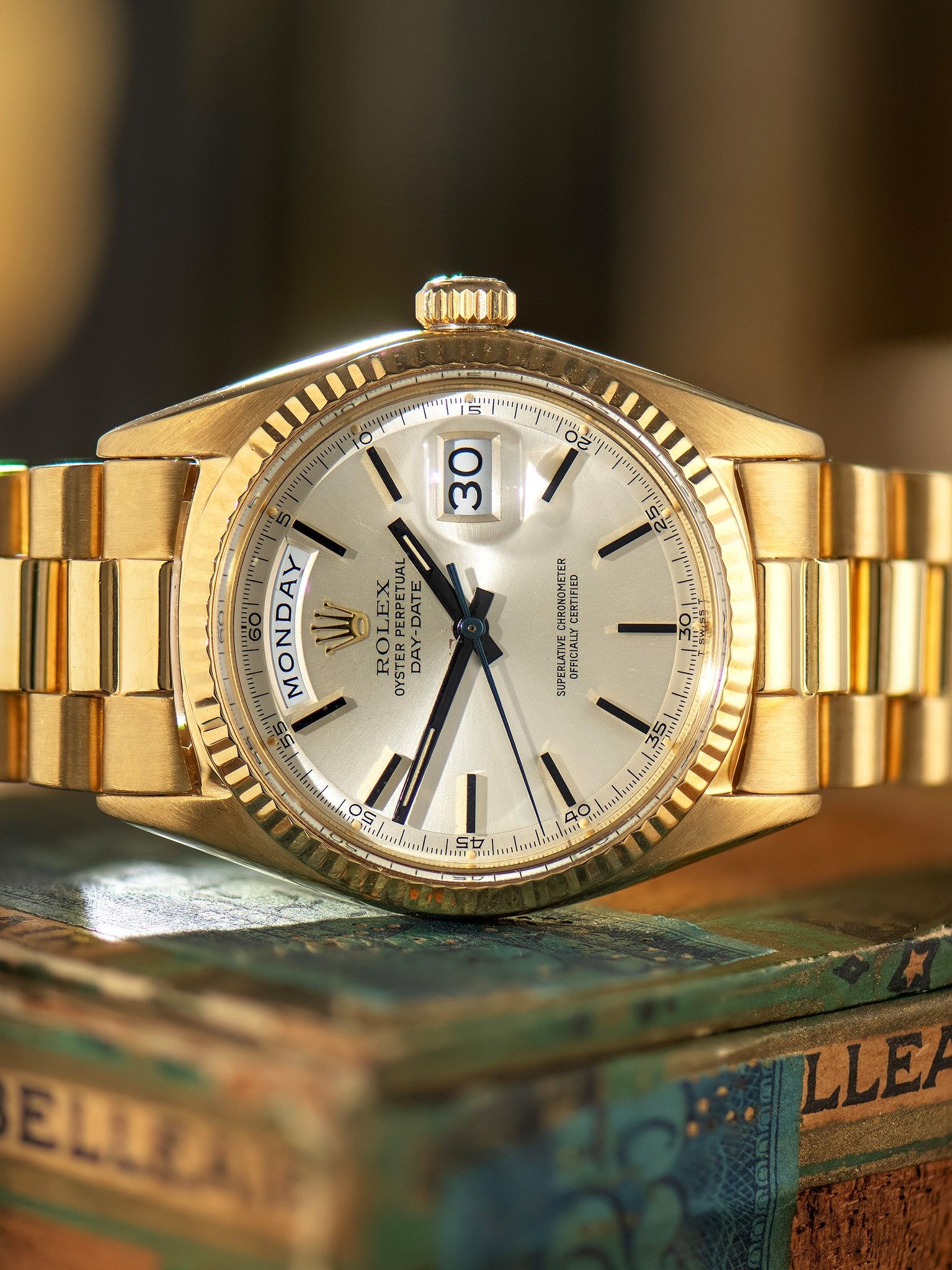 The Rolex Day-Date is one of the most iconic and beautiful watches in the Rolex catalog. The Rolex Day-Date earned the nickname "President" after it had been rumored that President Dwight Eisenhower began wearing one, however, Eisenhower wore a Rolex 18K yellow gold Oyster Perpetual Datejust which Rolex gifted to him in 1953. However the nickname President is quite fitting for the day date as Presidents Kennedy, Johnson, Ford, Reagan, Nixon and Roosevelt, all wore the Rolex Day-Date and is a symbol of status and luxury as the Rolex Day-Date is only made in precious metals most commonly 18k yellow gold and possesses both the day and date complications within the movement.