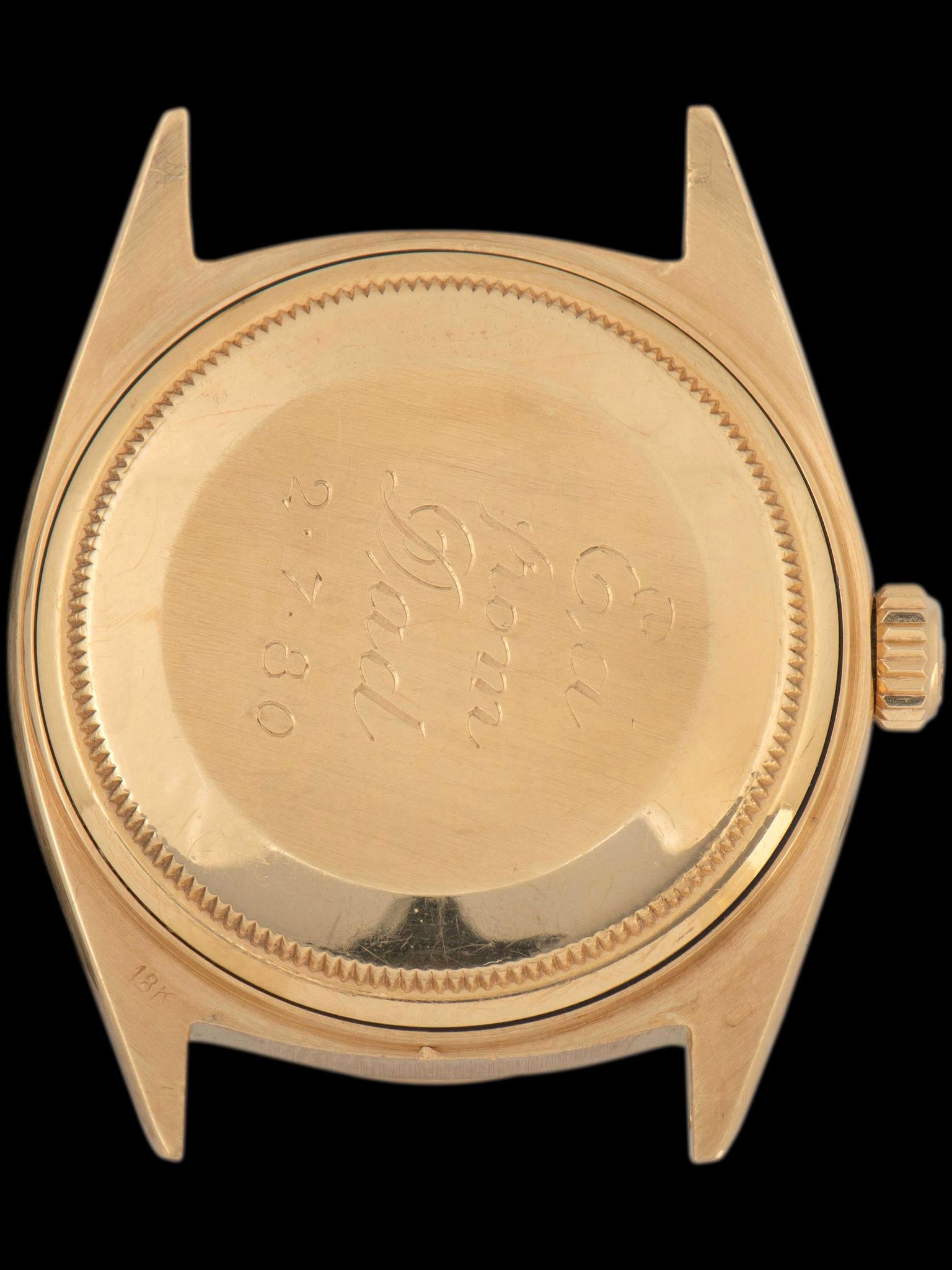 The 18K yellow gold case retains symmetrical, evenly balanced lugs that have been previously polished in the past and exhibit signs of gentle use. The 18K yellow gold fluted bezel has been previously polished and retains defined edges with minimal signs of use present. The case back features a hand engraving that reads "Ed, From Dad, 2/7/80". The 18K yellow gold President bracelet retains 18 links that show minor stretch and will fit up to a 7 1/4-inch wrist.