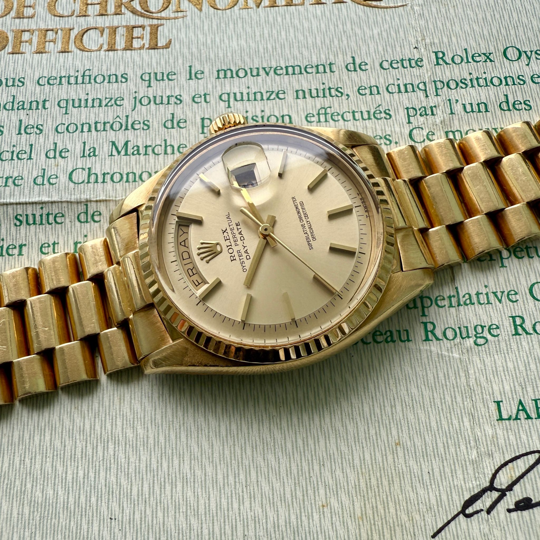 Crafted in solid 18k yellow gold, this reference 1803 showcases Rolex’s hallmark President bracelet, renowned for its unmatched elegance and comfort on the wrist. Complementing its timeless design is the classic gold dial, a signature feature that perfectly reflects the understated luxury and refinement synonymous with the Rolex name. Together, the gold case, bracelet, and dial create a monochromatic harmony that radiates opulence.