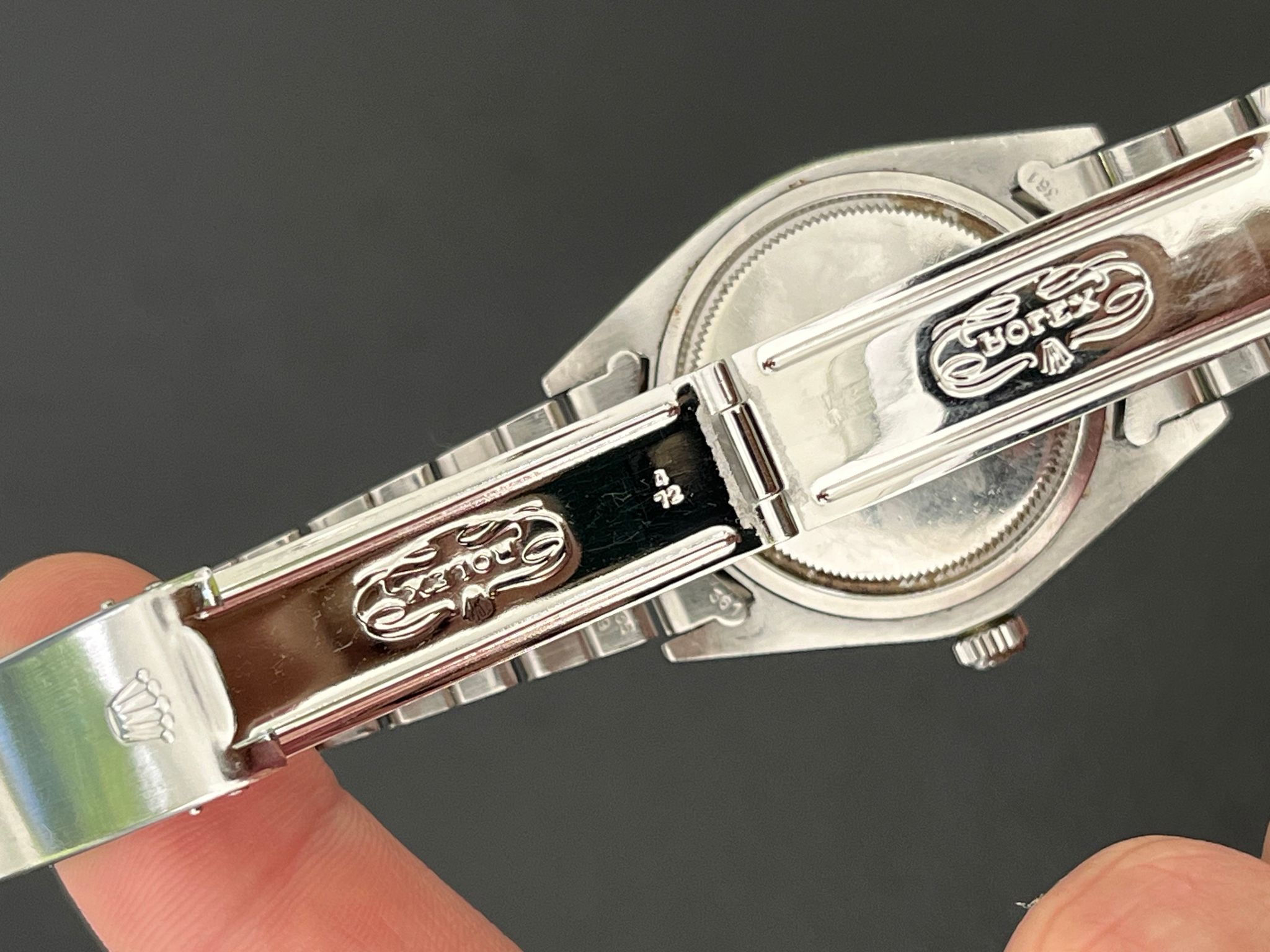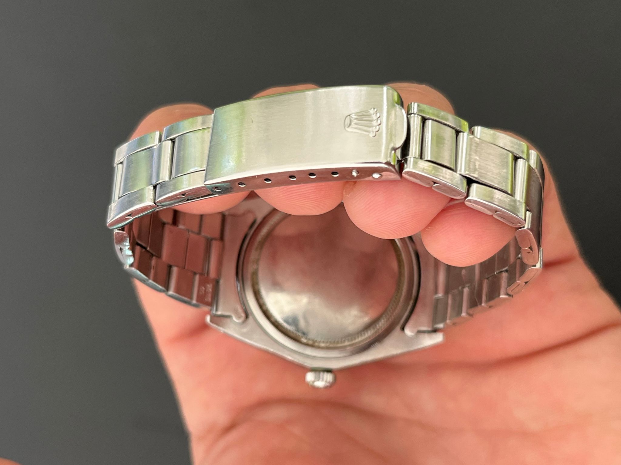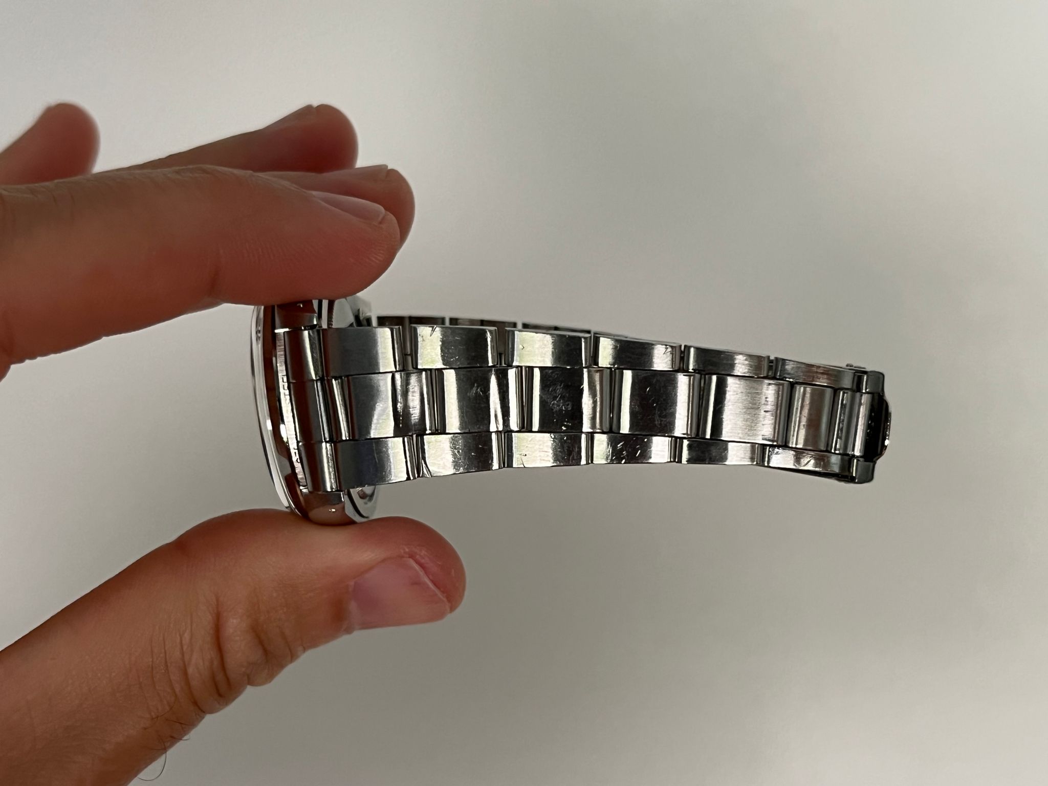 Today's example comes to us watch only and in nice pre-owned condition. The case is excellent with sharp thick lugs. The dial is mint and shows no wear and has thick matching hour plots throughout. The rivet bracelet is fully linked and shows no stretch. The clasp is stamped 4.72. There is one link that has a scratch on it otherwise we have an excellent clean pre-owned example.