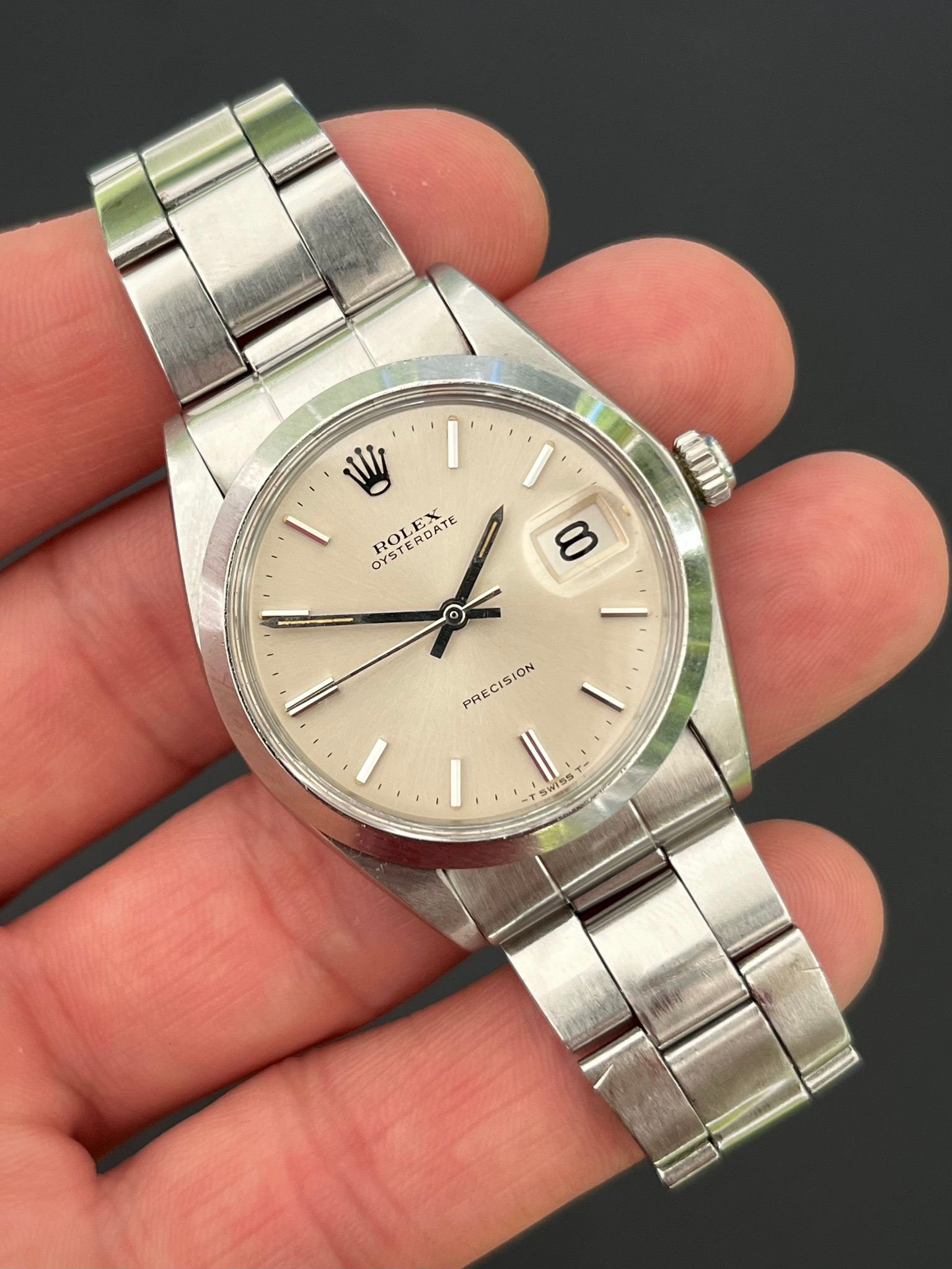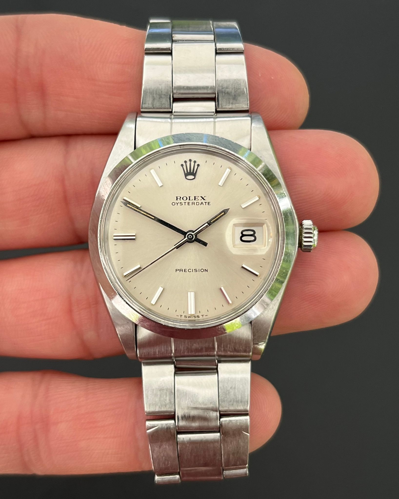 The Vintage Rolex Oysterdate Precision Reference 6694 is a timeless classic that epitomizes the elegance and precision for which Rolex is renowned. Featuring a 34mm stainless steel Oyster case, this watch is both robust and refined, suitable for any occasion. The dial, available in a variety of colors, is adorned with simple yet striking hour markers and the iconic date window at 3 o’clock, magnified by the Cyclops lens for easy readability. Powered by the manual-wind Rolex Caliber 1225 movement, the Reference 6694 ensures reliable timekeeping with a touch of vintage charm. Its smooth bezel and stainless steel Oyster bracelet complete the sophisticated look. The Vintage Rolex 6694 is a coveted piece for collectors and enthusiasts alike, representing the enduring quality and style of Rolex's storied history.