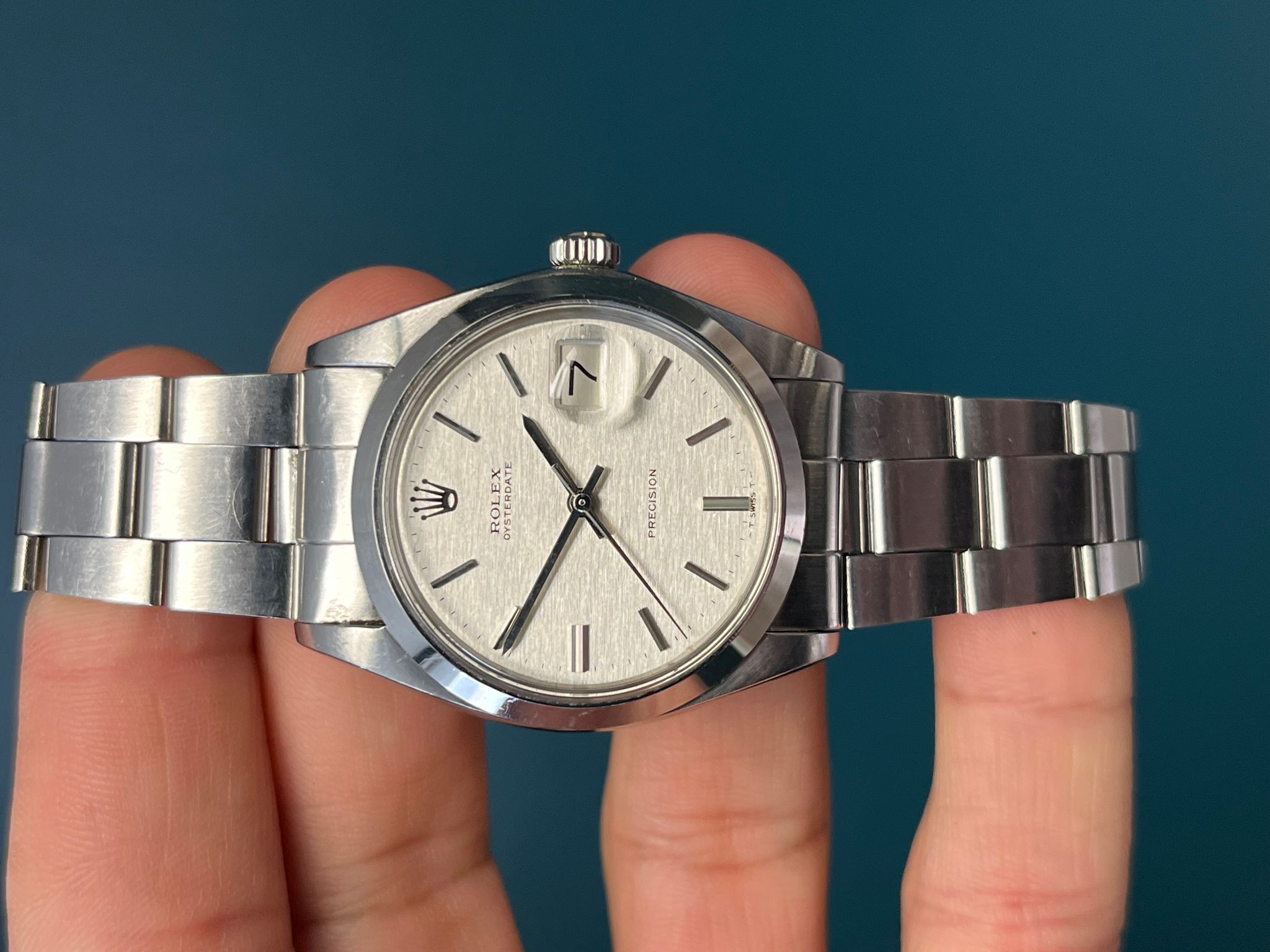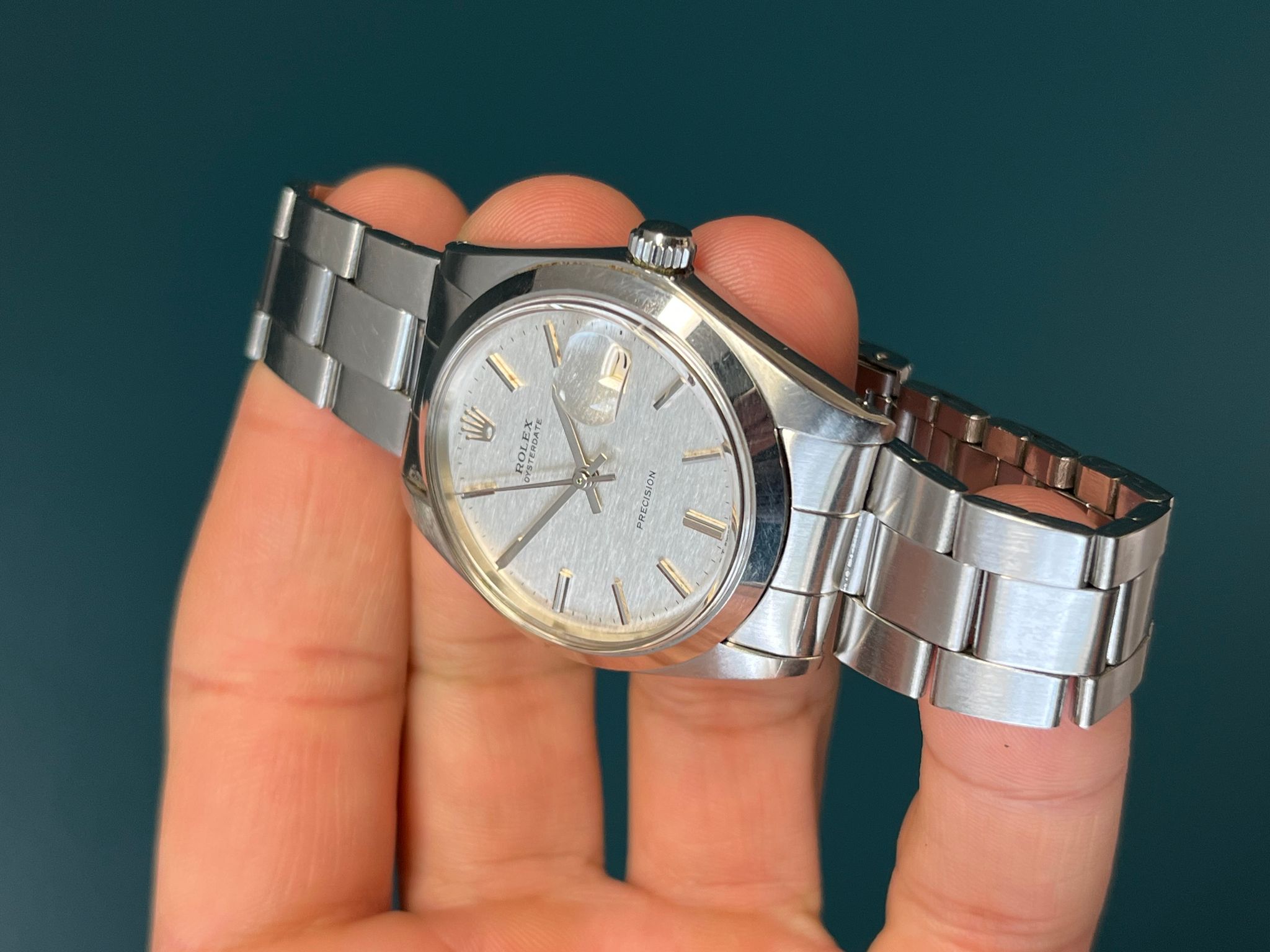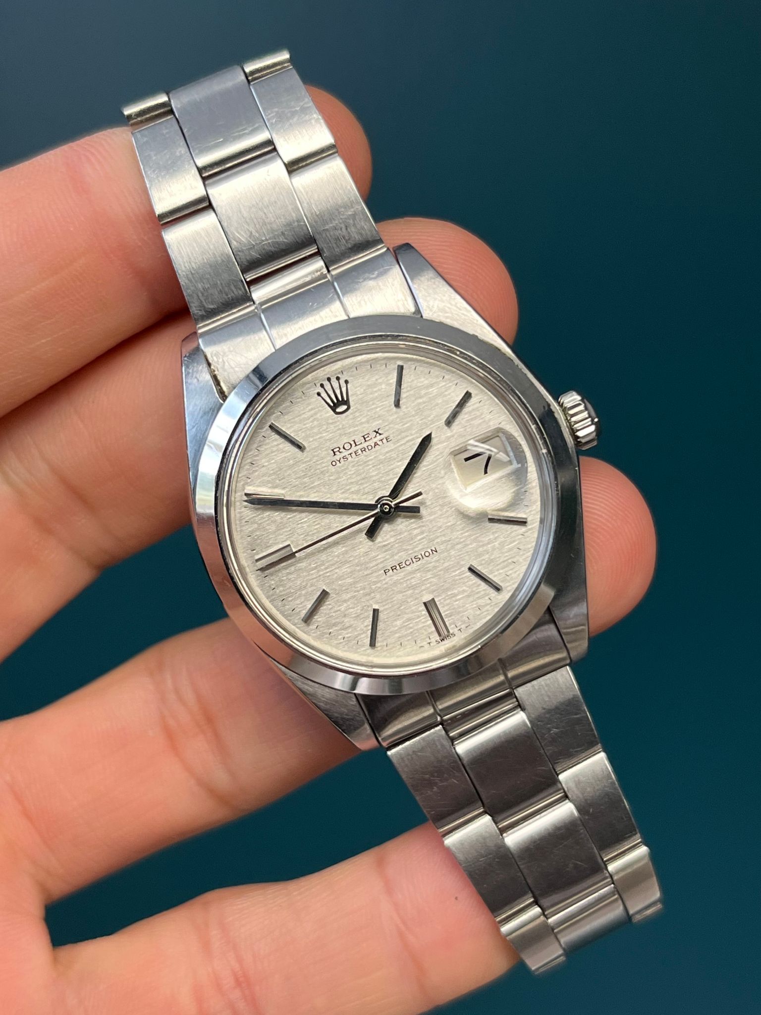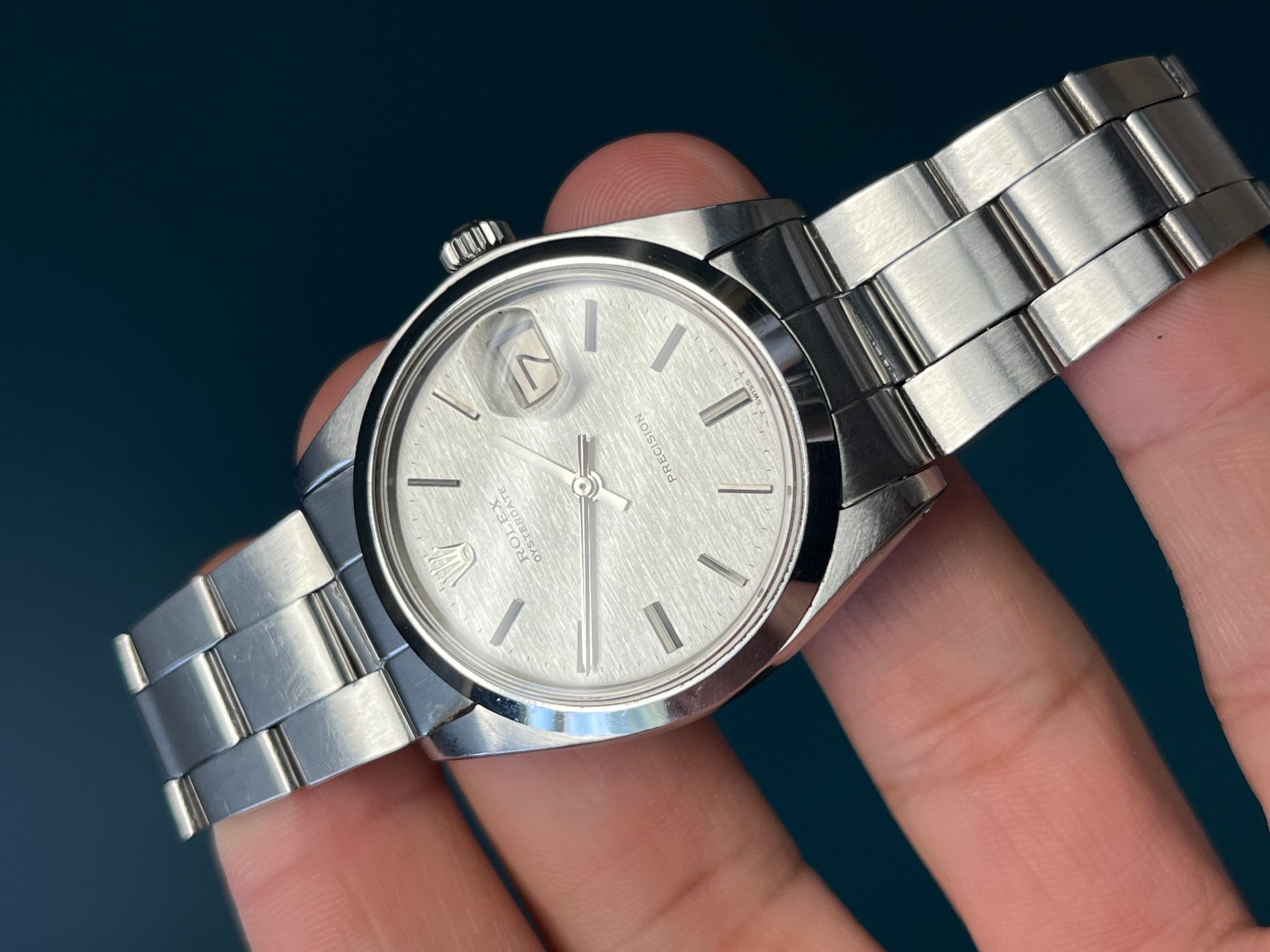 The Vintage Rolex Oysterdate Precision Reference 6694 is a timeless classic that epitomizes the elegance and precision for which Rolex is renowned. Featuring a 34mm stainless steel Oyster case, this watch is both robust and refined, suitable for any occasion. The mosaic dial is excellent, is adorned with simple yet striking hour markers and the iconic date window at 3 o’clock, magnified by the Cyclops lens for easy readability. Powered by the manual-wind Rolex Caliber 1225 movement, the Reference 6694 ensures reliable timekeeping with a touch of vintage charm. Its smooth bezel and stainless steel Oyster bracelet complete the sophisticated look. The Vintage Rolex 6694 is a coveted piece for collectors and enthusiasts alike, representing the enduring quality and style of Rolex's storied history.