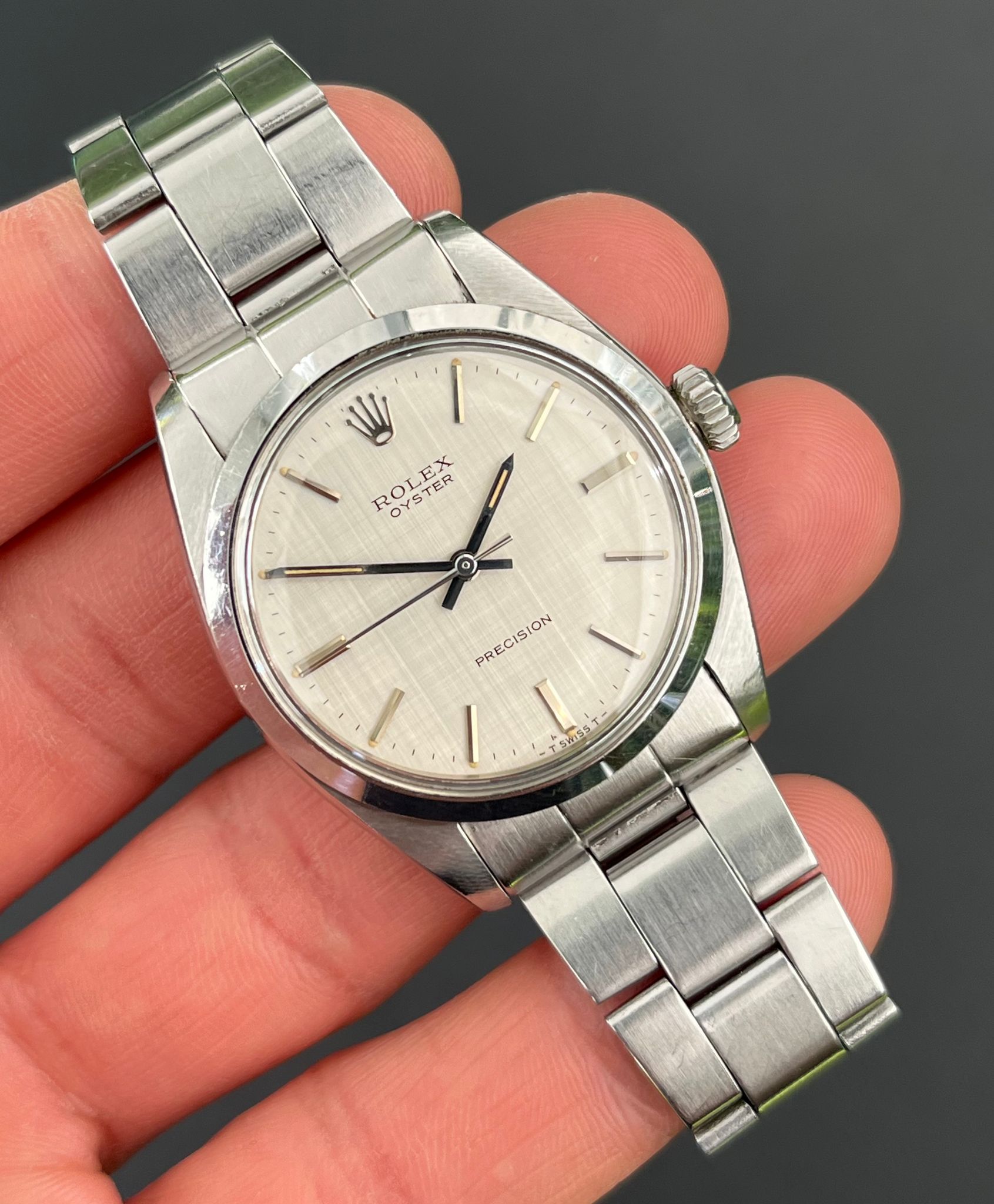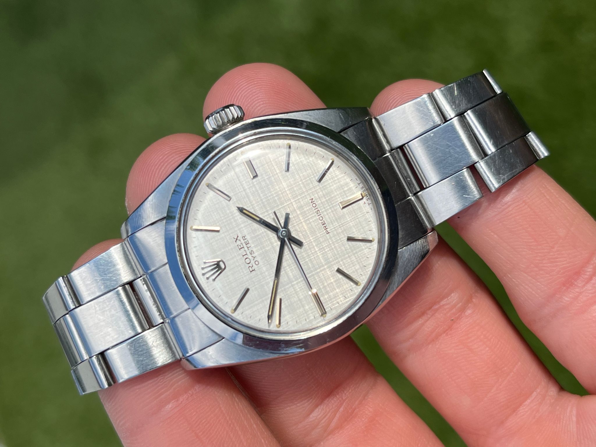 The vintage Rolex Oyster reference 6426 with a linen dial is a quintessential example of Rolex's timeless design and precision craftsmanship. Encased in a 34mm stainless steel Oyster case, this manual-wind timepiece exudes understated elegance and durability. The highlight of this model is its beautifully textured linen dial, which features an intricate crosshatch pattern that adds a unique depth and character, catching the light in a subtle yet captivating way. Applied baton hour markers and slender hands enhance the watch’s refined aesthetic, while the iconic Rolex coronet at 12 o’clock serves as a distinguished hallmark of quality.