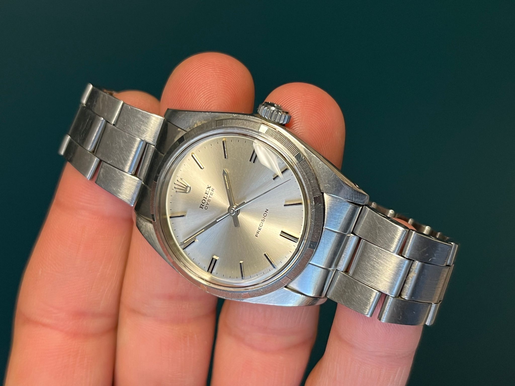 The vintage Rolex Oyster reference 6427 is a timeless expression of understated elegance and classic Rolex craftsmanship. Housed in a sleek 34mm stainless steel case, this manual-wind timepiece embodies the simplicity and durability that the Oyster line is renowned for. The standout feature of this watch is its excellent overall vintage condition. The mint silver sunburst dial complemented by applied hour markers and the iconic Rolex crown at 12 o'clock, the dial offers a perfect blend of vintage charm and refined aesthetics.