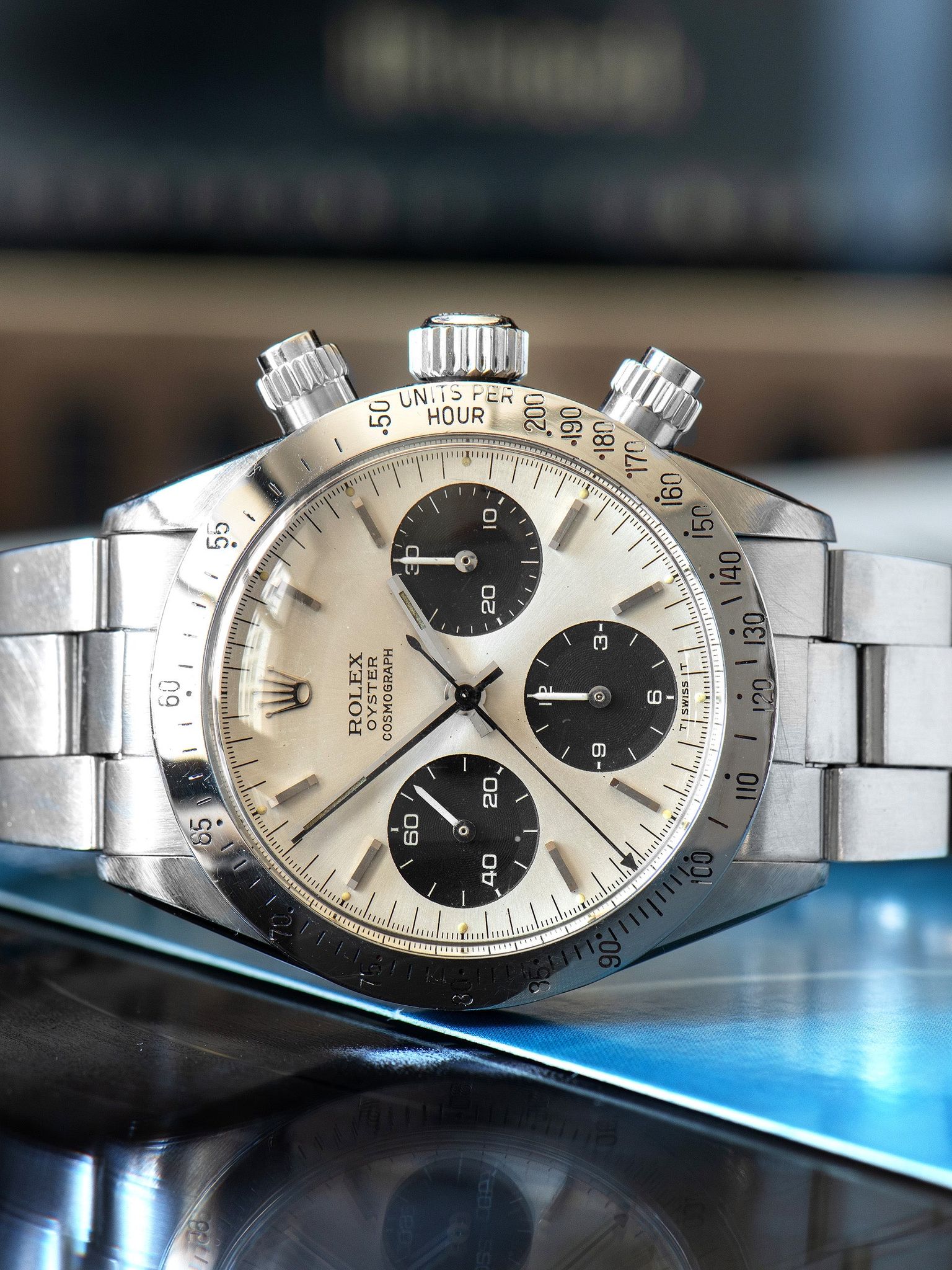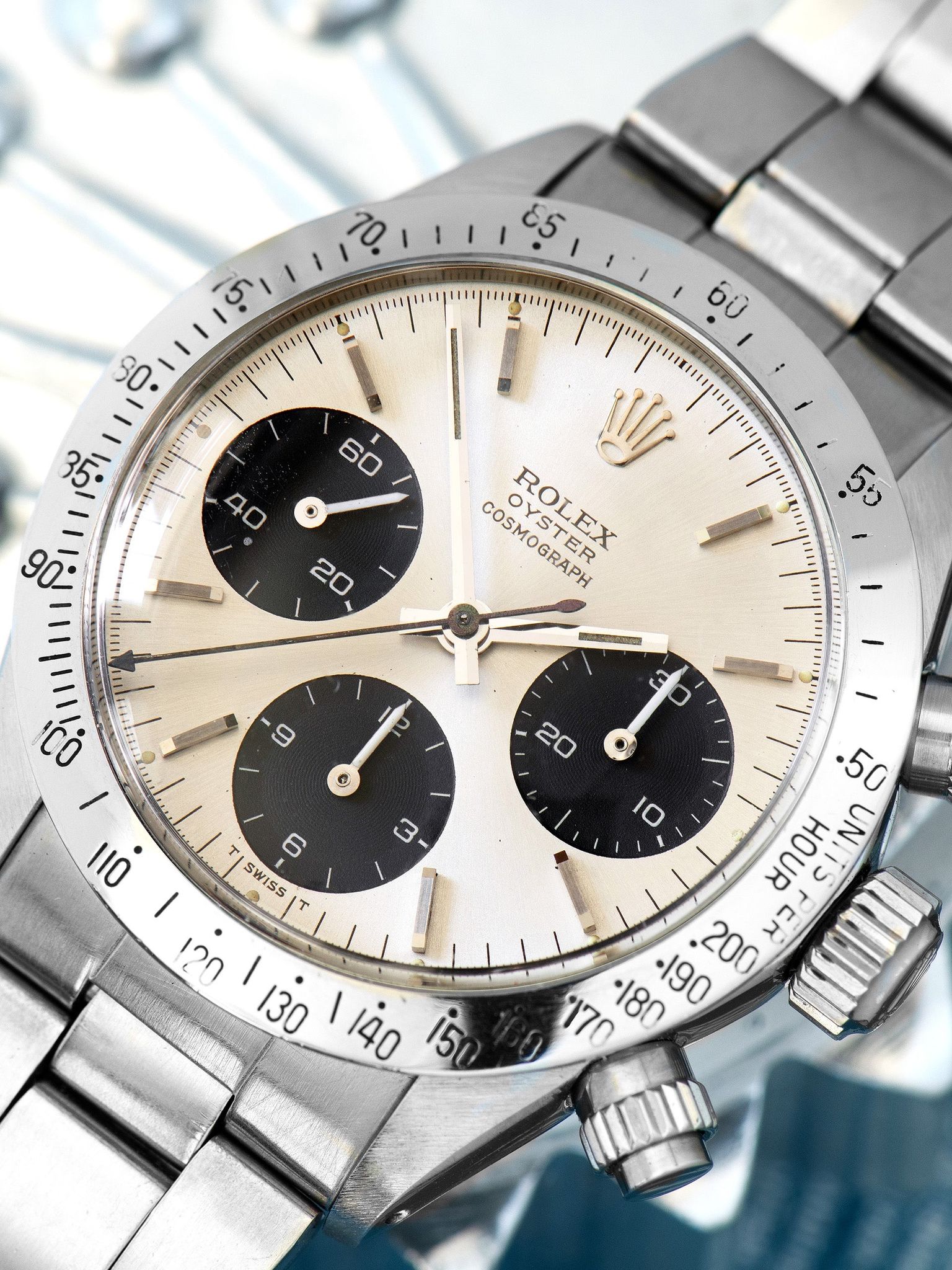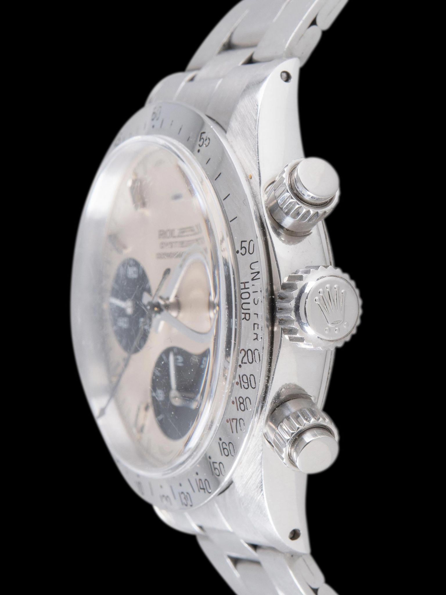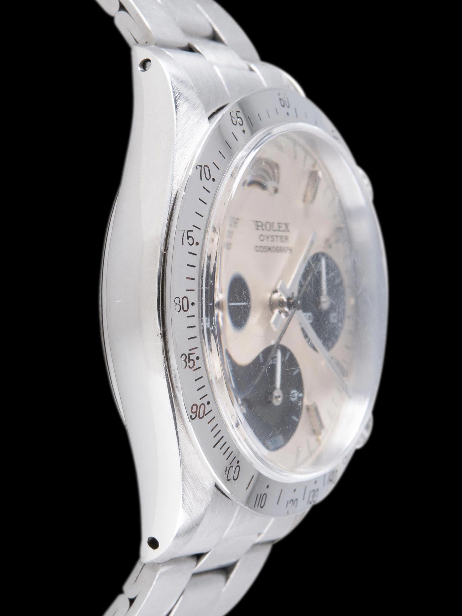The original silver sunburst "ROC" dial is truly exceptional, exhibiting no damage and only nominal elements of age that are invisible to the naked eye. The tritium lume plots have aged to a charming creamy-yellow patina, and all of the lume plots remain intact under UV light inspection though the 3 o'clock plot exhibits some light degradation, which is common for Daytonas of this era. The original hands have been professionally restored with tritium and feature a color that is a few shades darker than the dial lume.