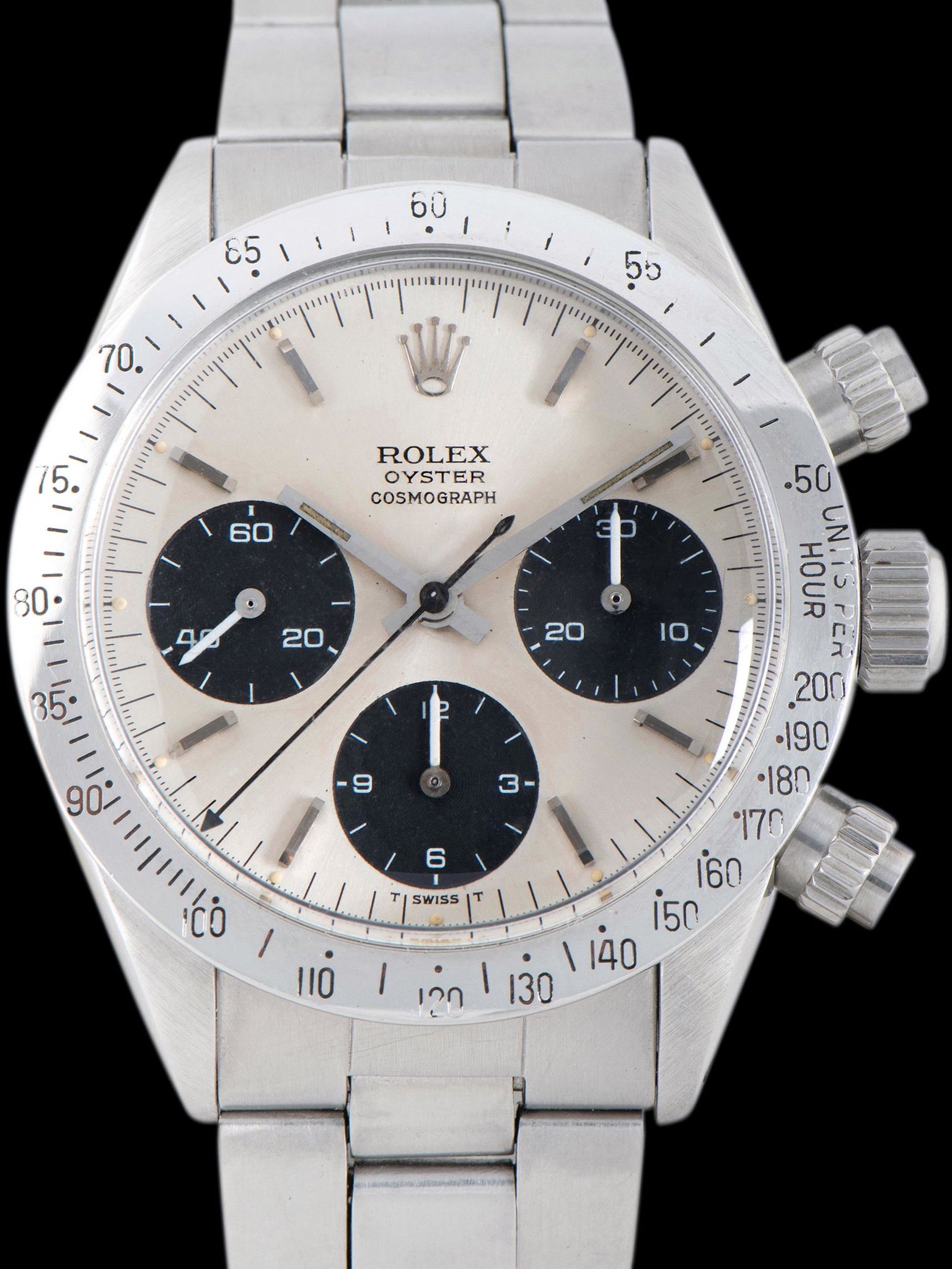 The exceptional case retains thick, crisp, and symmetrical lugs that show only gentle signs of previous use. The stainless steel “UPH” bezel is in excellent condition, showing minimal signs of use and only minor loss to the black enamel inlay. The Mk. II screw-down pushers are original to the watch. The inside of the case back is stamped 6262 which is correct as Rolex parts were interchangeable for this reference and this era. The original Rolex 7835 folded-link Oyster bracelet with 271 end pieces retains 13 links that show subtle stretch and will fit up to a 7 1/2-inch wrist.