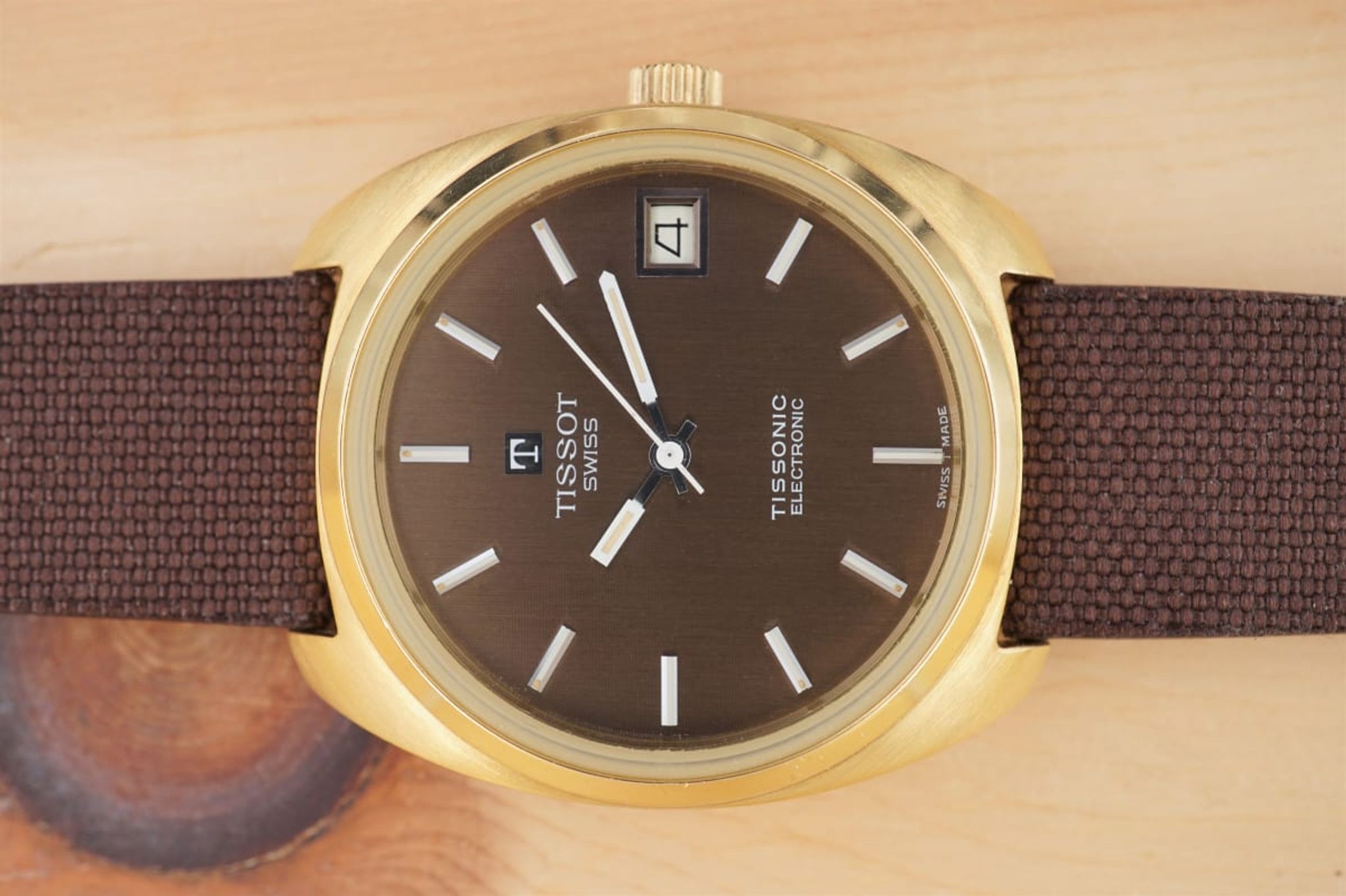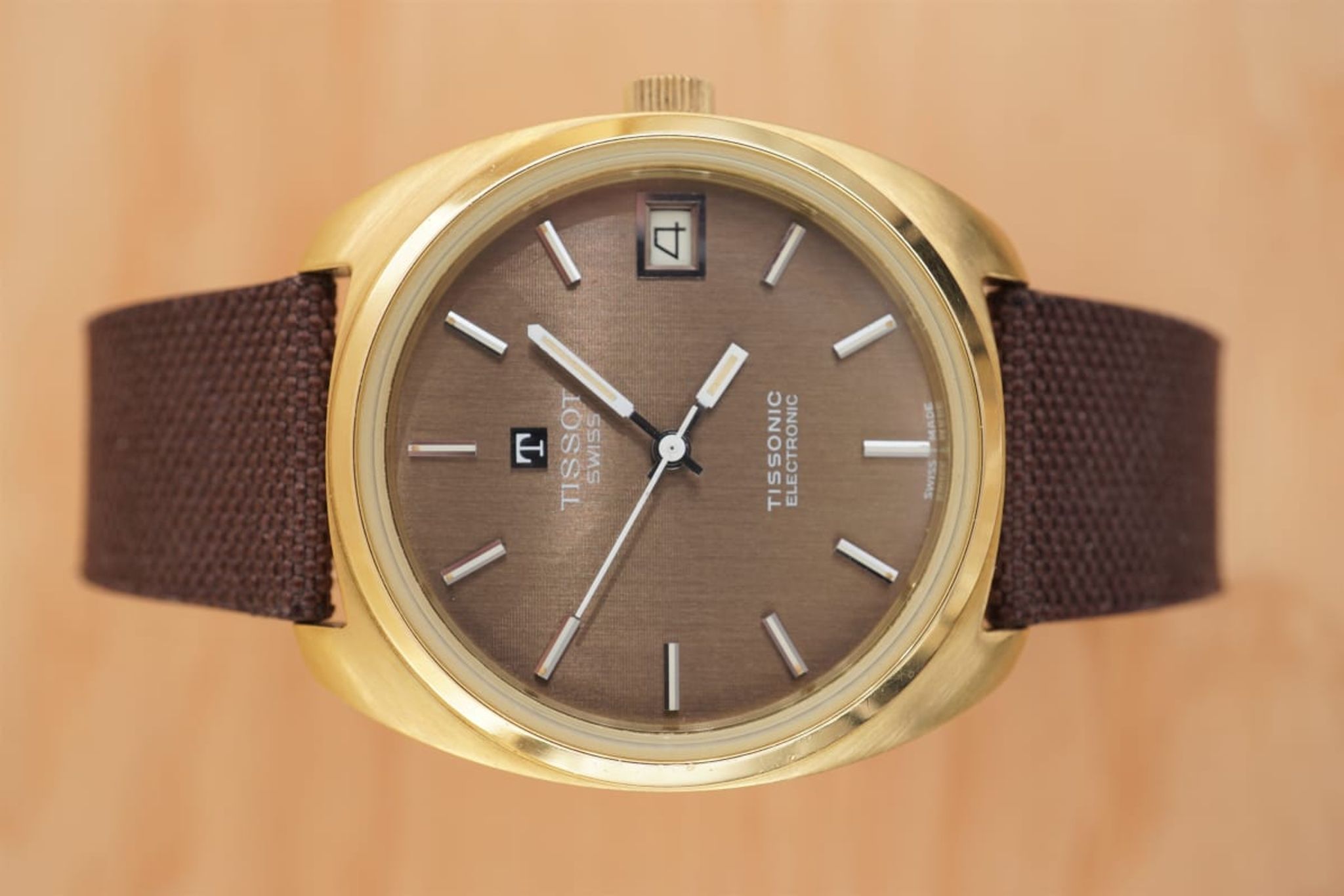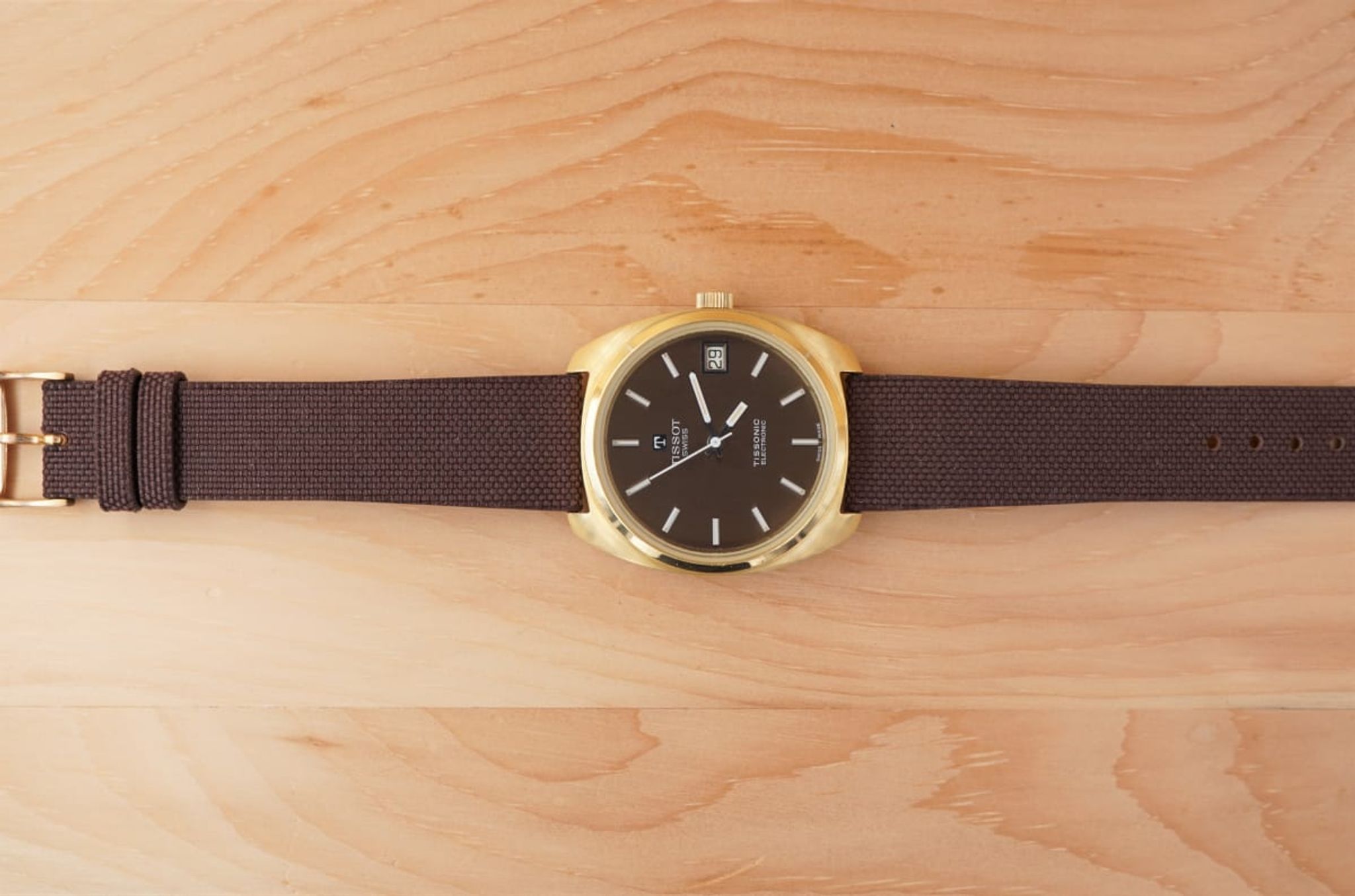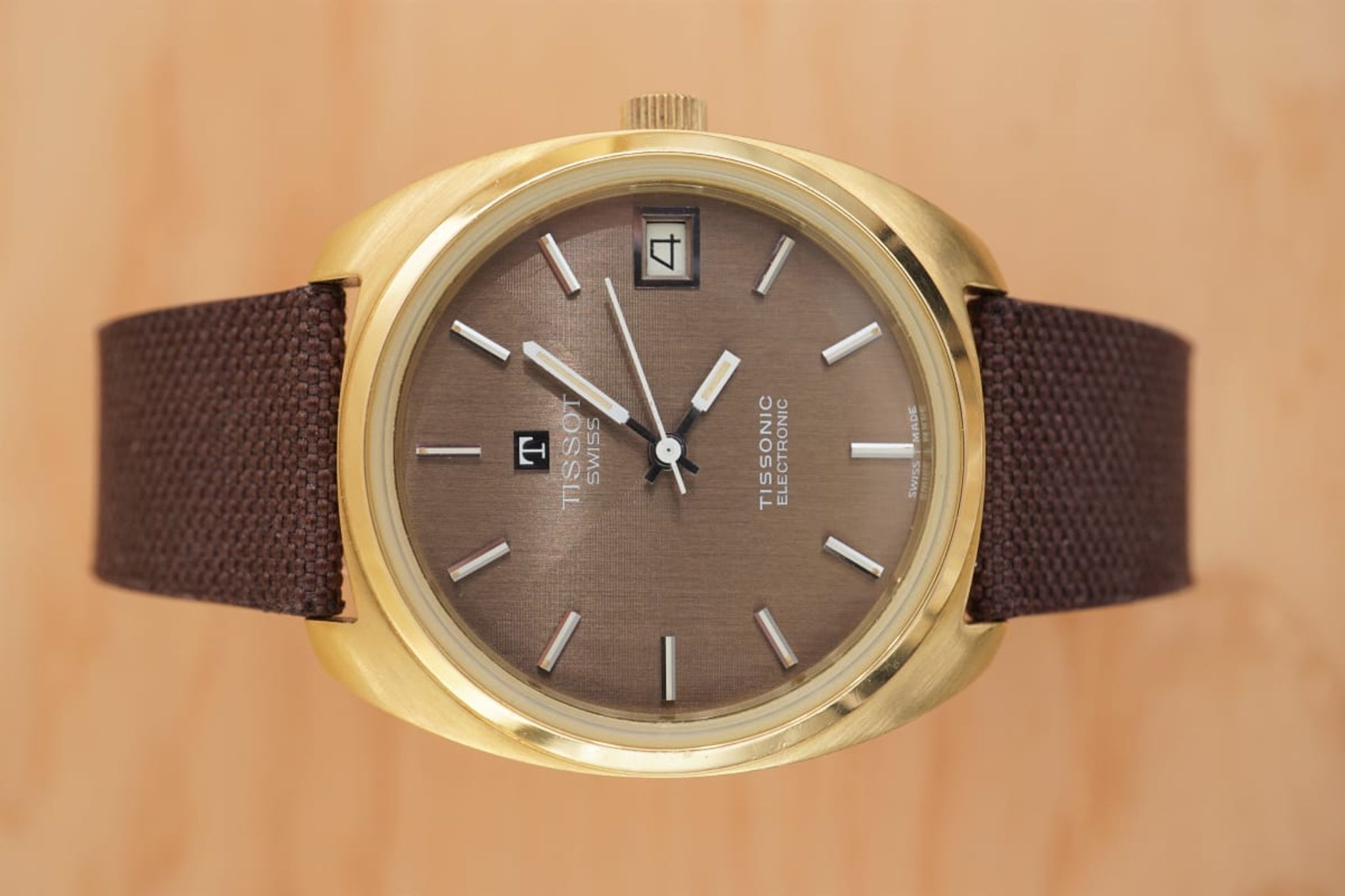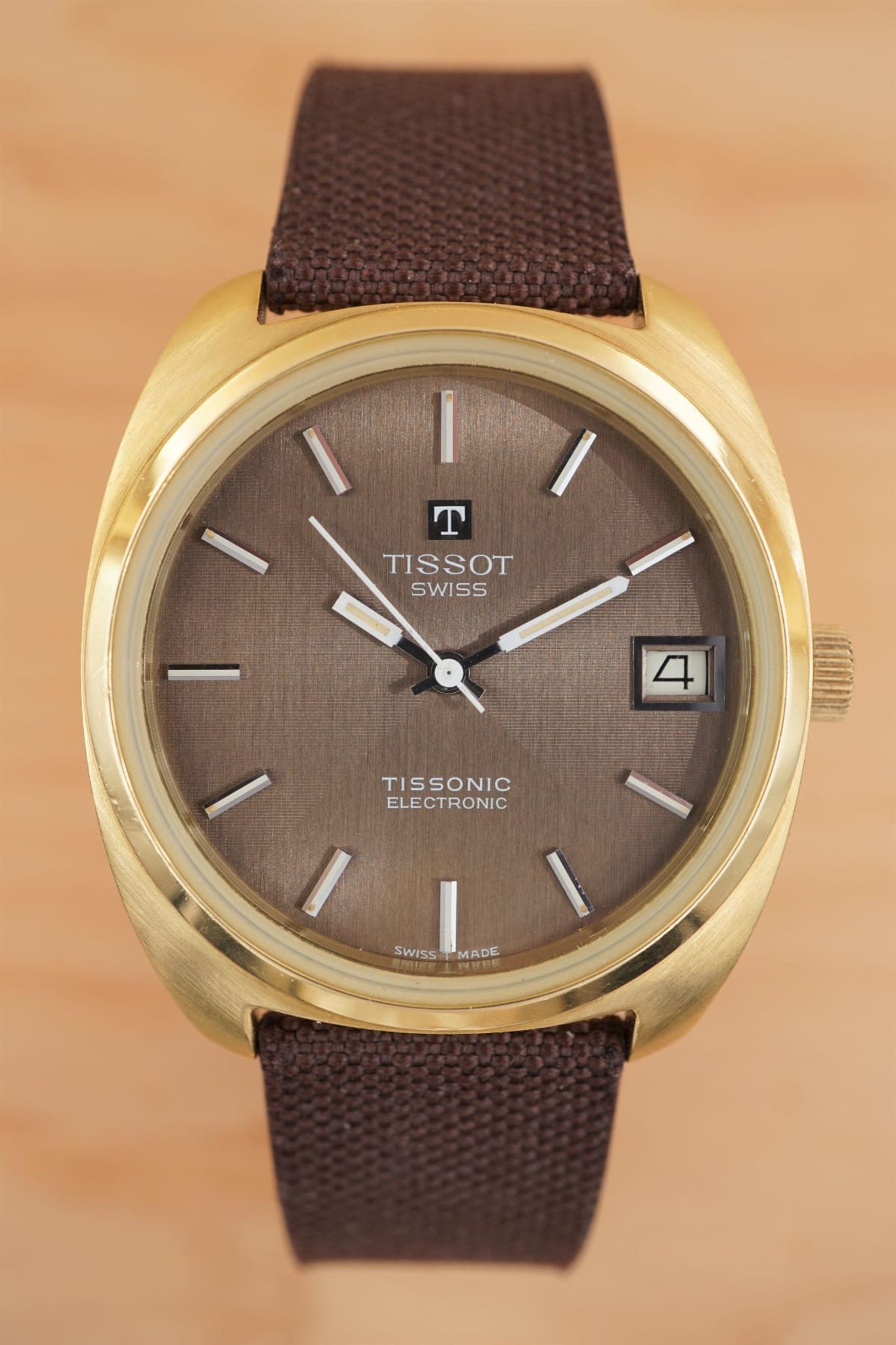 The dial is separated in four sectors, two finished horizontal and two vertical -- but very subtle and only visible in certain viewing angles. Beautiful. This dial finishing is repeated by the custom made linen strap that connects the heavy case to the gold plated Tissot buckle.