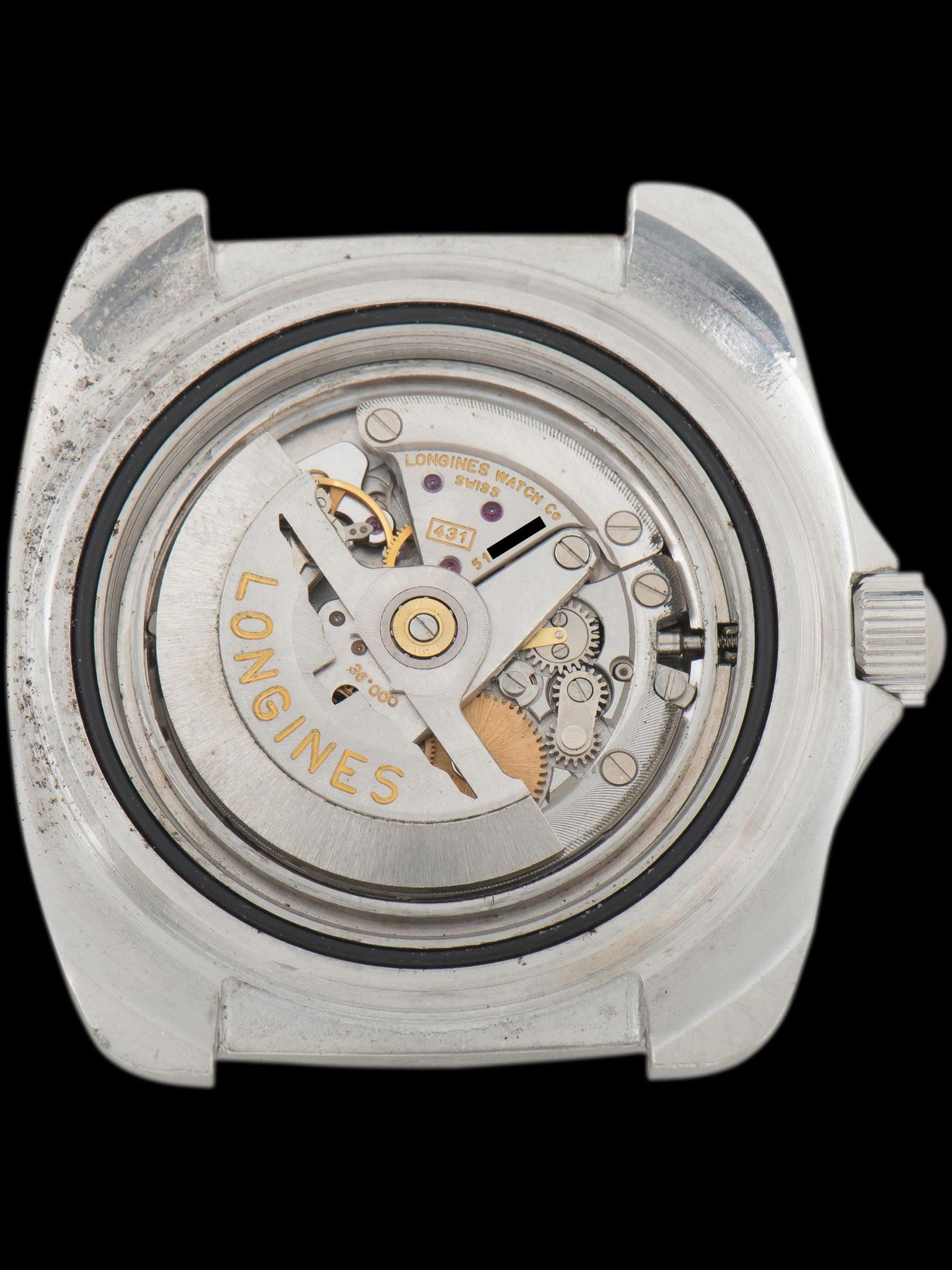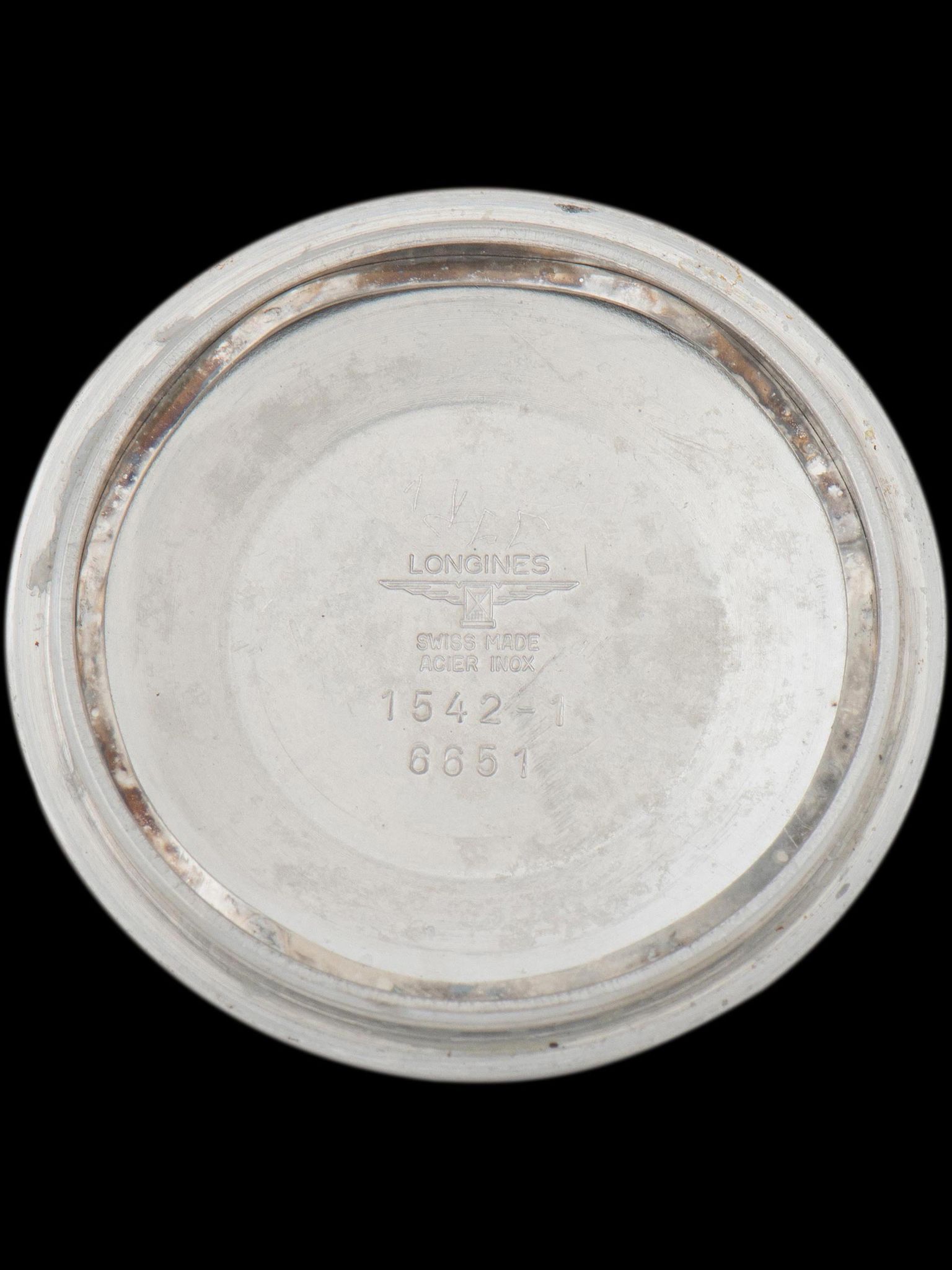 The case is believed to have been polished in the past but still shows full, sharp, symmetrical angles and curves with honest signs of use present. The bezel is in beautiful condition, though the numerals have lost some of their legibility over time. The unsigned crown is believed to be original to the watch. The case back shows light wear and tooling marks, especially on the non-crown side, as is expected for the watch's age. The watch comes supplied on its original flat-link stainless steel bracelet with Longines signed clasp.