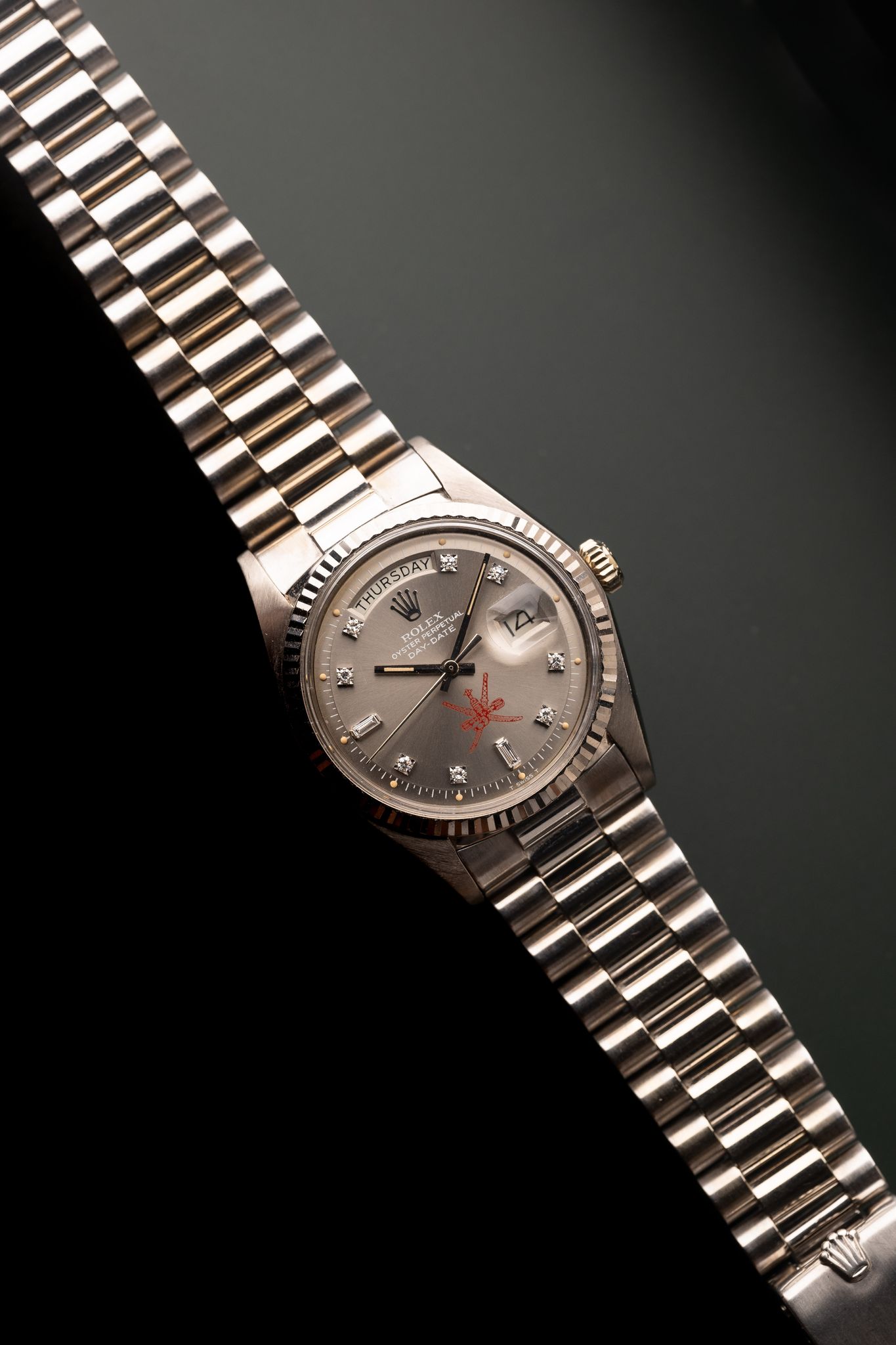 During the 70s and 80s, Omani royalty commissioned from Rolex watches worthy of royal degree. Blanks were sent to London’s Asprey Jewelers and, sanctioned by Rolex, stamped the with Omani national emblem: a khanjar flanked by two crossing swords. Kanjar stamped 18k White Gold Day-Dates are objects of subtlety. In innocence, they’re just another Day-Date…just not any Day-Date. A seemingly simple watch, an arranged marriage between humility and thoroughbred heritage.
