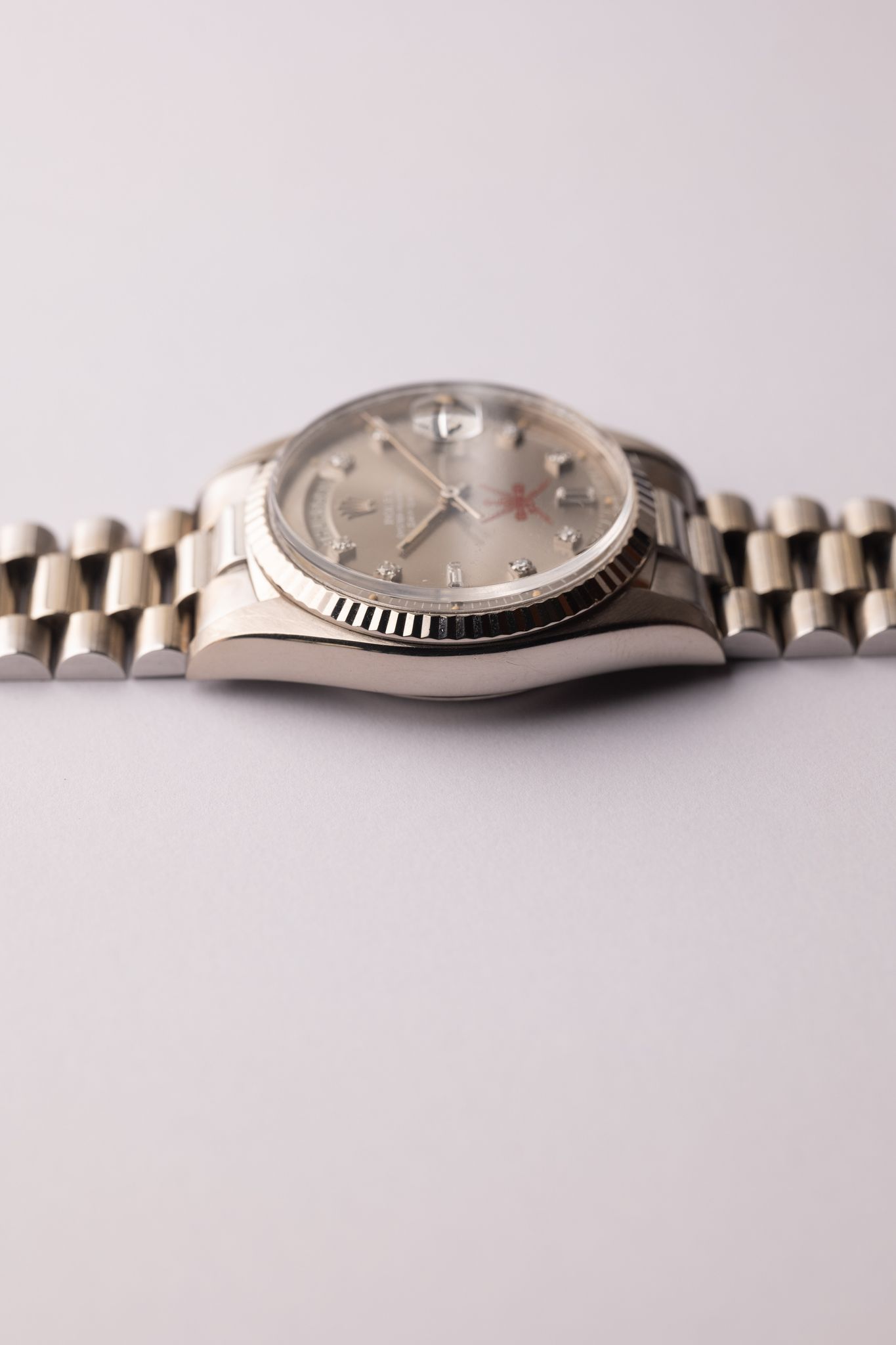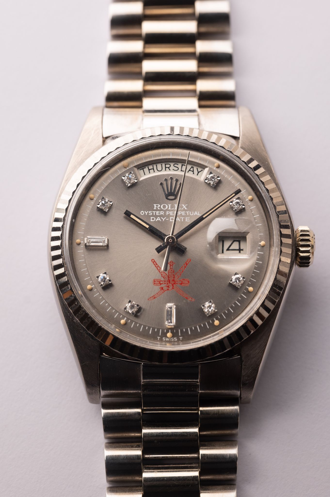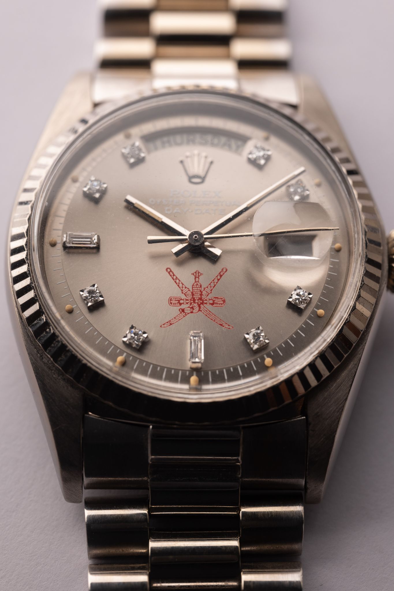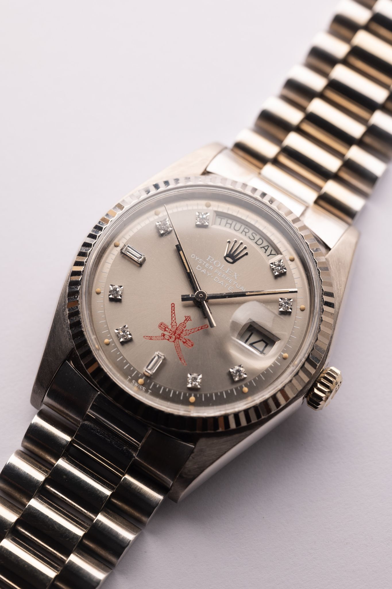 Our 1974 1803 White Gold ‘Khanjar’ Day-Date bears the national emblem of Oman. A reddened, bloodied, dagger stamped into white gold.