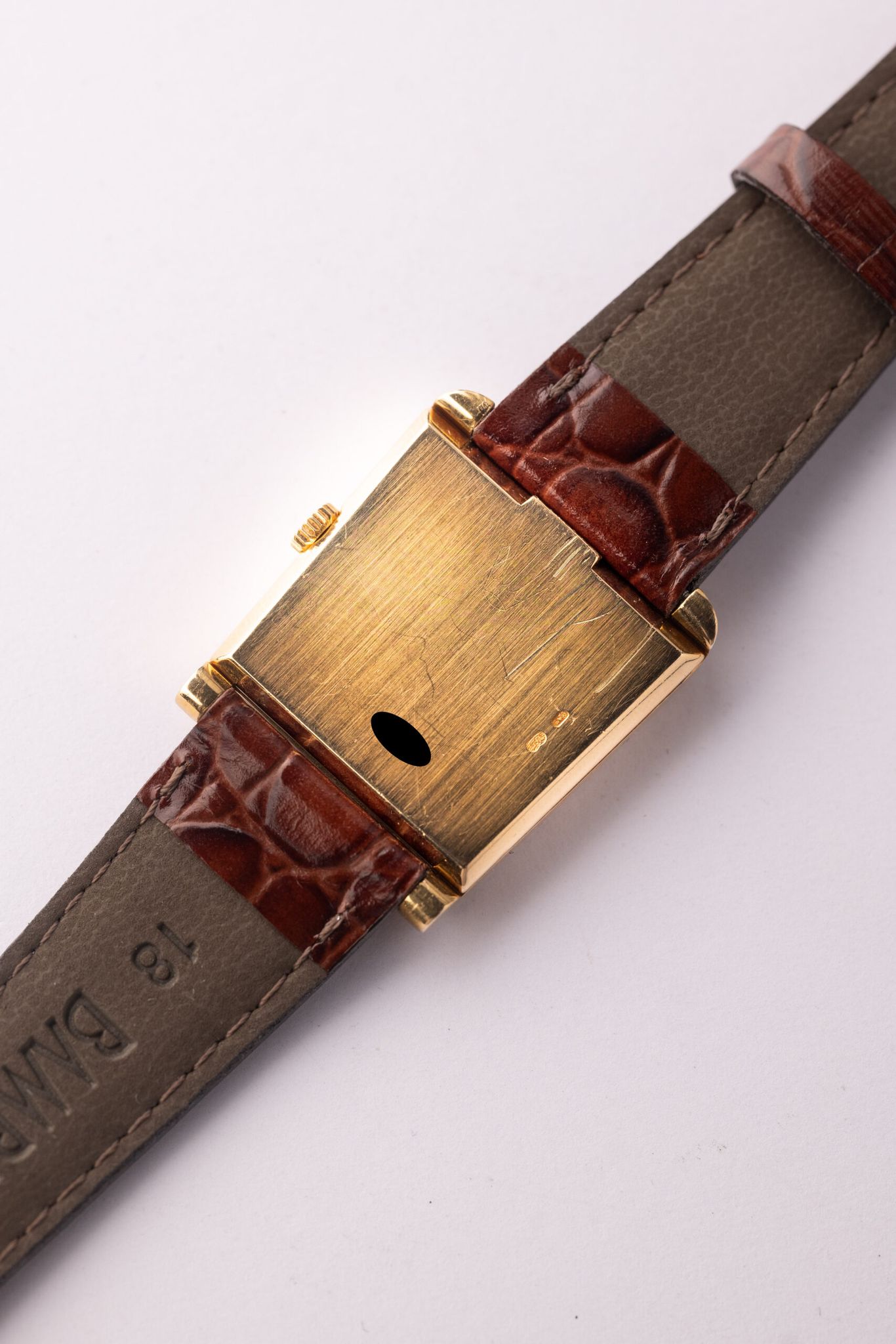 An unusual trapezoid case shape measuring 28x25mm. 18kt Gold on beautiful leather band.