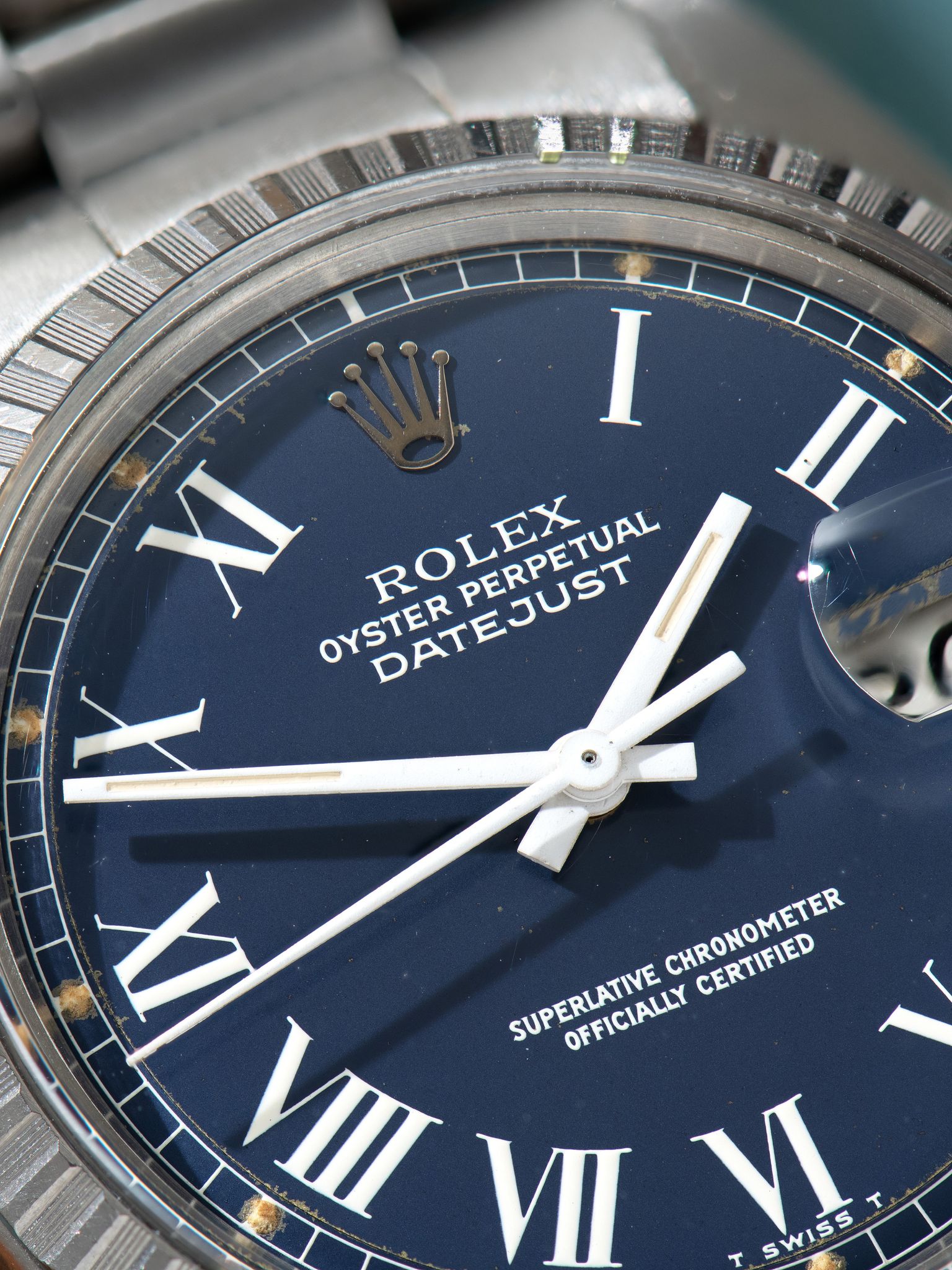 Worn with ease in any setting, this incredibly cool, sought-after, and rarely seen blue "Buckley" dial stands out from your typical Datejust. Featuring a satin blue dial with white painted Roman numerals and matching white enamel hands, a combination that pops in all the right ways. The Datejust is a classic for a reason. We love the early Rolex Datejust for its simplicity and understated sophistication.