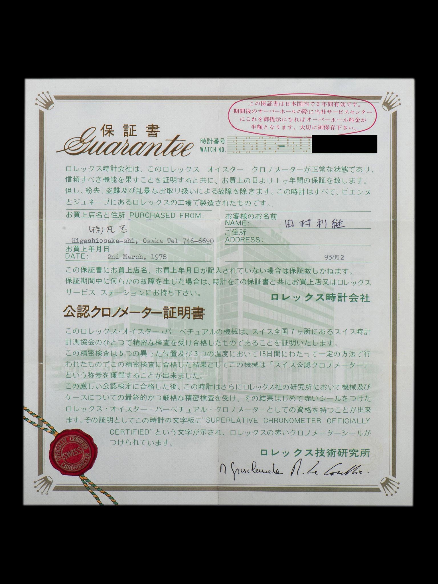 The watch comes as a complete set with its original inner and outer boxes, Rolex guarantee paper, booklets, and hangtags. The watch is keeping time, service history is unknown. A movement service can be provided upon request.
