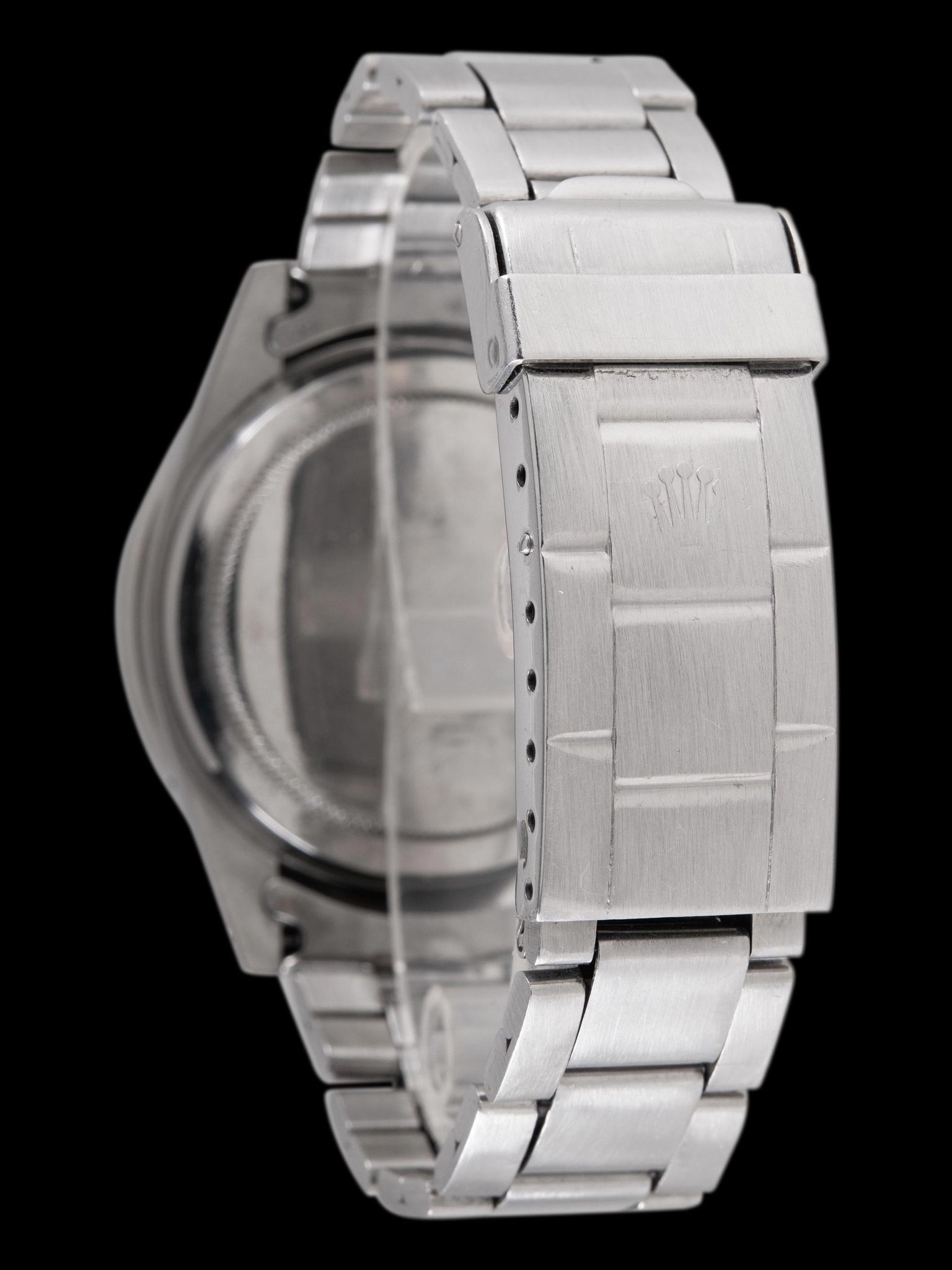 The excellent case retains symmetrical and full lugs that have seen gentle polishing in the past and retain prominent chamfers while exhibiting honest signs of previous use. The original Mk. III "fat font" bezel insert features an attractive, yet subtle fade to a navy blue/dark grey color, and shows light signs of use, namely the original tritium pearl is mostly present though the top portion is missing. The original Rolex 9315 folded-link Oyster bracelet with 380 end pieces retains 11 links that show light stretch for the style and age of the bracelet and will fit up to a 7 3/4-inch wrist.