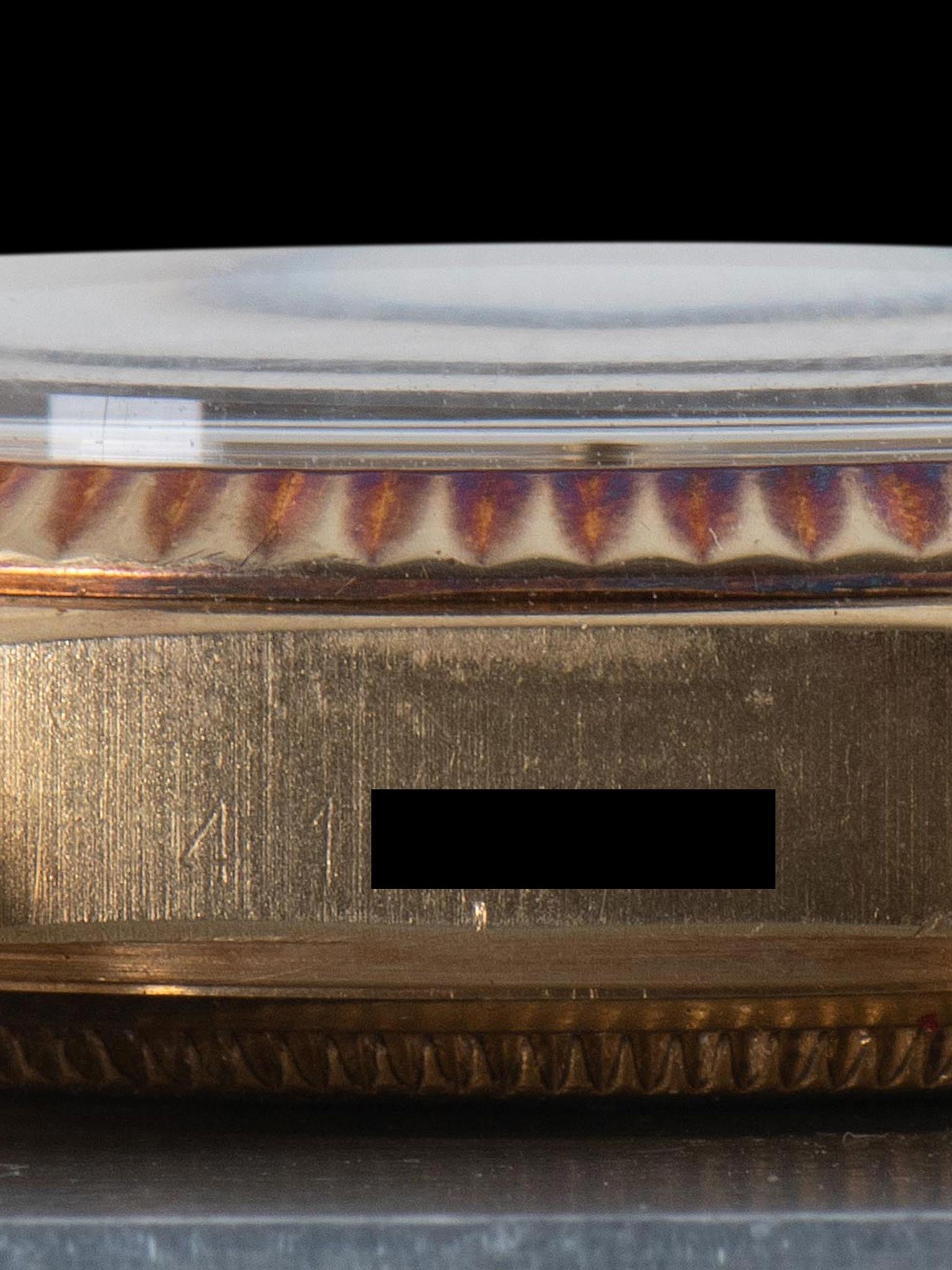 The original deep black Onyx stone dial is simply incredible with no cracks present whatsoever. The solid yellow gold hands are in excellent condition. The metallic gold date wheel is original with "open" 6's and 9's.