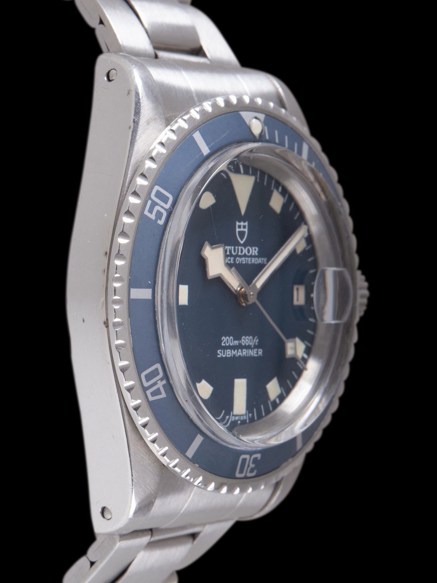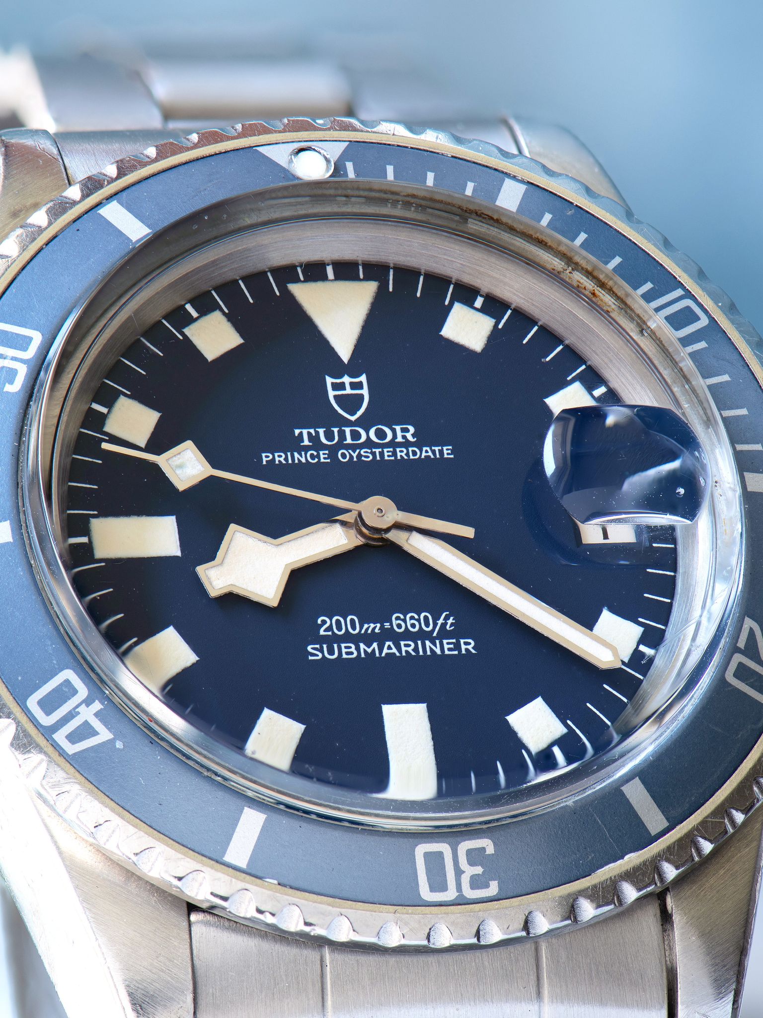 The original blue "snowflake" dial is in exceptional condition with the only element of age being some minor clipping at the edge of the white paint for the minute track, which is commonly seen in this era and mostly invisible to the naked eye. The tritium lume plots have achieved a charming creamy patina and display no degradation when inspected under UV light. The original tritium hands match the dial perfectly, under UV light inspection the minute hand exhibits a small repair to the lume and retains most of its original tritium while the hour and minute hands remain fully intact.