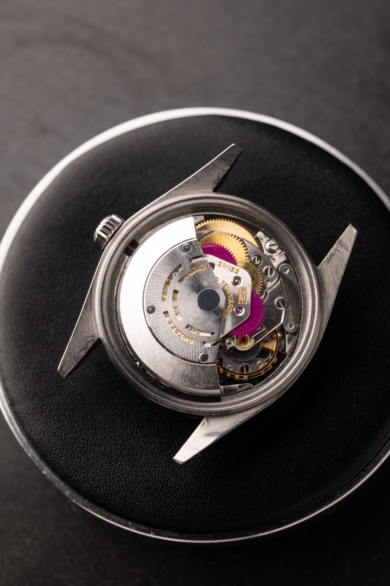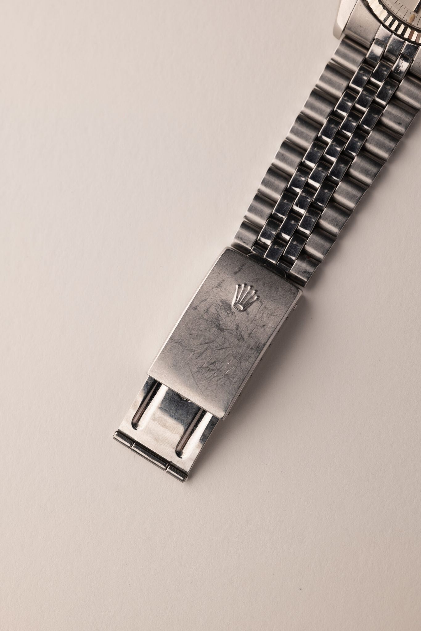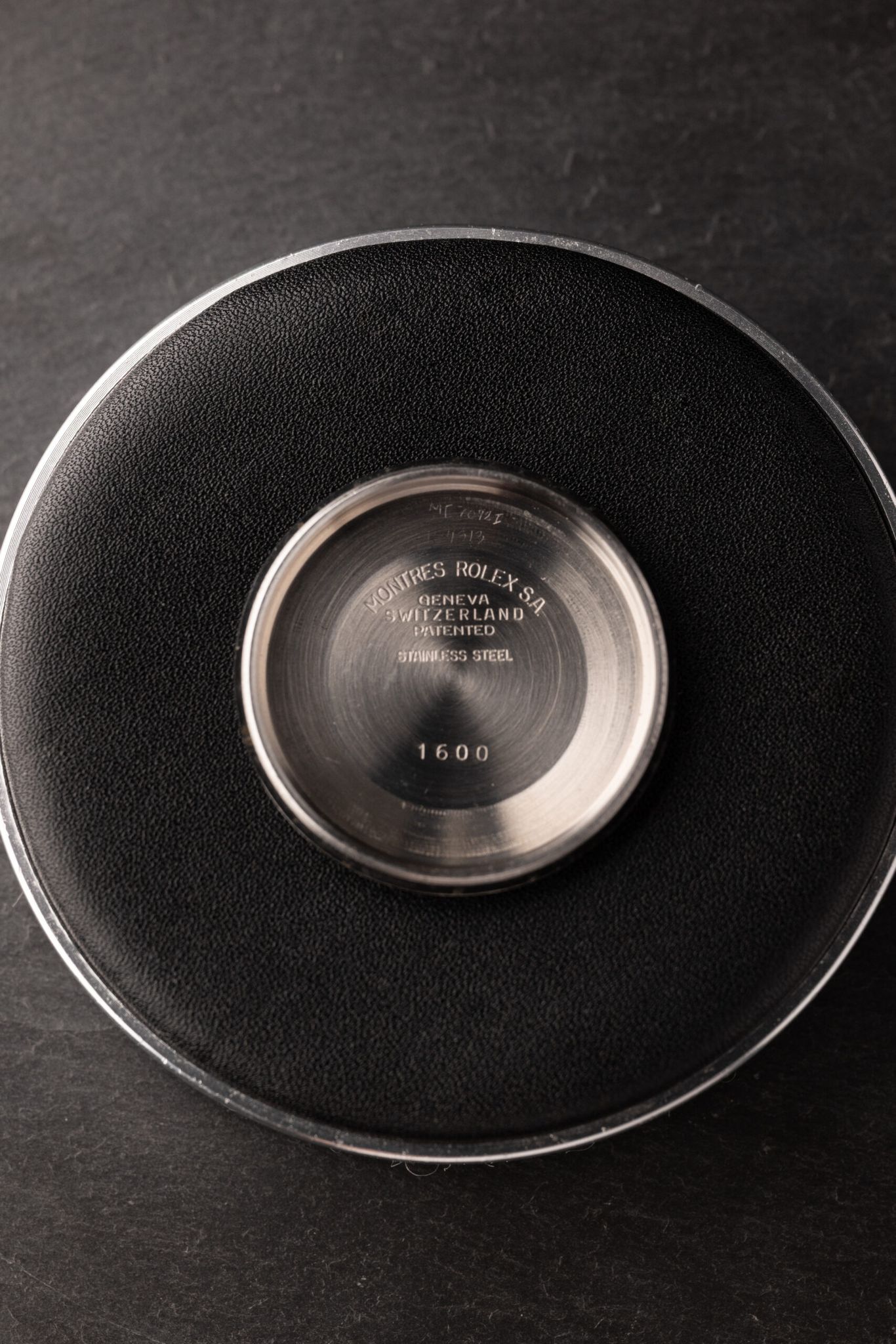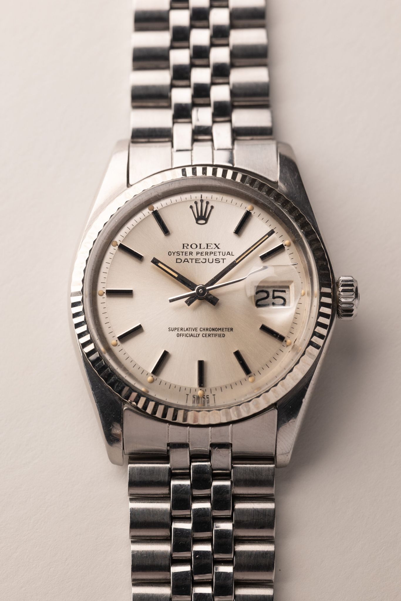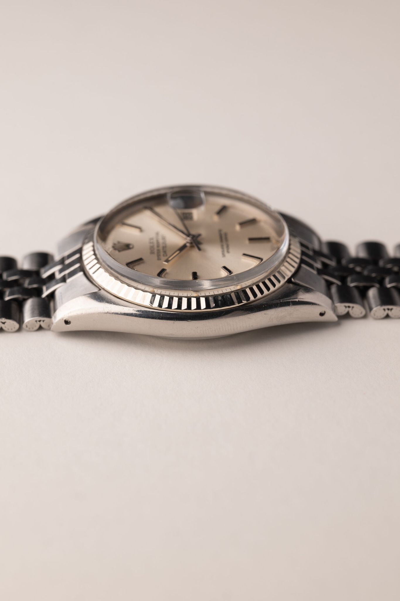 The silver dial’s are the most common of the 160X series of Datejusts. However, not many people know there are very many different types of silver dials. Some are circularly brushed, others vertically. Some have wide indices, others skinny stick or claw markers. In this 1601, the dial markers are black paint, which contrasts uniquely on this type of dial. Lume plots are stunningly yellow as well. Case is very very fat and sharp and appears near unpolished. The bracelet is a newer Jubilee and matches the aesthetic of the white gold fluted bezel. The early four digit Datejusts also have a unique dial that is called a pie-pan dial. These have a step towards the outer edge and give the watch tremendous depth. This one is a 10/10.