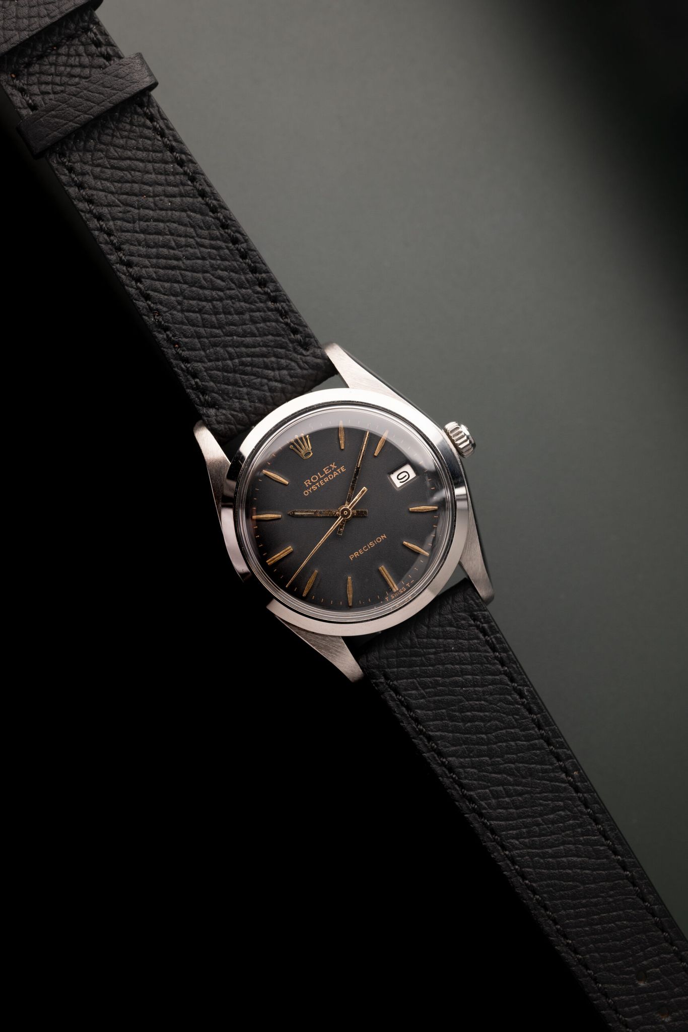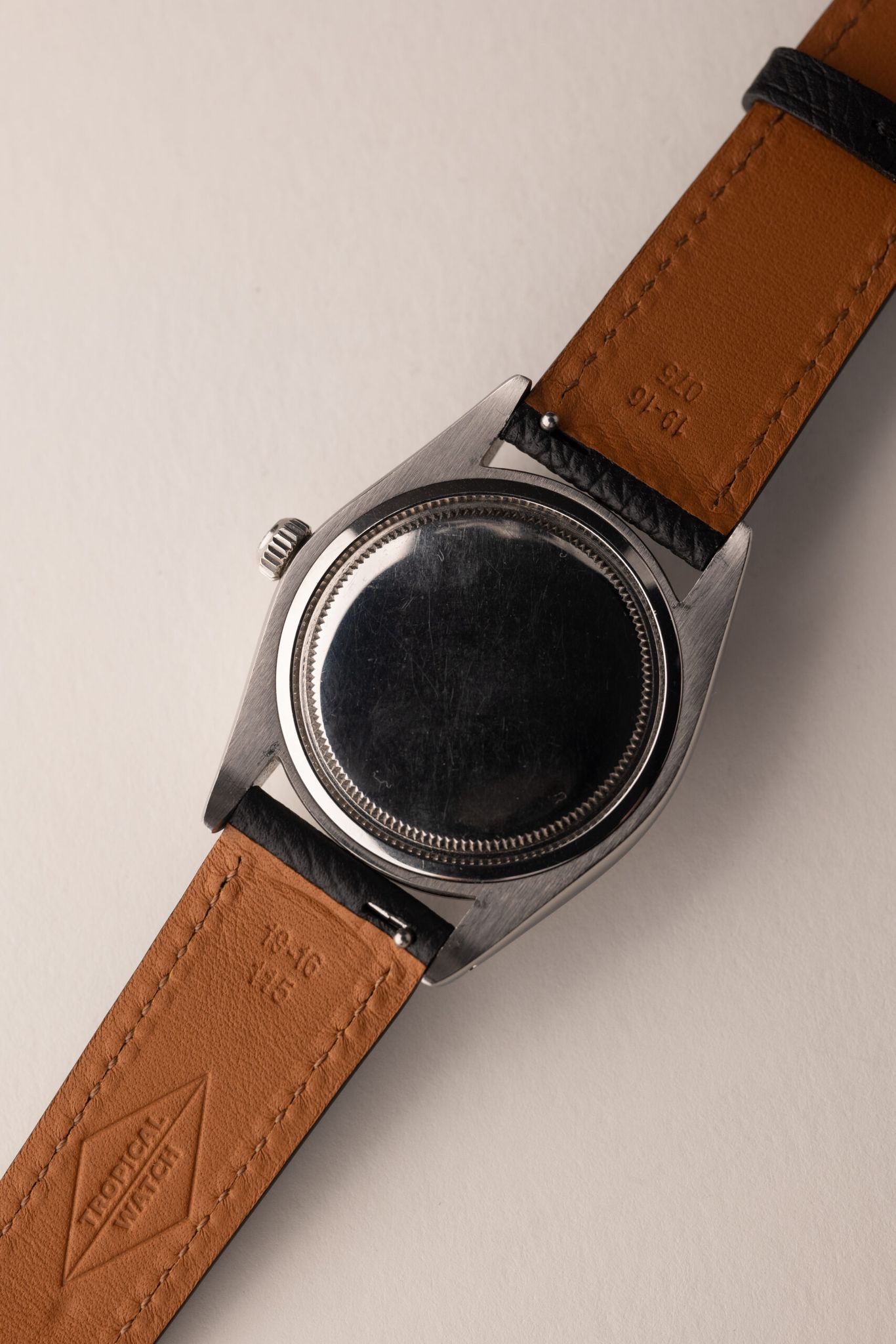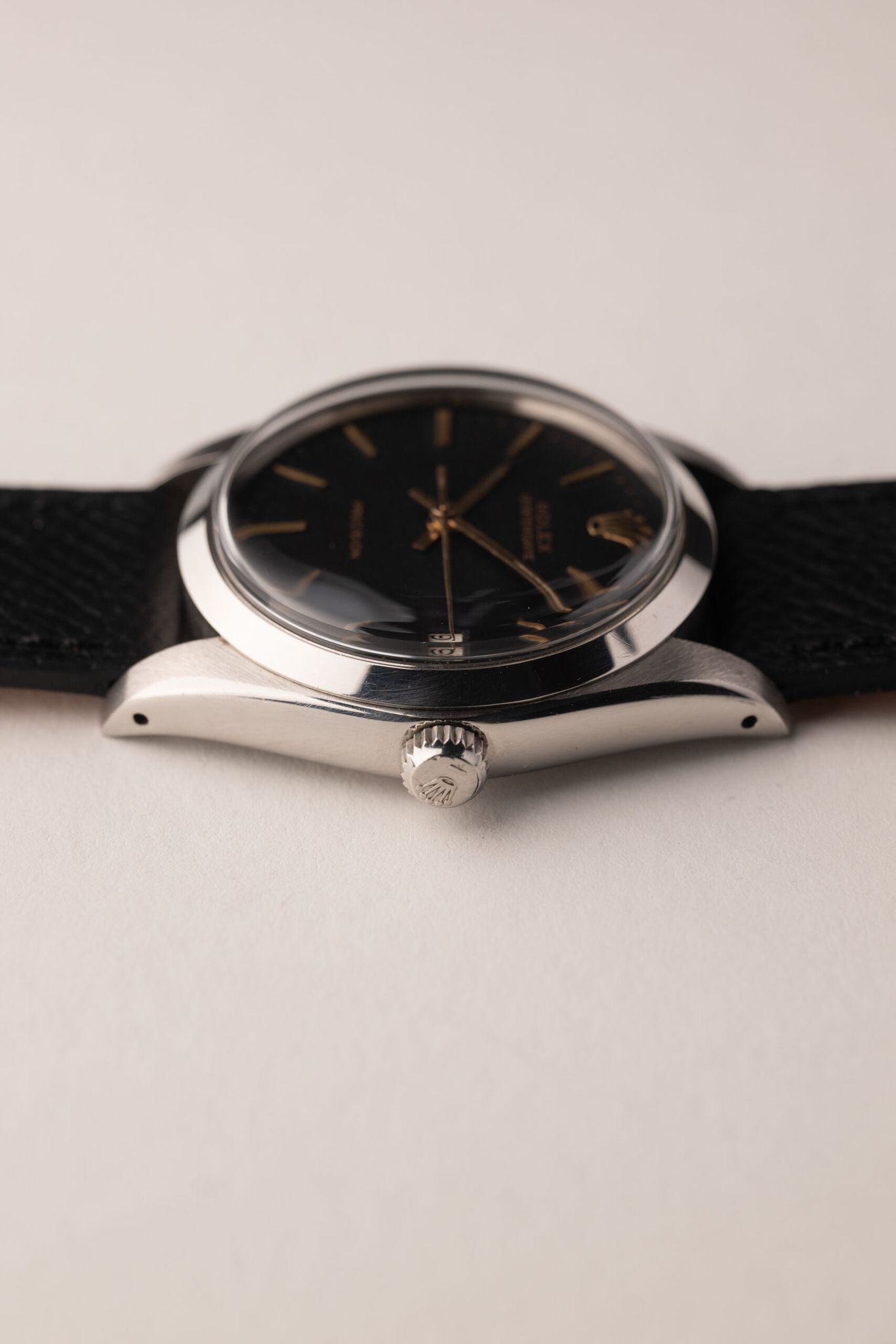 No frills, black dial 6694, mechanical movement Oyster Perpetual on leather strap. It doesn’t get simpler than this.