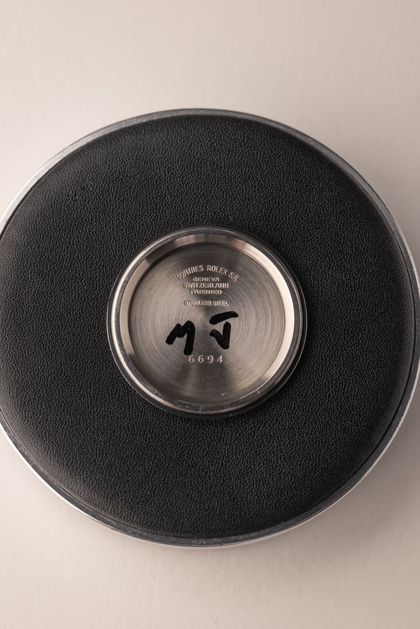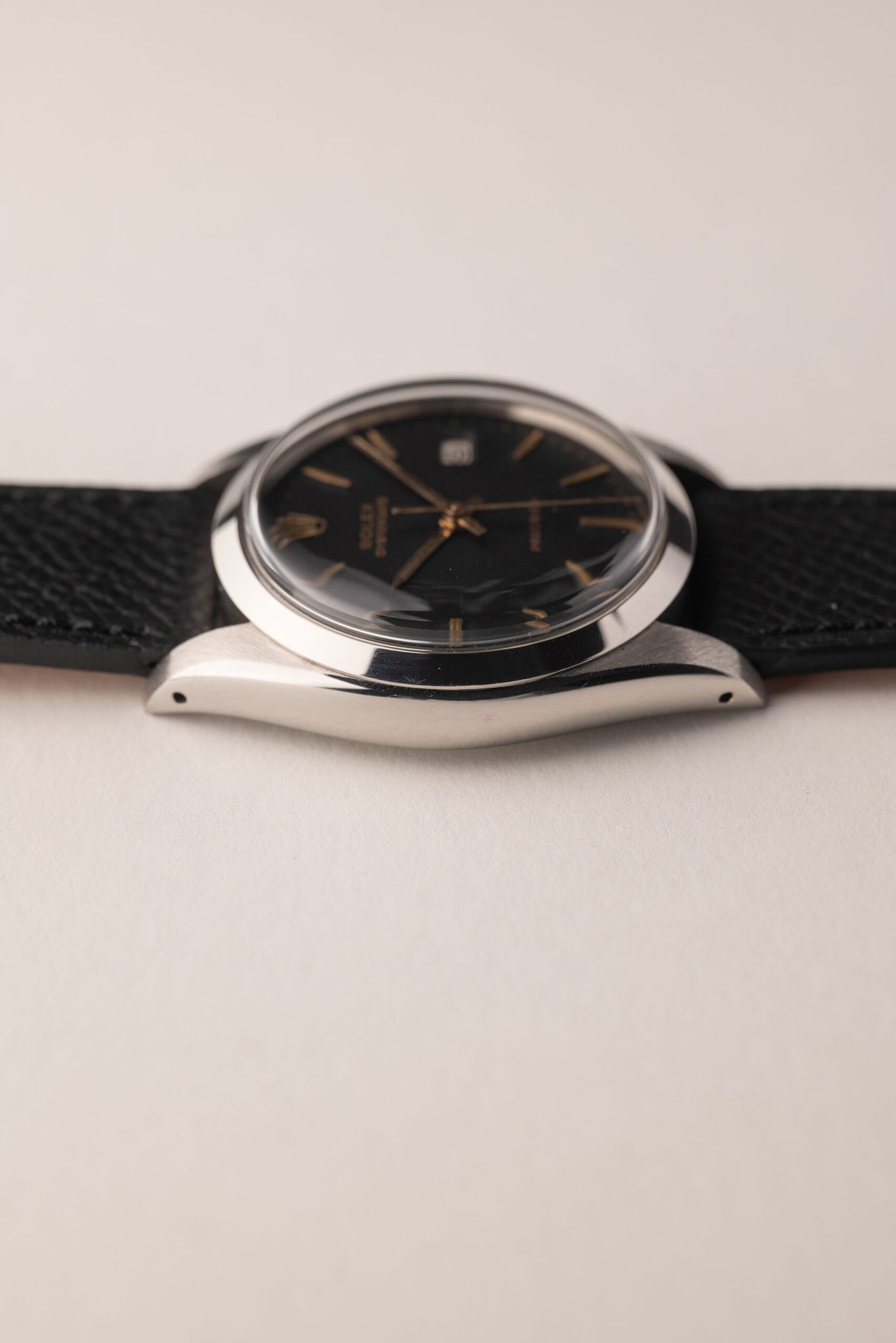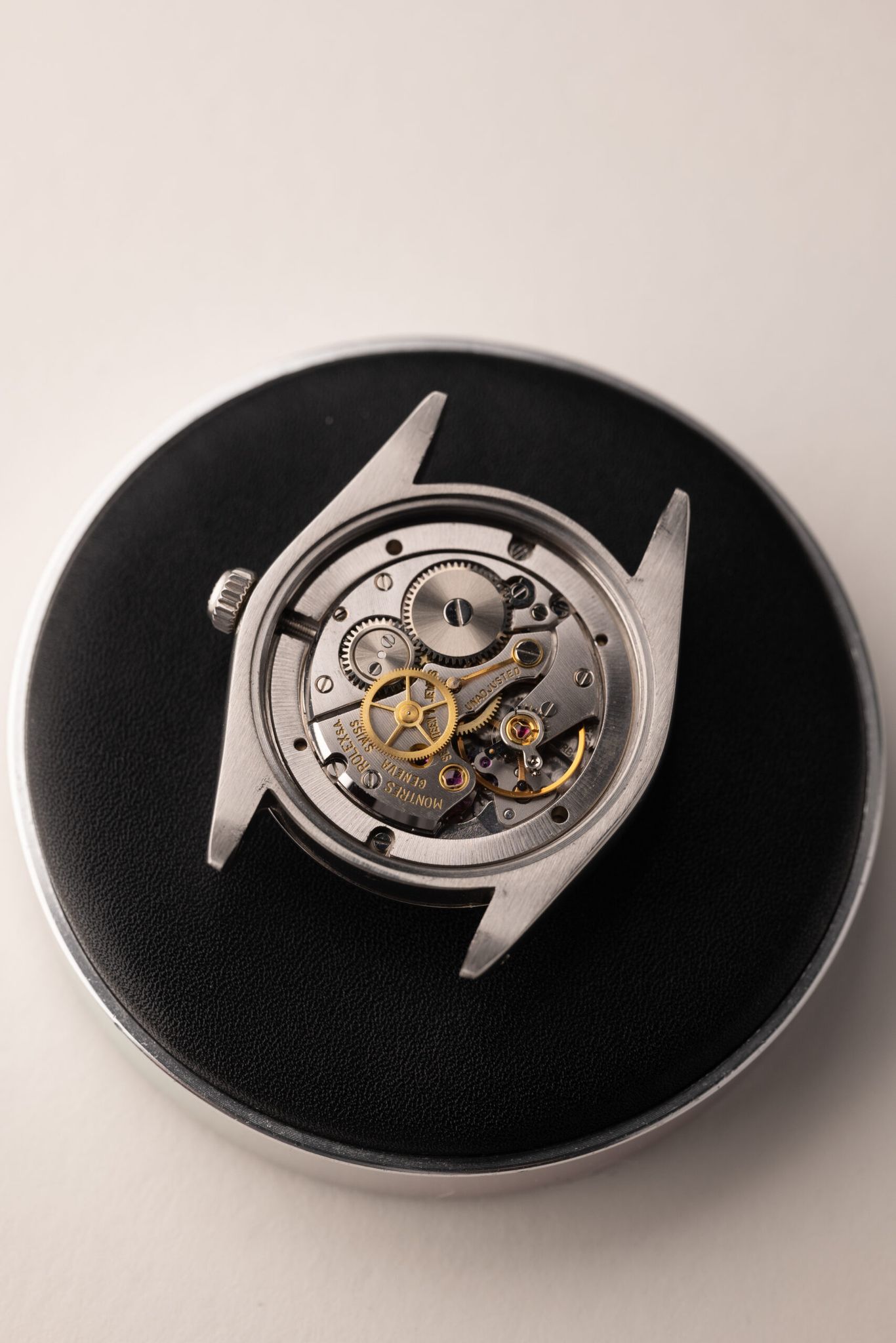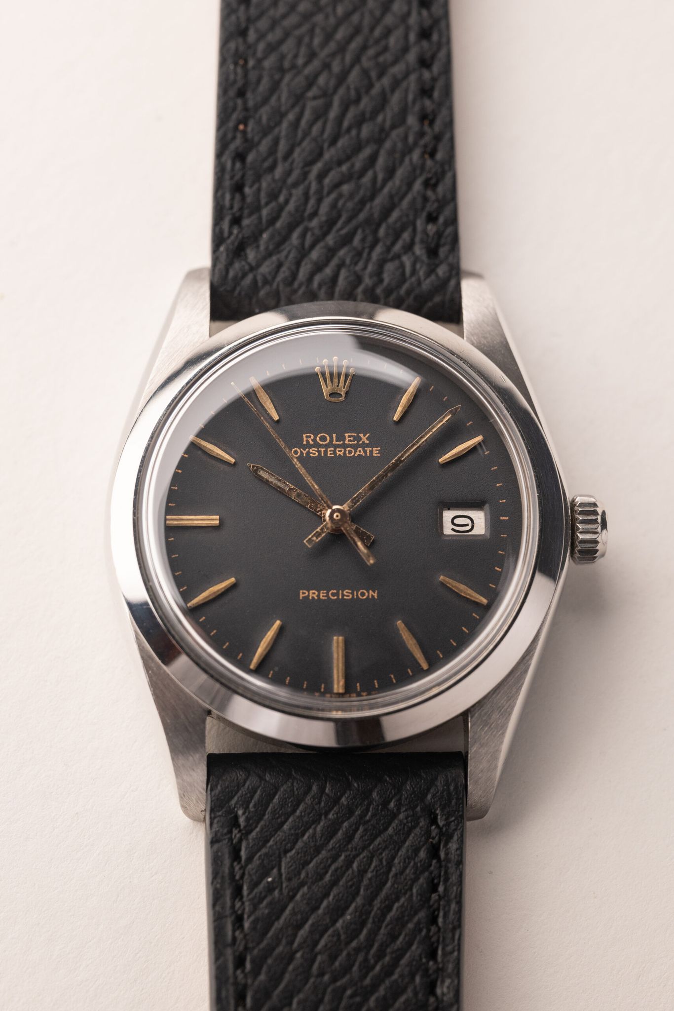 No frills, black dial 6694, mechanical movement Oyster Perpetual on leather strap. It doesn’t get simpler than this.