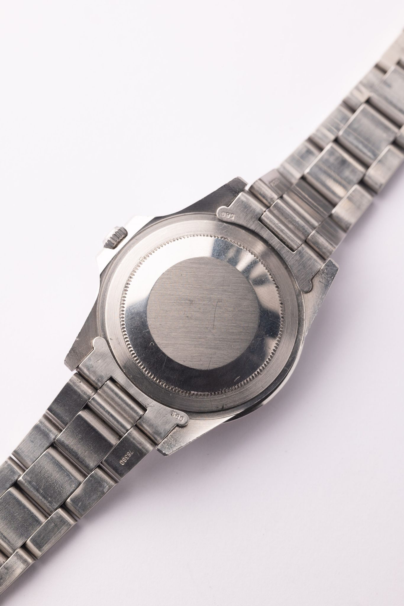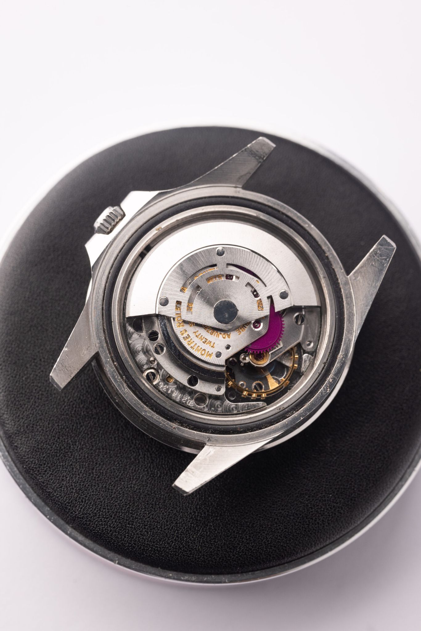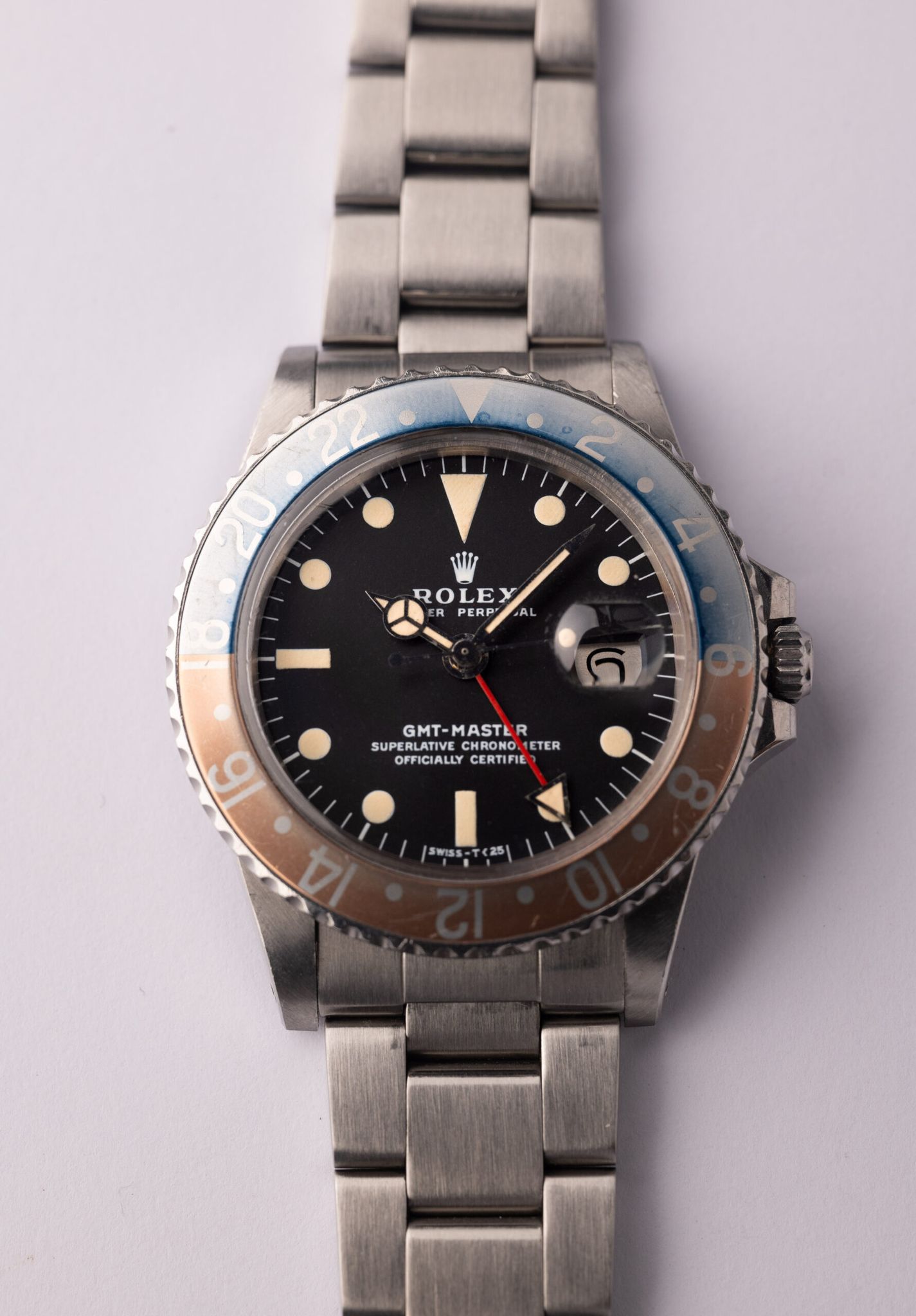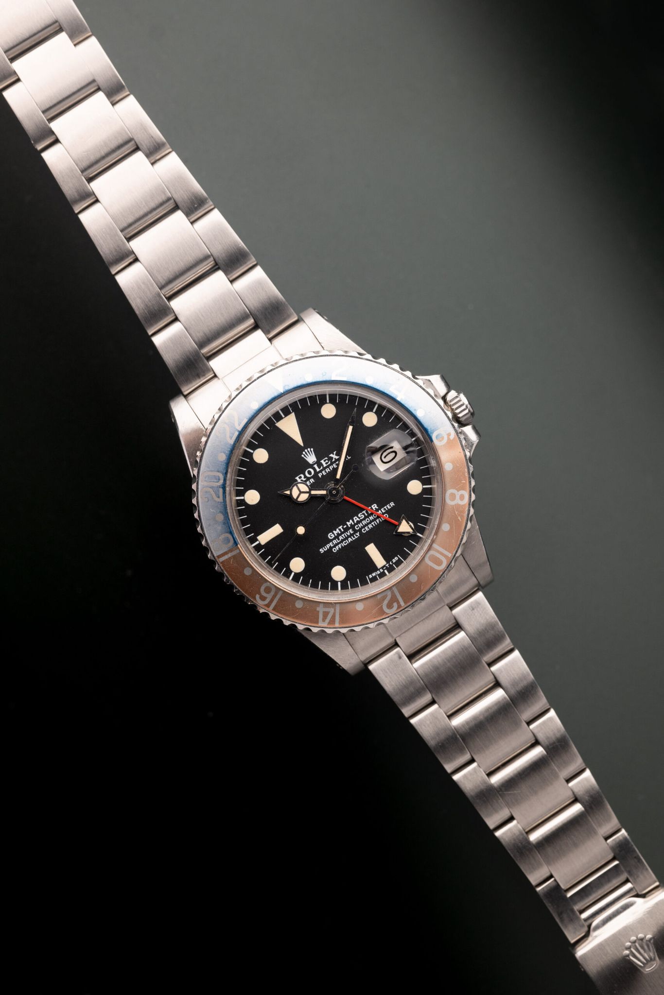 Rolex Pepsi GMT with MK2 dial. The MK2 1675 is characterized by a fat L in “Rolex” This chunkier font leads to a pleasing contrast when coupled with the saturated lume plots. The previously polished case is also exceptional on this GMT given the look of the chamfers on the lugs.