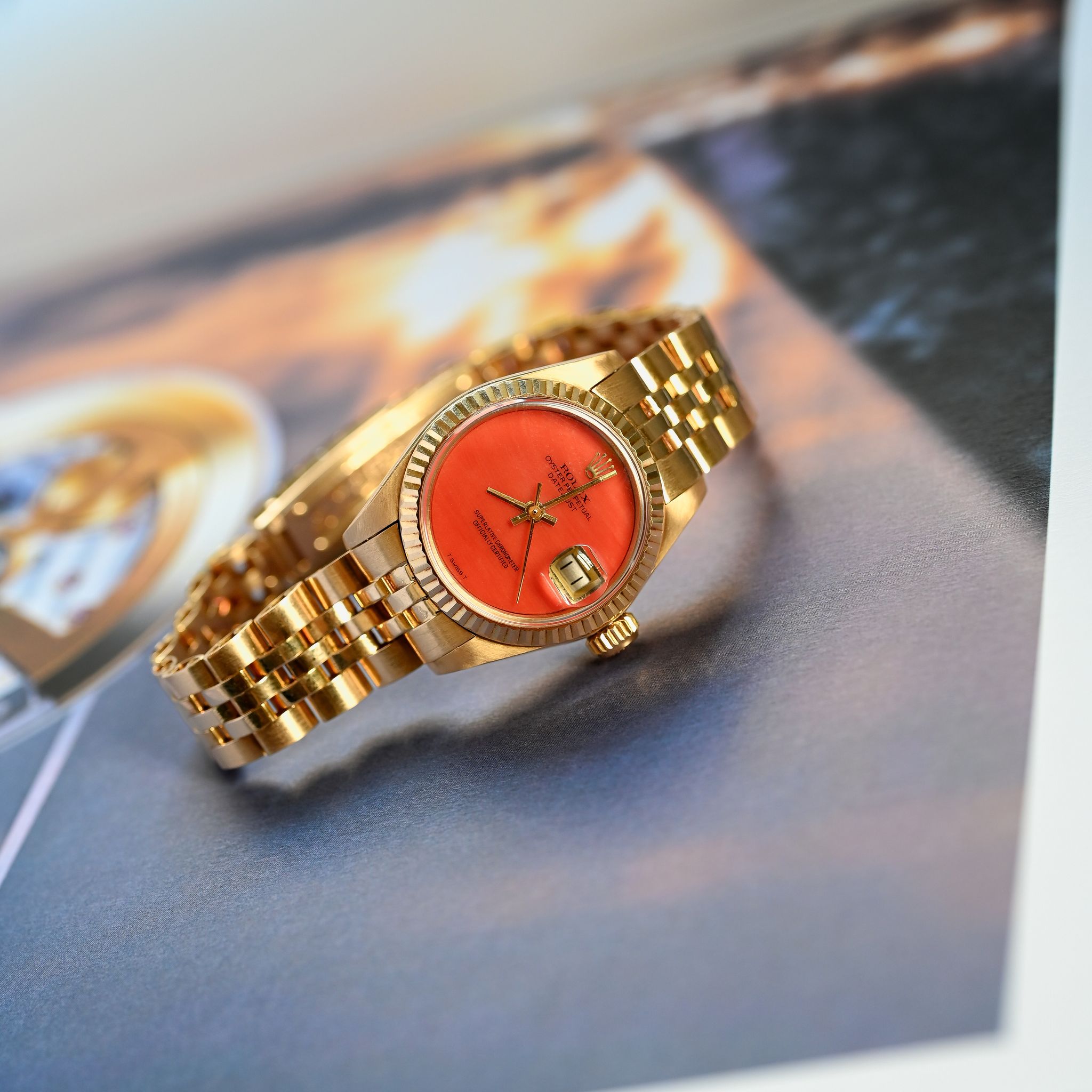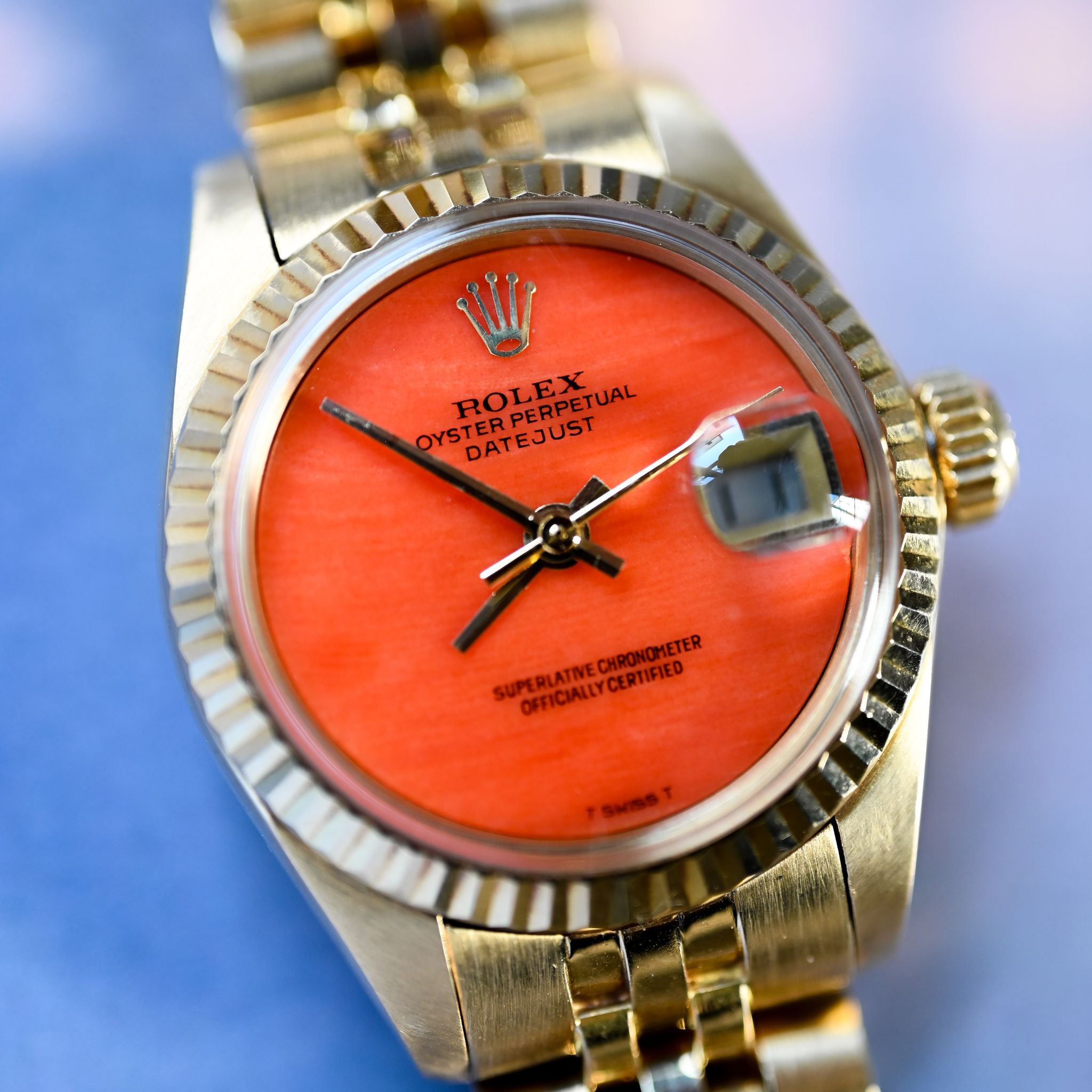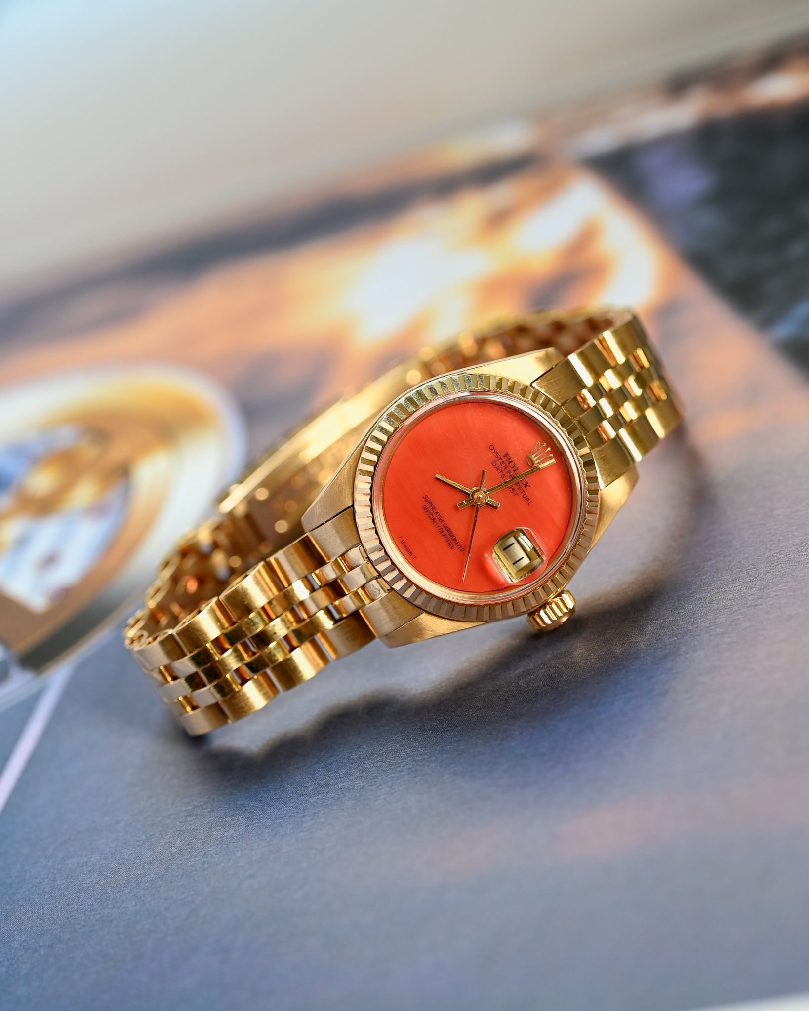 This 1978 model features a rare **Coral** dial, manufactured by Stern Frères in the early 1970s using a new ultrasonic cutting technique. With its woodgrain-like texture and bright orange hue, this stone dial offers depth and a unique contrast to the yellow gold case.