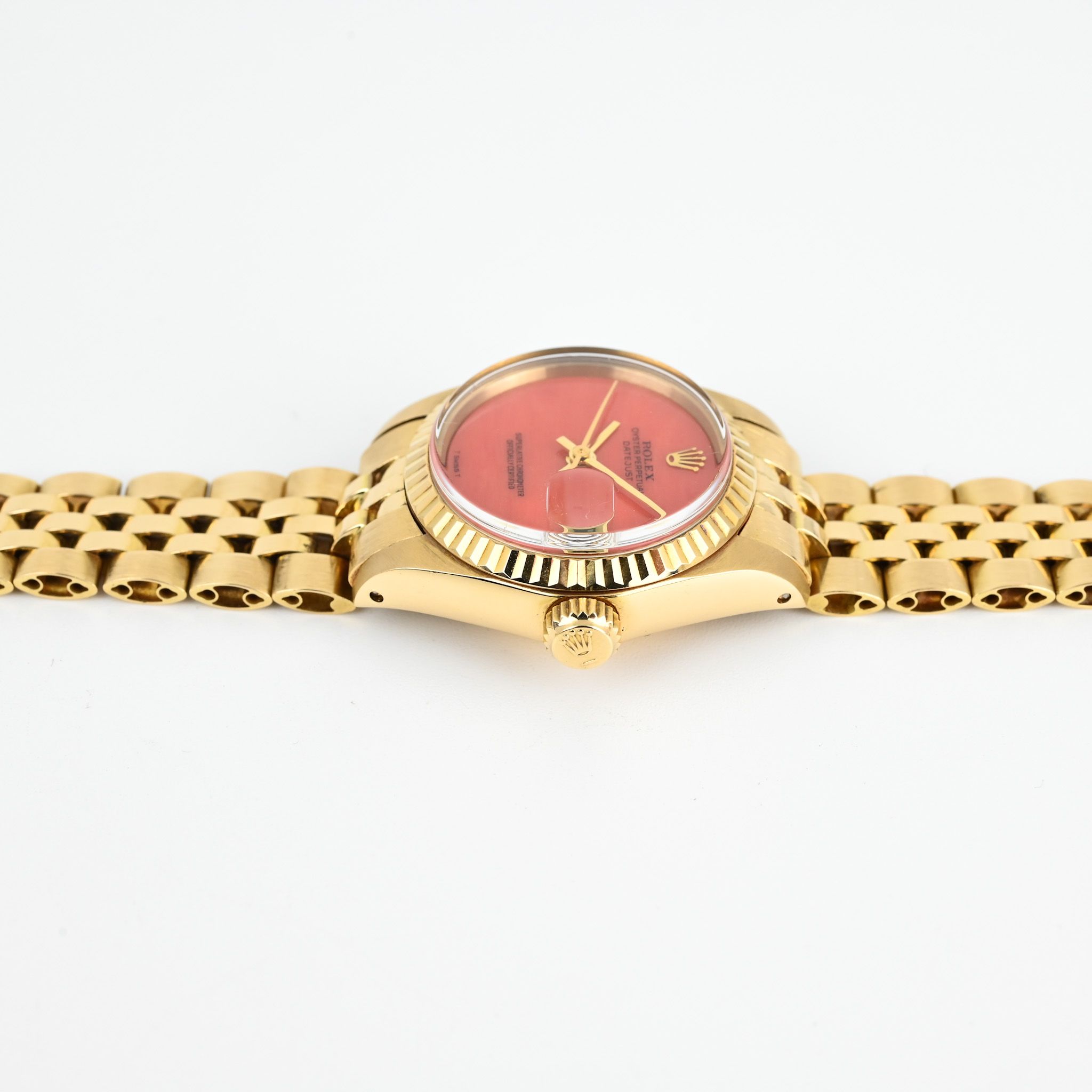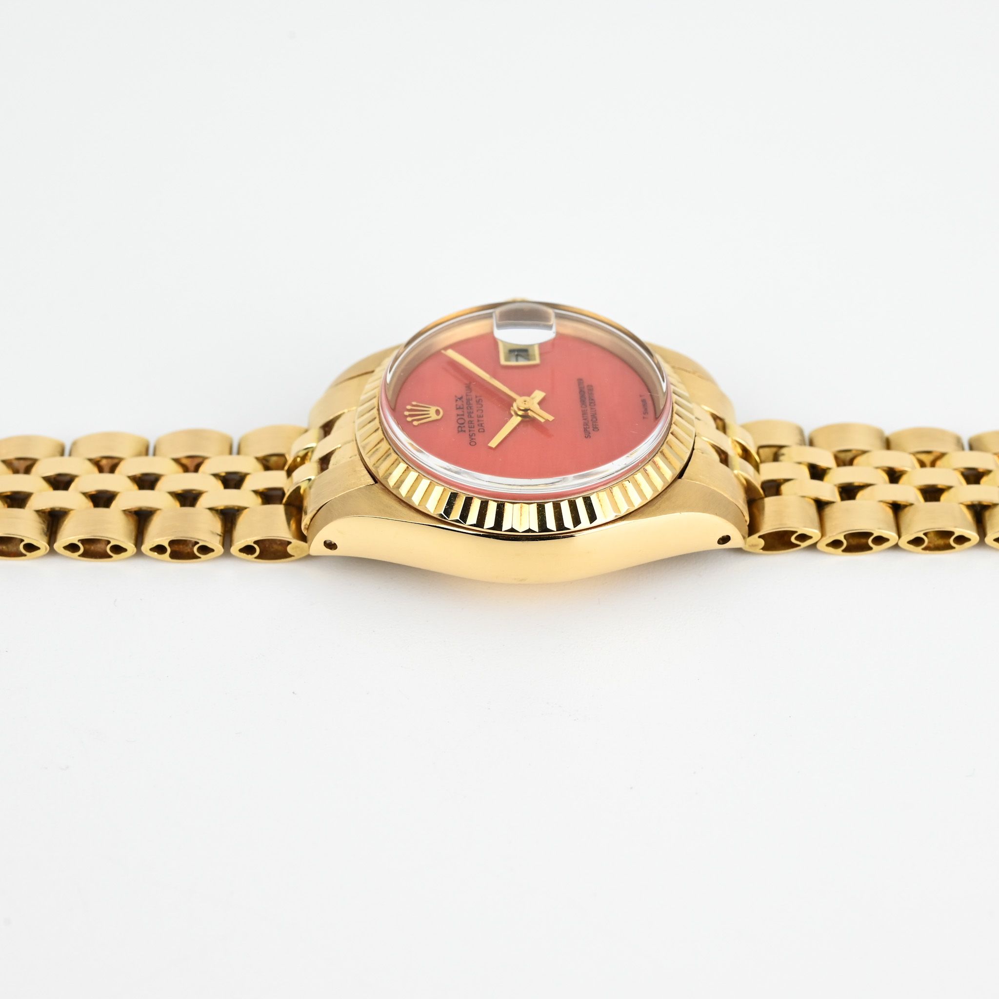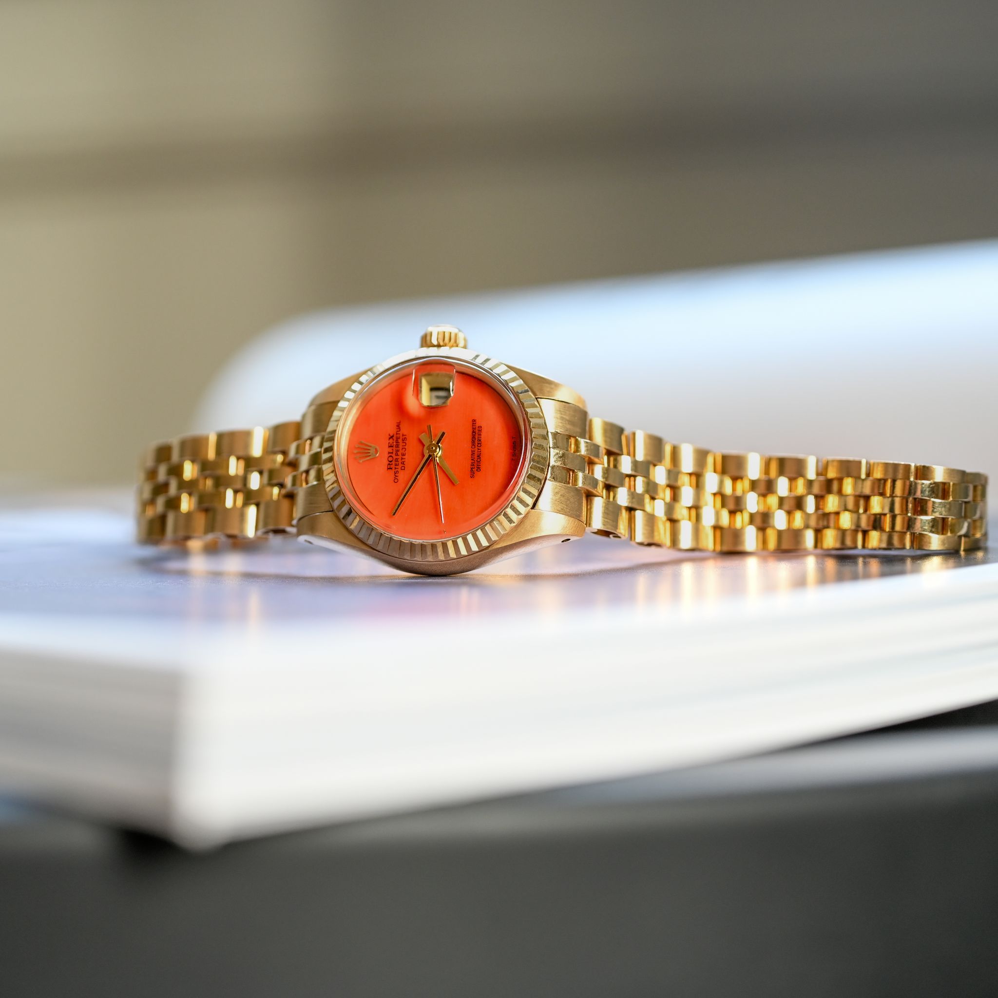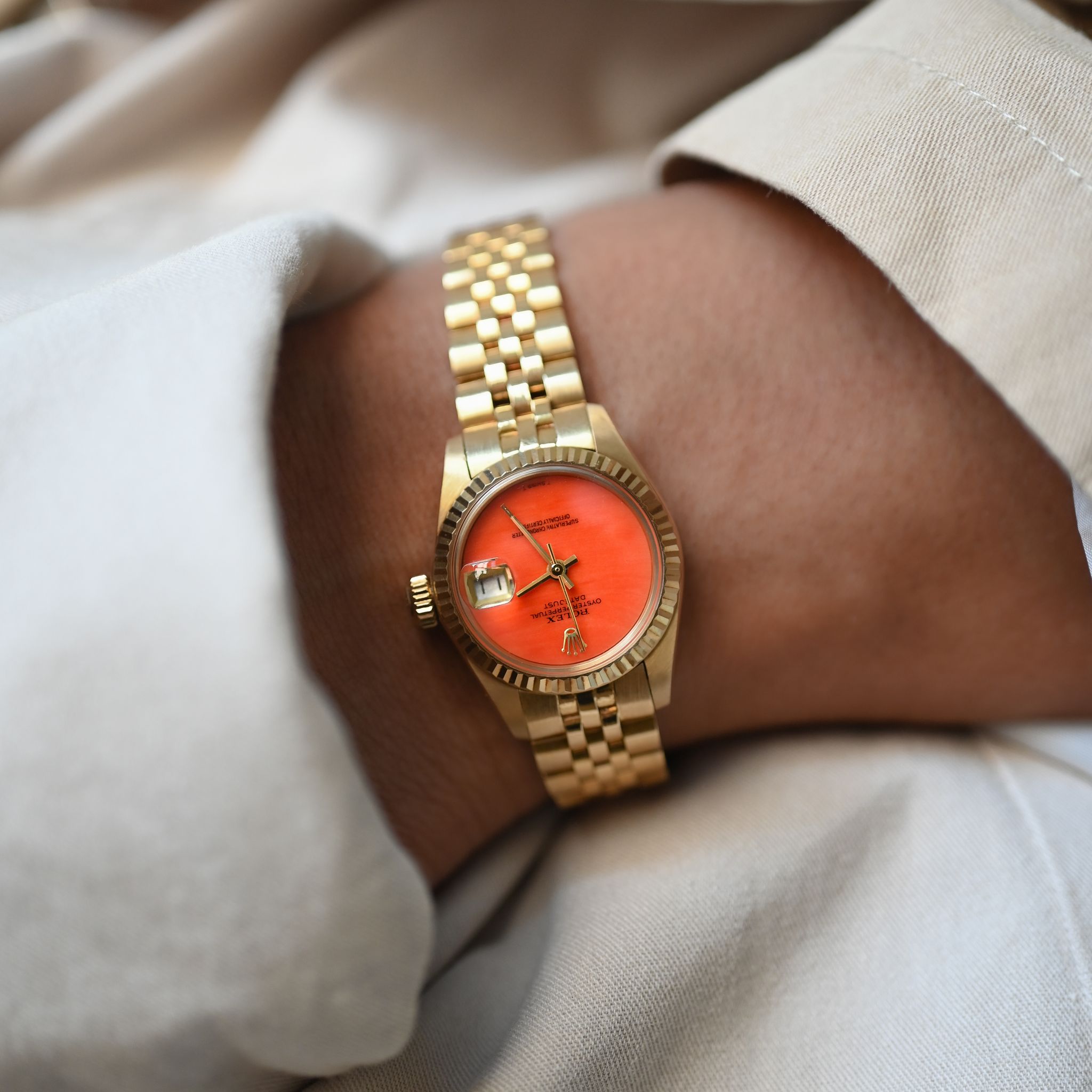This 1978 model features a rare **Coral** dial, manufactured by Stern Frères in the early 1970s using a new ultrasonic cutting technique. With its woodgrain-like texture and bright orange hue, this stone dial offers depth and a unique contrast to the yellow gold case.