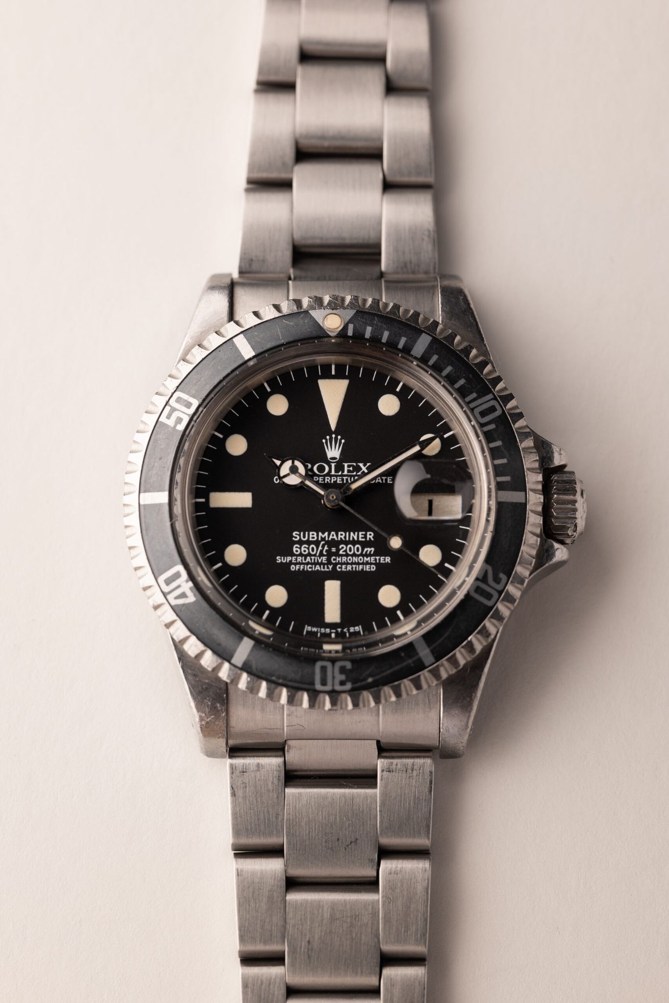 This is a super clean example of a near unpolished 1680 with a Mk. I dial. The lume color on the dial is a light yellow tritium and matches the faded ghost insert.