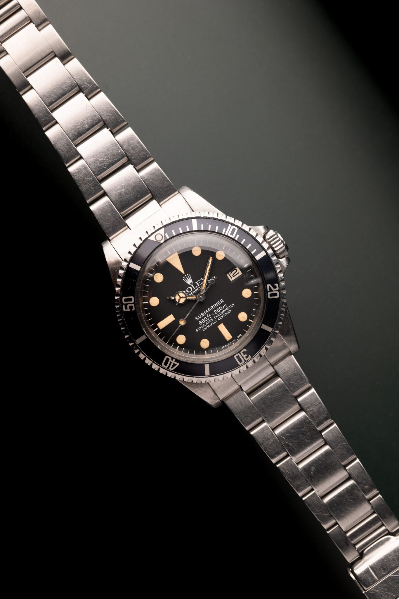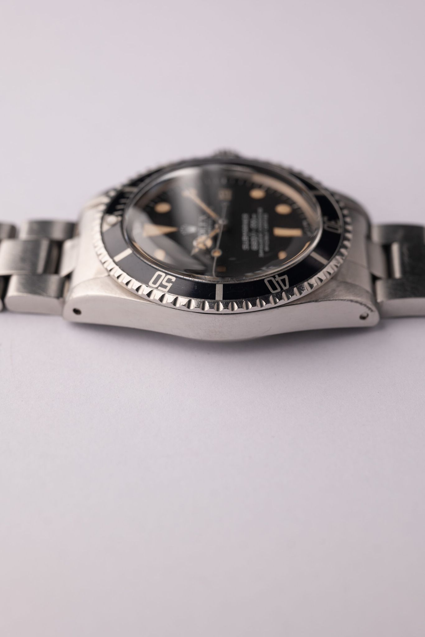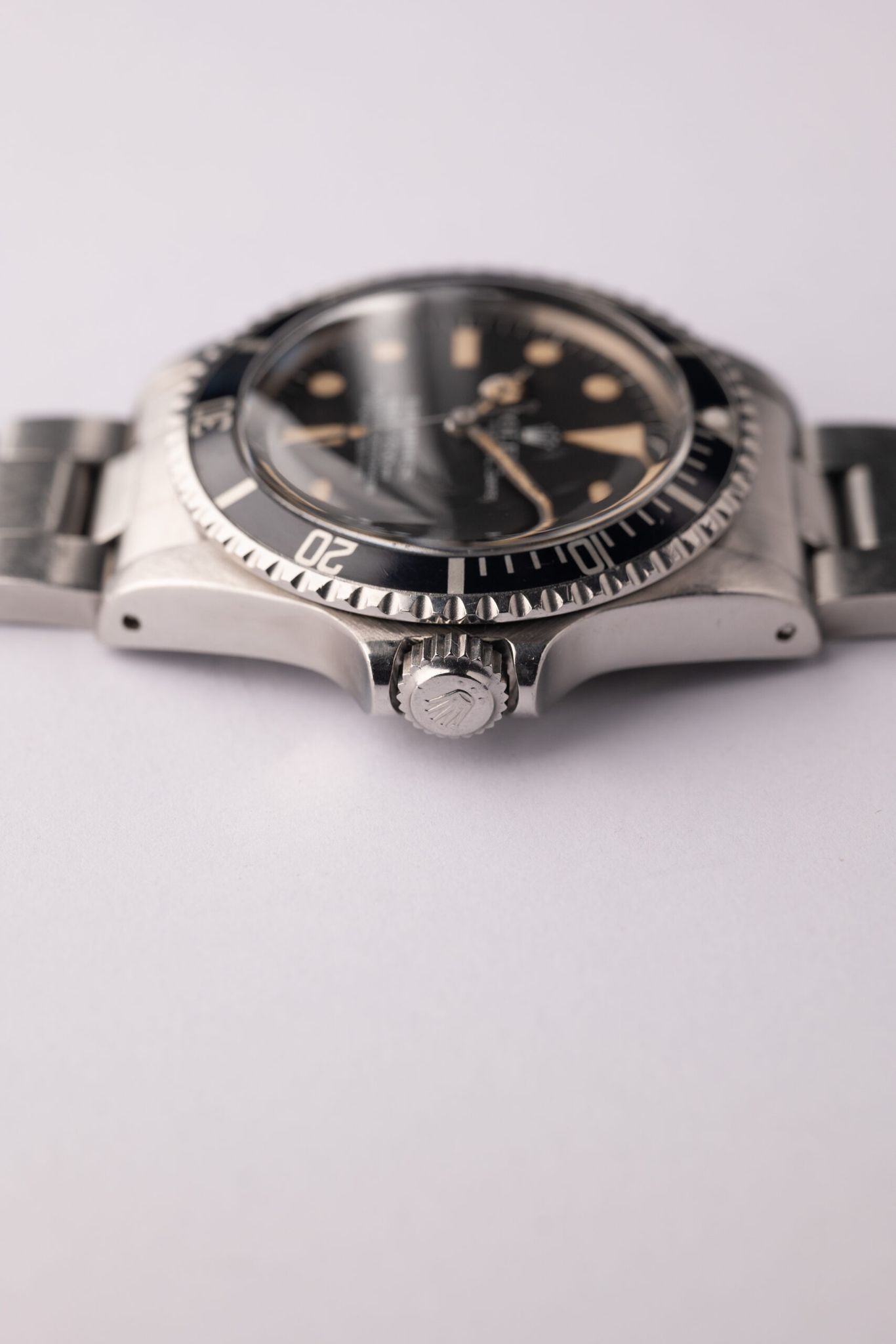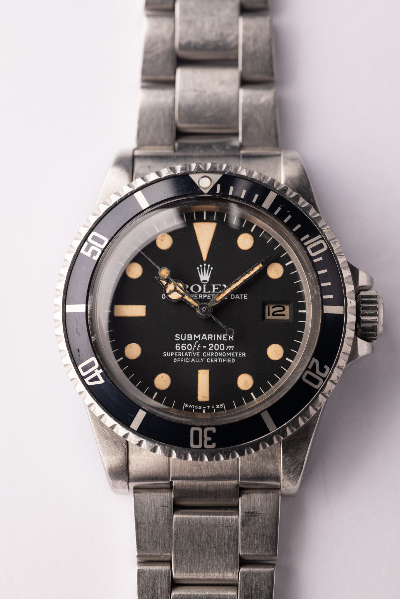 Date function, larger lume plots, and valued for far less than no-date iterations make Mk. I 1680s the perfect matte dial Submariner. 1680s demand sums similar to gloss dial WGS 5513s while retaining a vintage look and feel. This no-date, custard lume Submariner is in excellent condition. Crystal is a super dome tropic forgoing the bulky cyclops.
