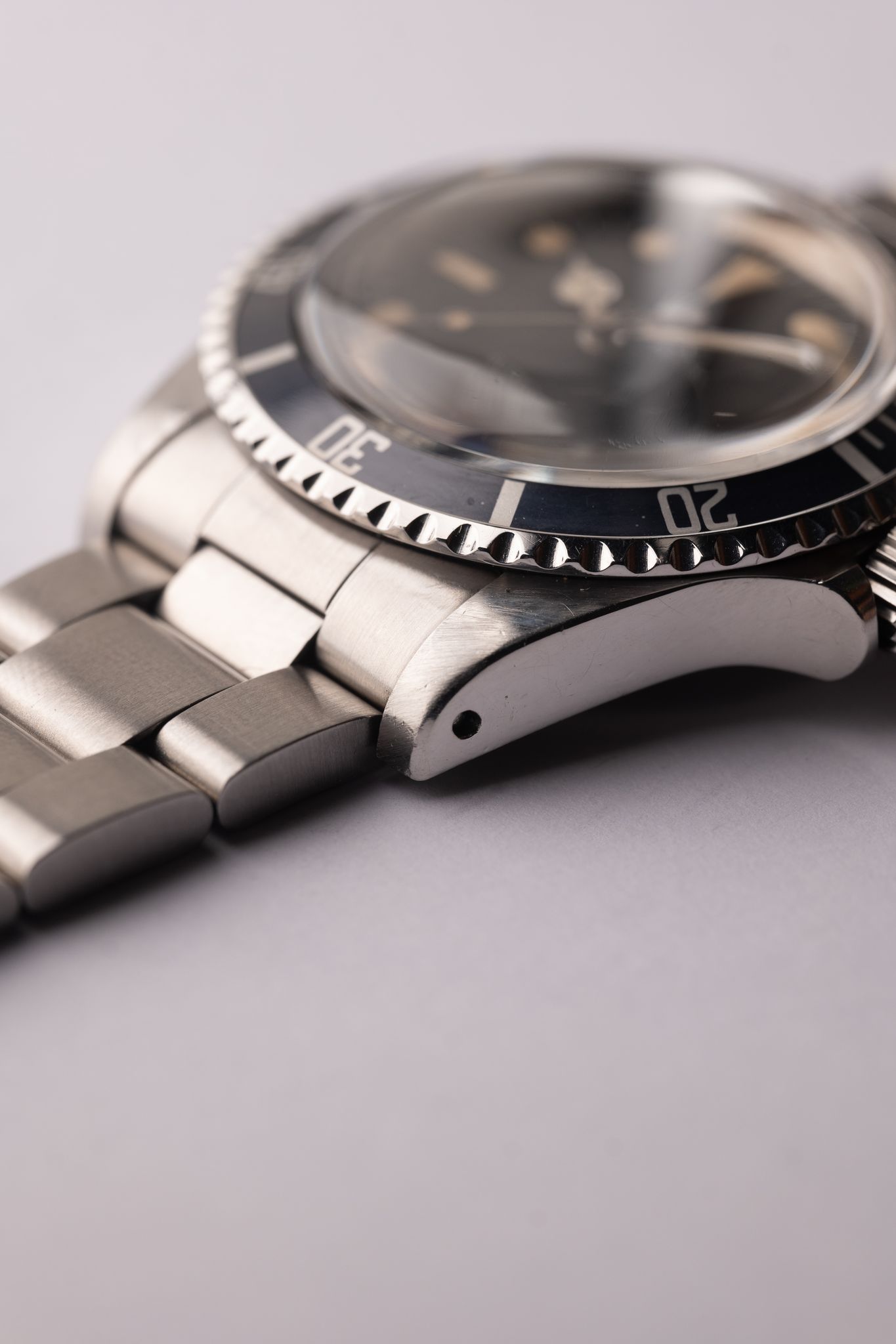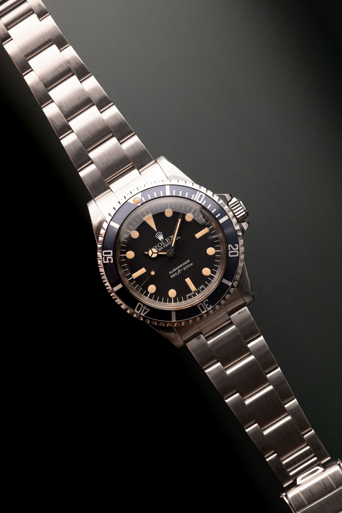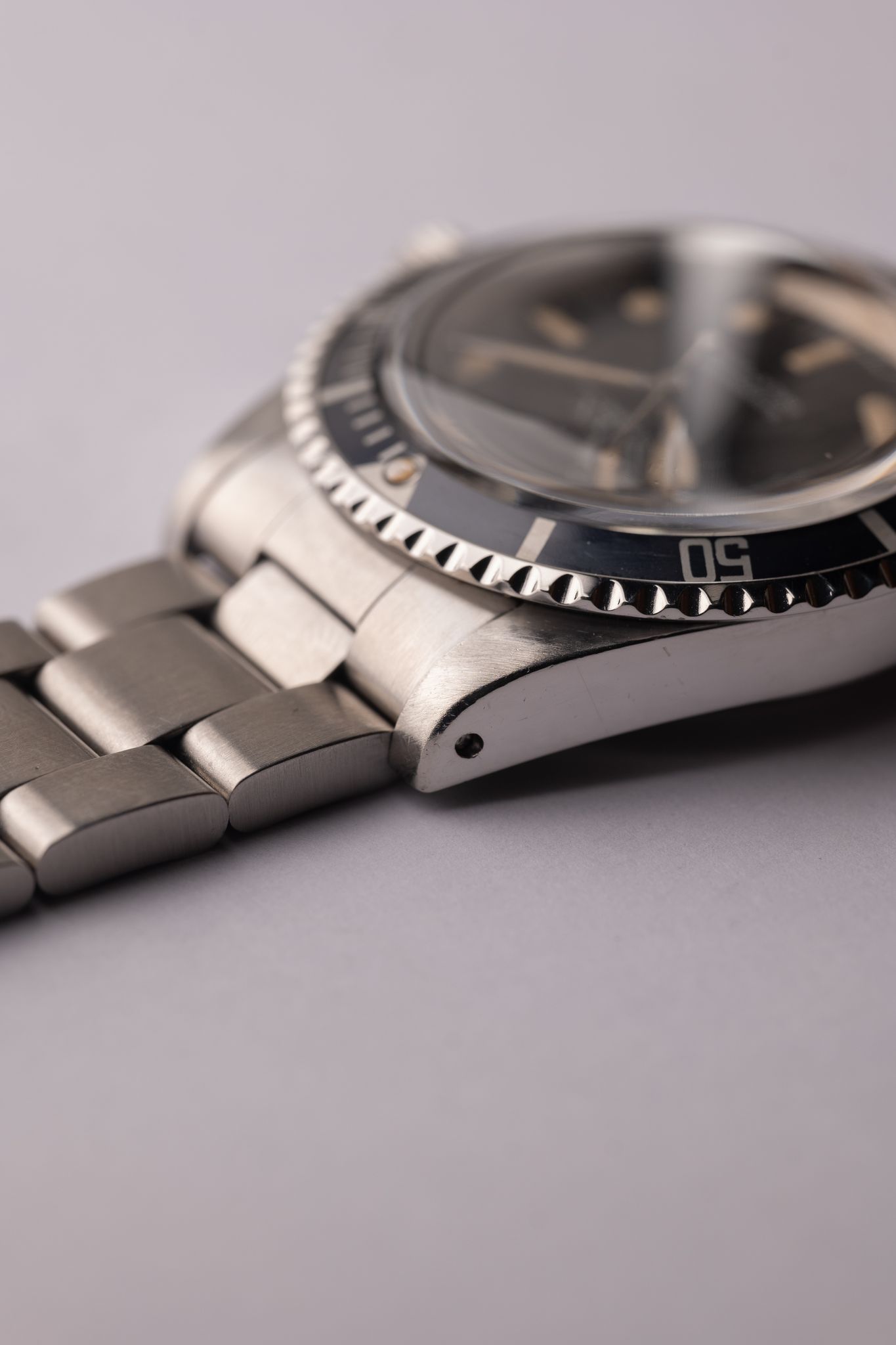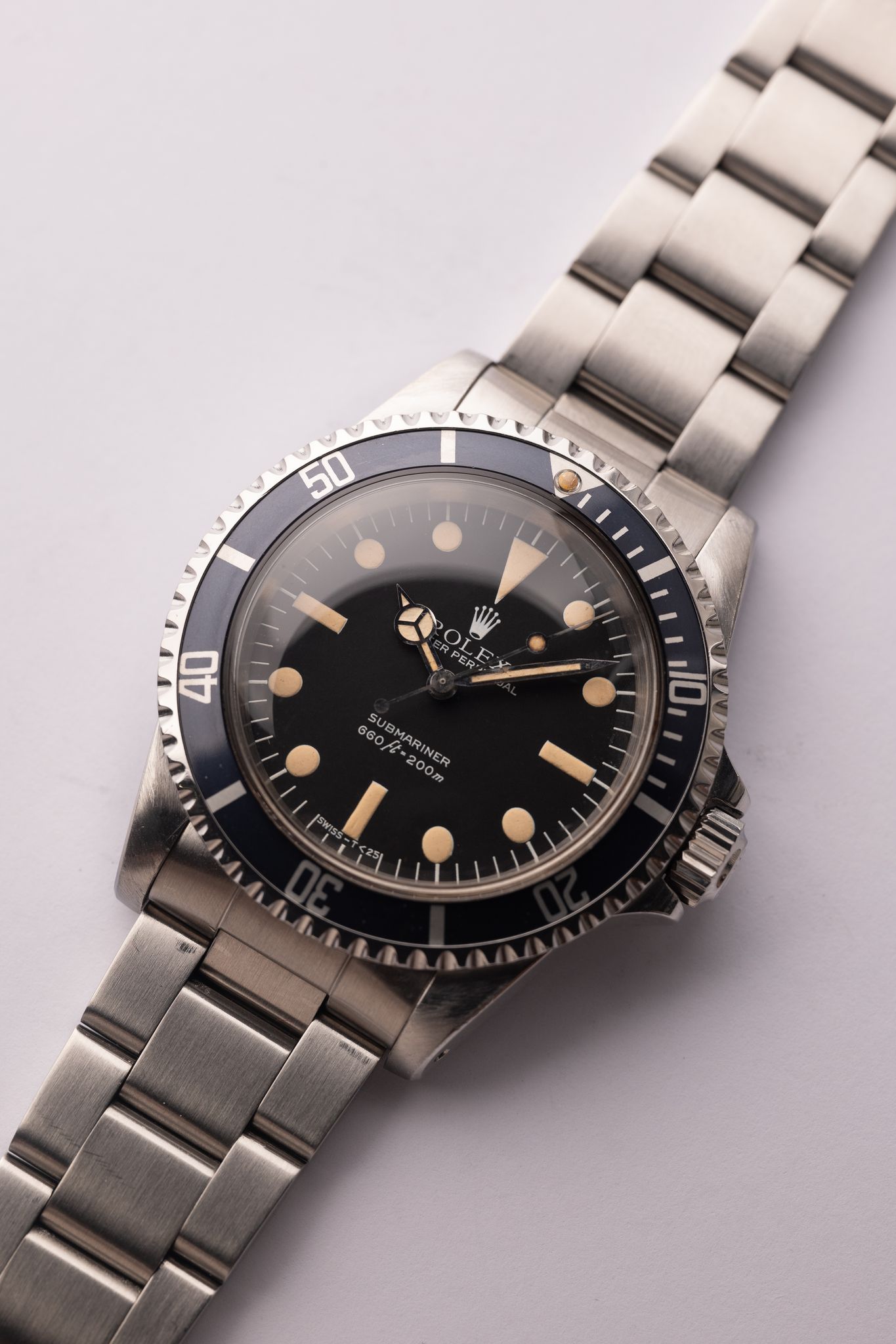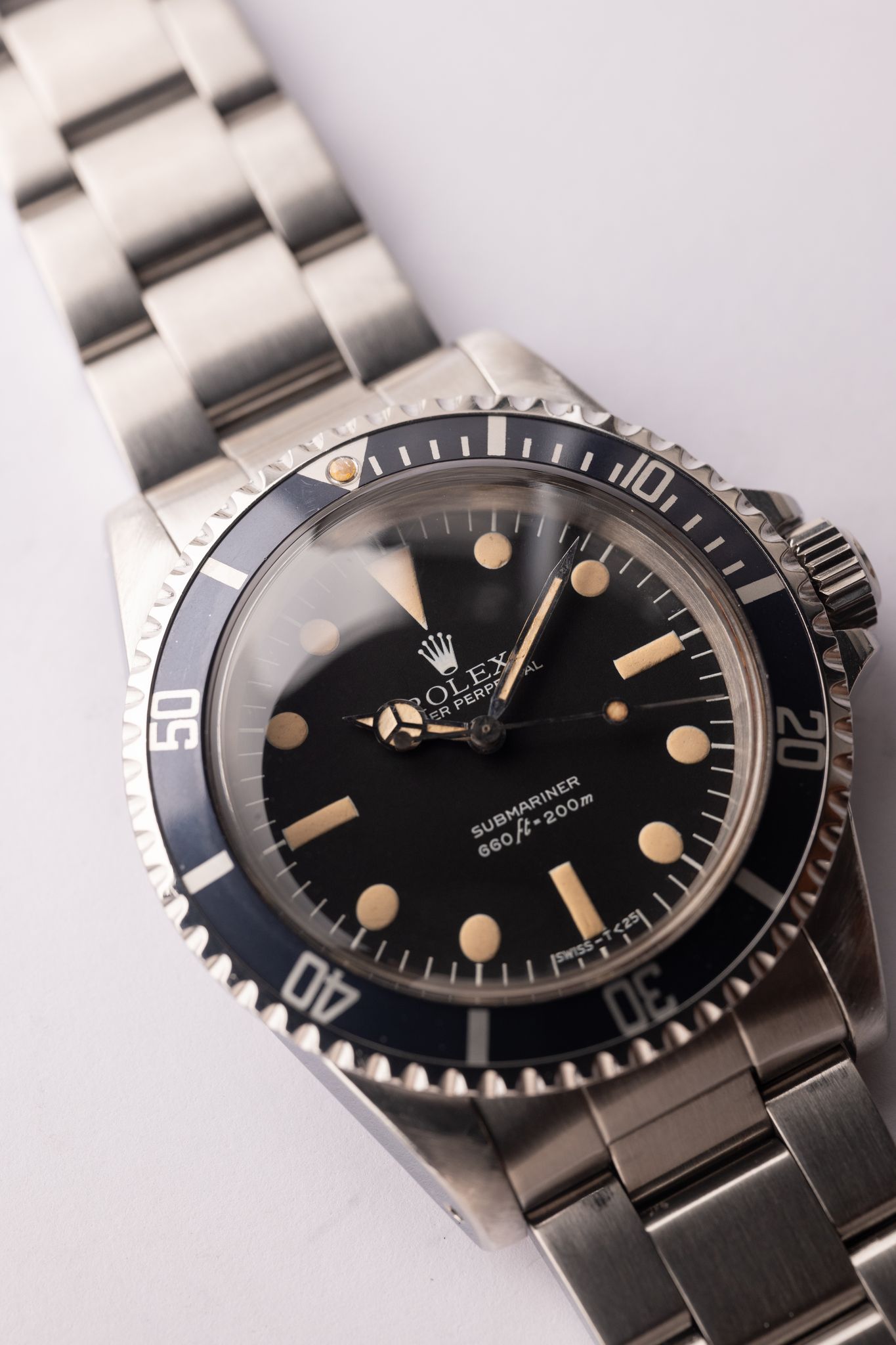 The last 5513 matte dial submariner’s are called maxi dials, as their lume plots are the biggest of any Sub to that point. Of the 5 dial variants, the 3rd variant is the biggest plots of its siblings, and is called the lollipop due to the indices touching the lume plots (another result of the size of the plot). This case appears lightly polished, and has an excellent color dial with classic yellow colored plots. Of all the matte dial 5513 submariners, the Maxi 3 is at the top of the pyramid in terms of desirability.