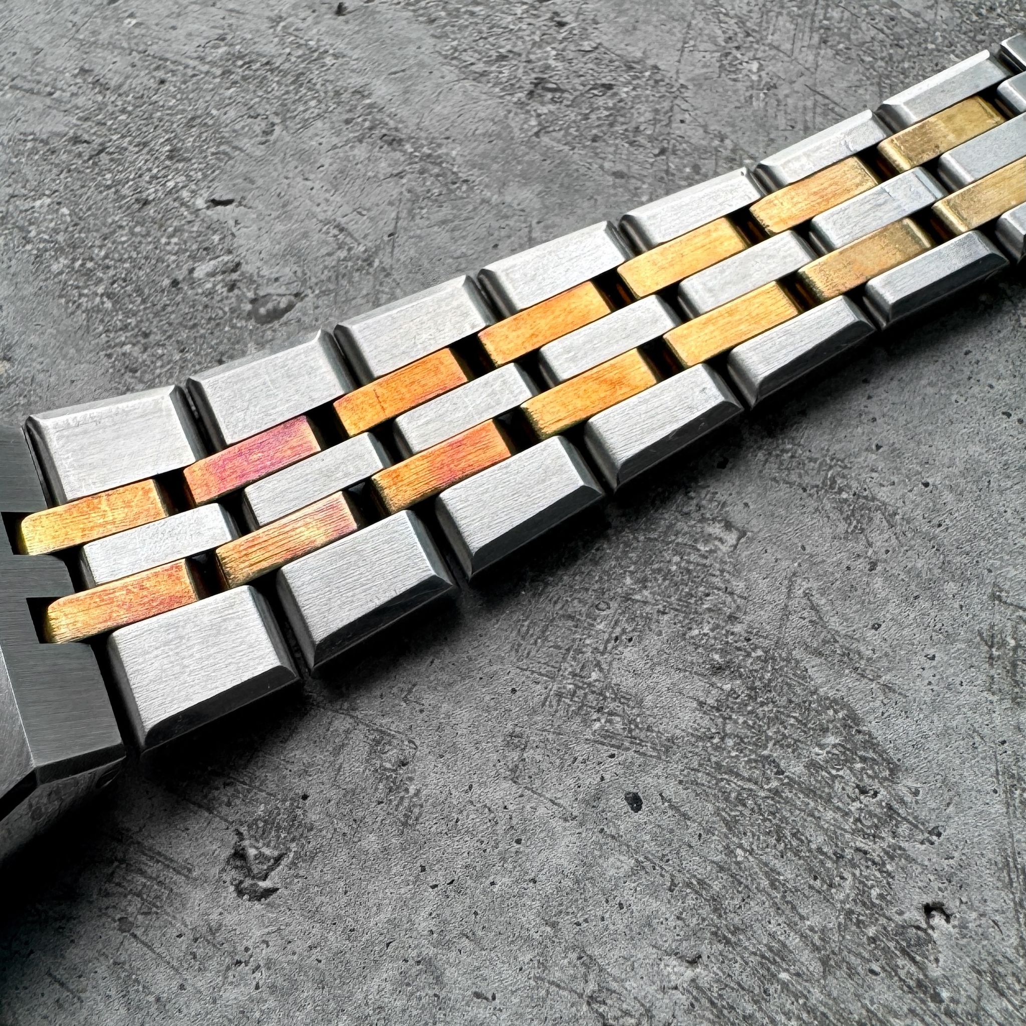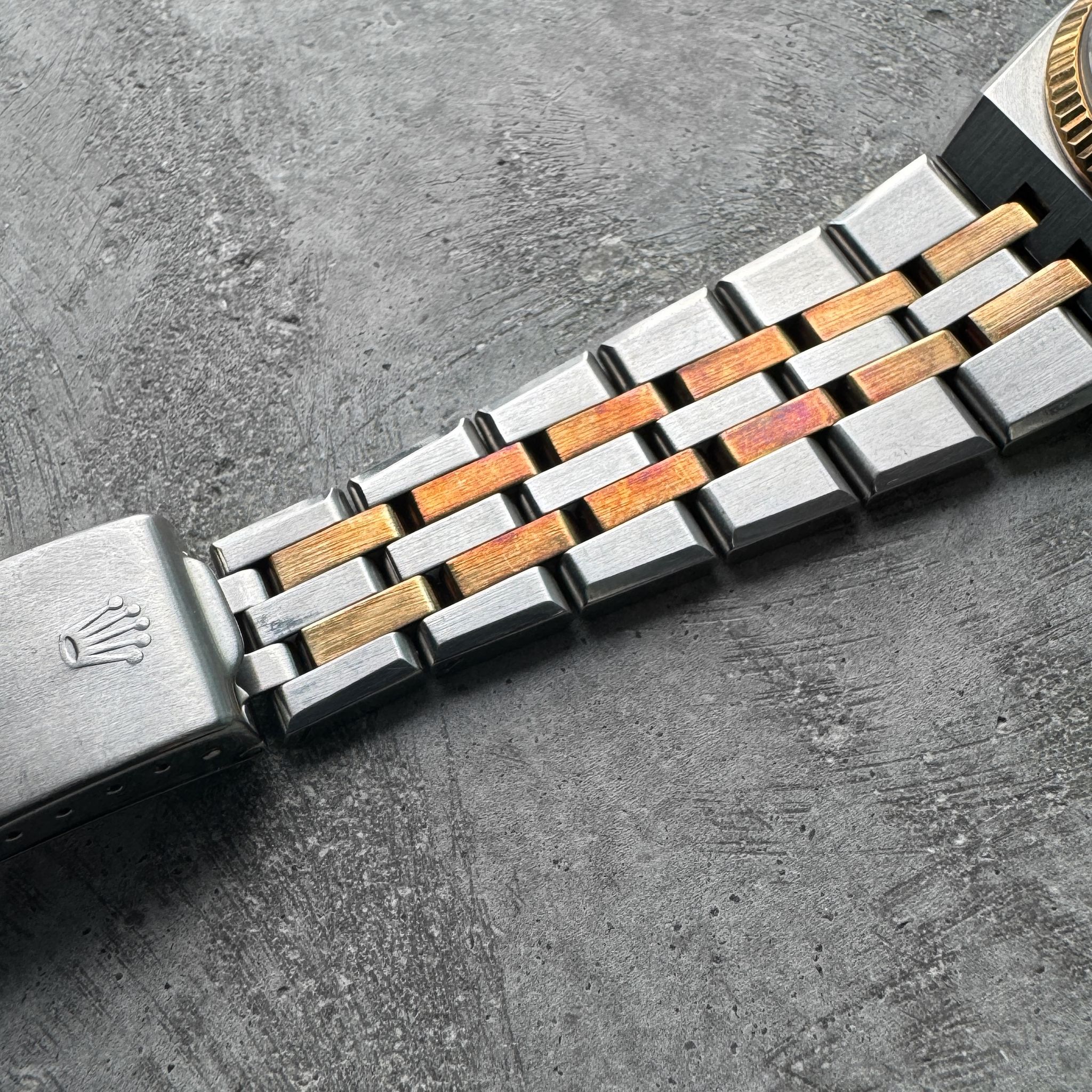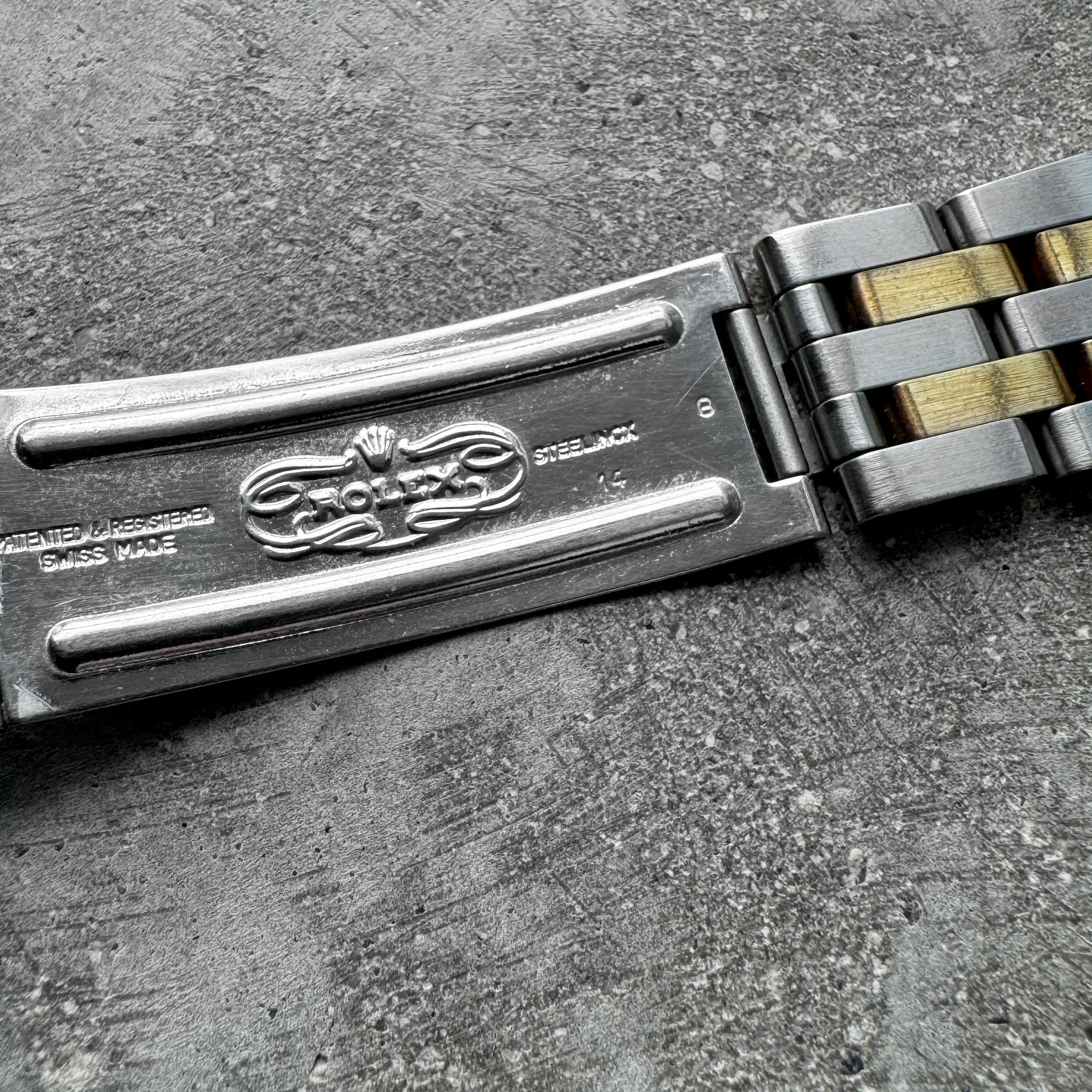 Bracelet/Strap: Factory original Rolex Jubilee Stainless Steel + 14k Solid gold middle links which is showing very light signs of previous wear. The middle gold links are rosey patina, this watch has been sitting safely in a safe for many decades in order to gather this stunning rosey patina. The strap comes with full links and will fit an 8 inch wrist