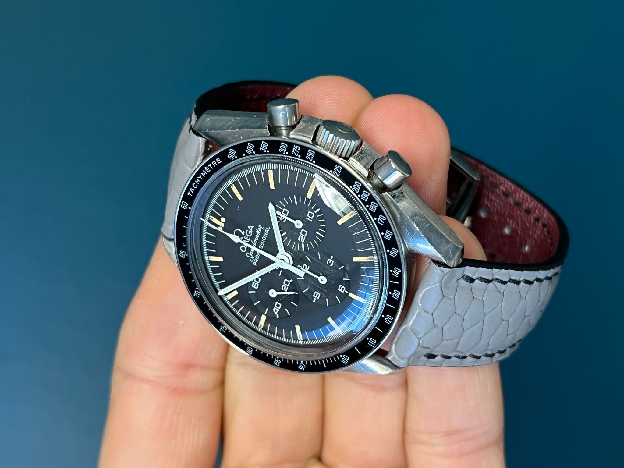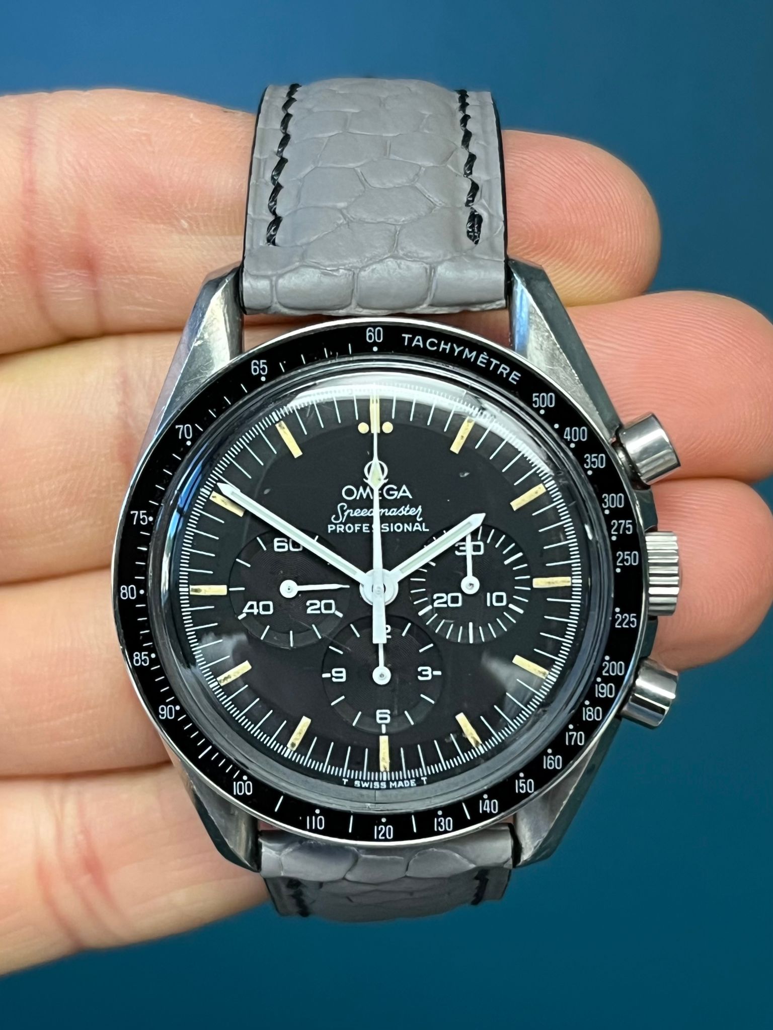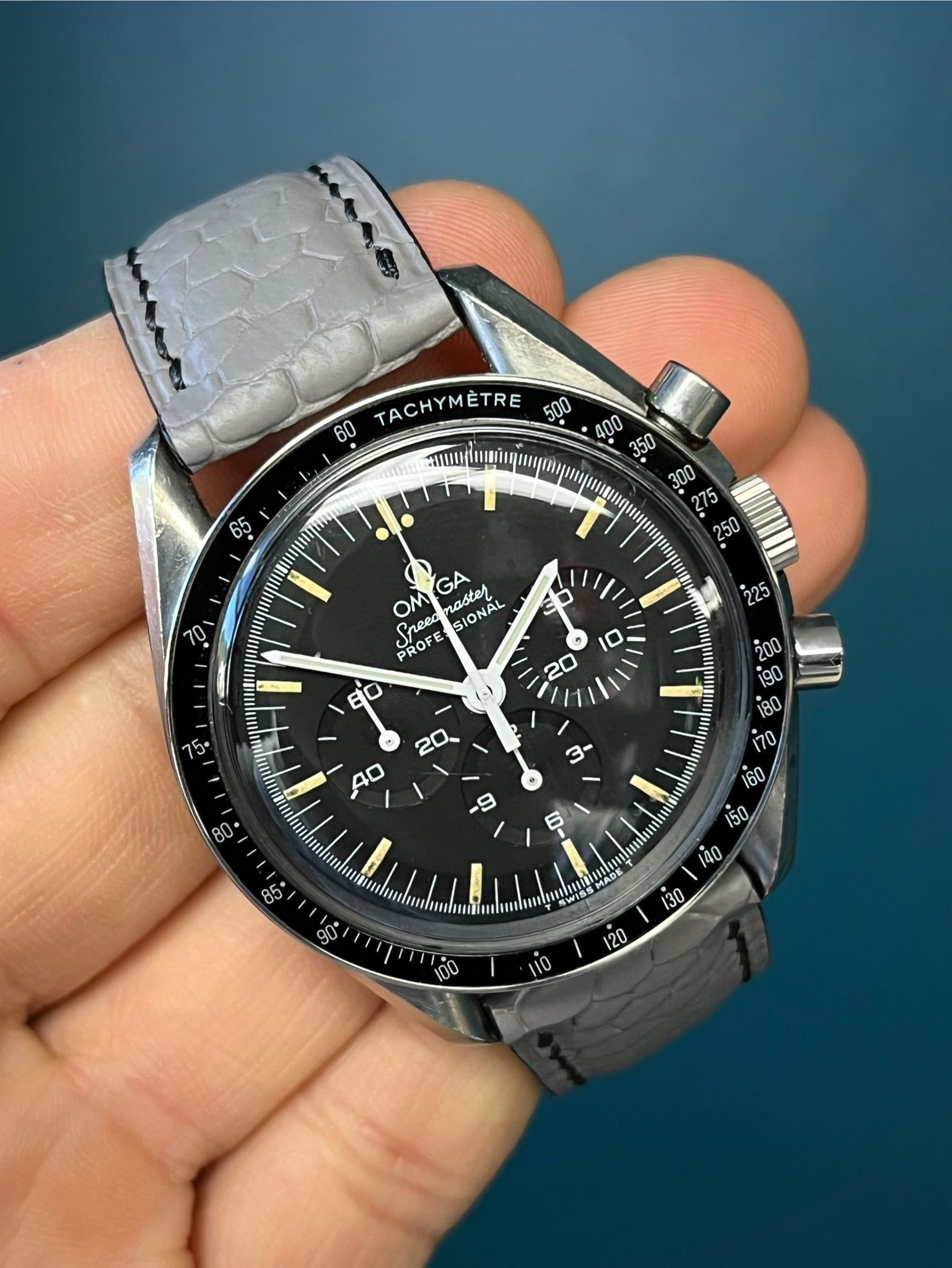 Recently serviced, this Omega Speedmaster Reference 145.022-78ST is a quintessential vintage chronograph that embodies the legacy of the Moonwatch. Produced in the late 1970s, this model features the classic 42mm stainless steel case with twisted lugs, a black stepped dial with tritium lume that has aged beautifully, and the iconic tachymeter bezel. Powered by the legendary Caliber 861 manual-wind movement, this Speedmaster continues Omega’s heritage of precision and durability. This example is presented on a strap, enhancing its vintage appeal and wearability. A true collector’s piece, the 145.022-78ST represents the enduring charm of the Speedmaster lineage.