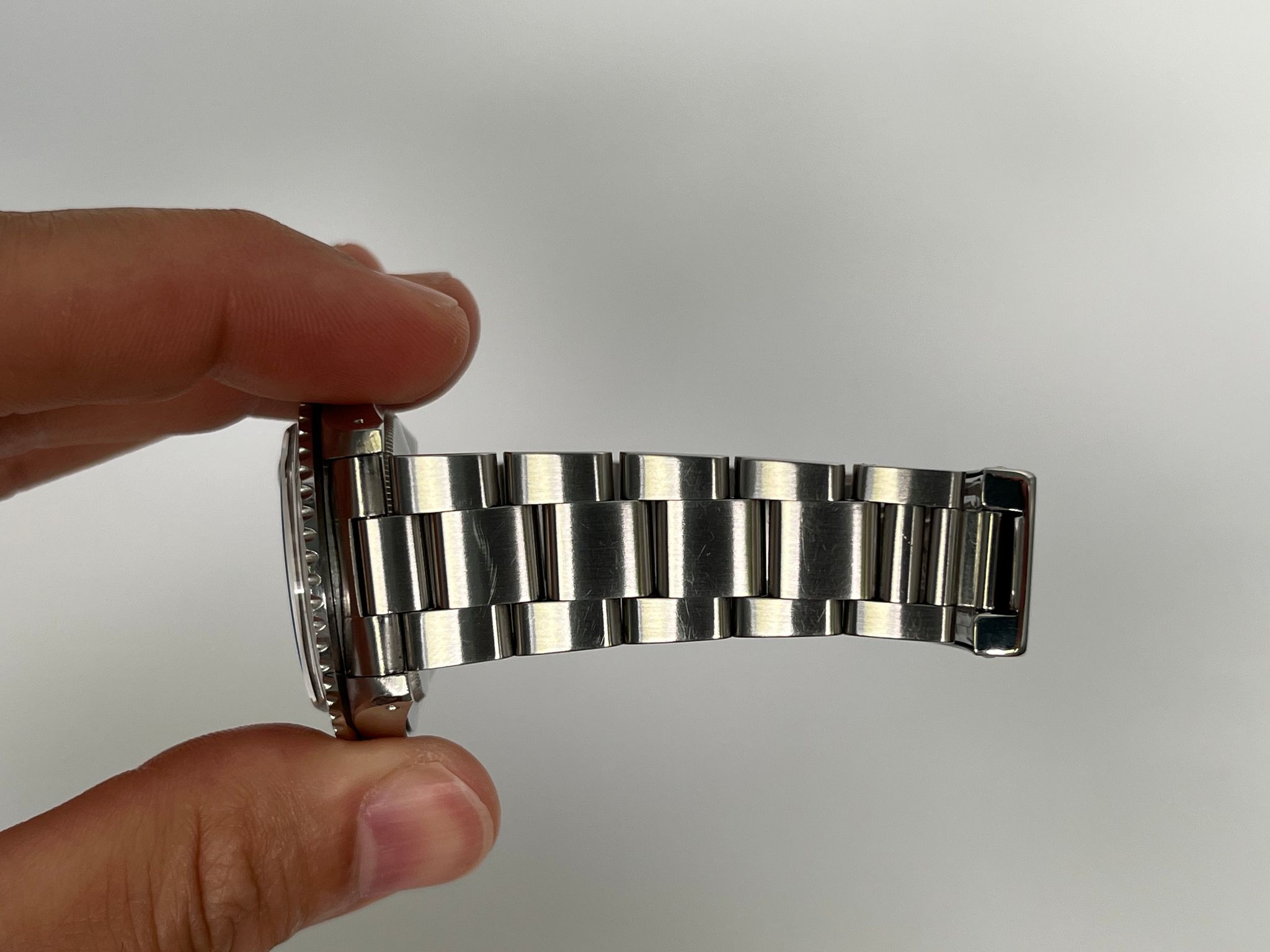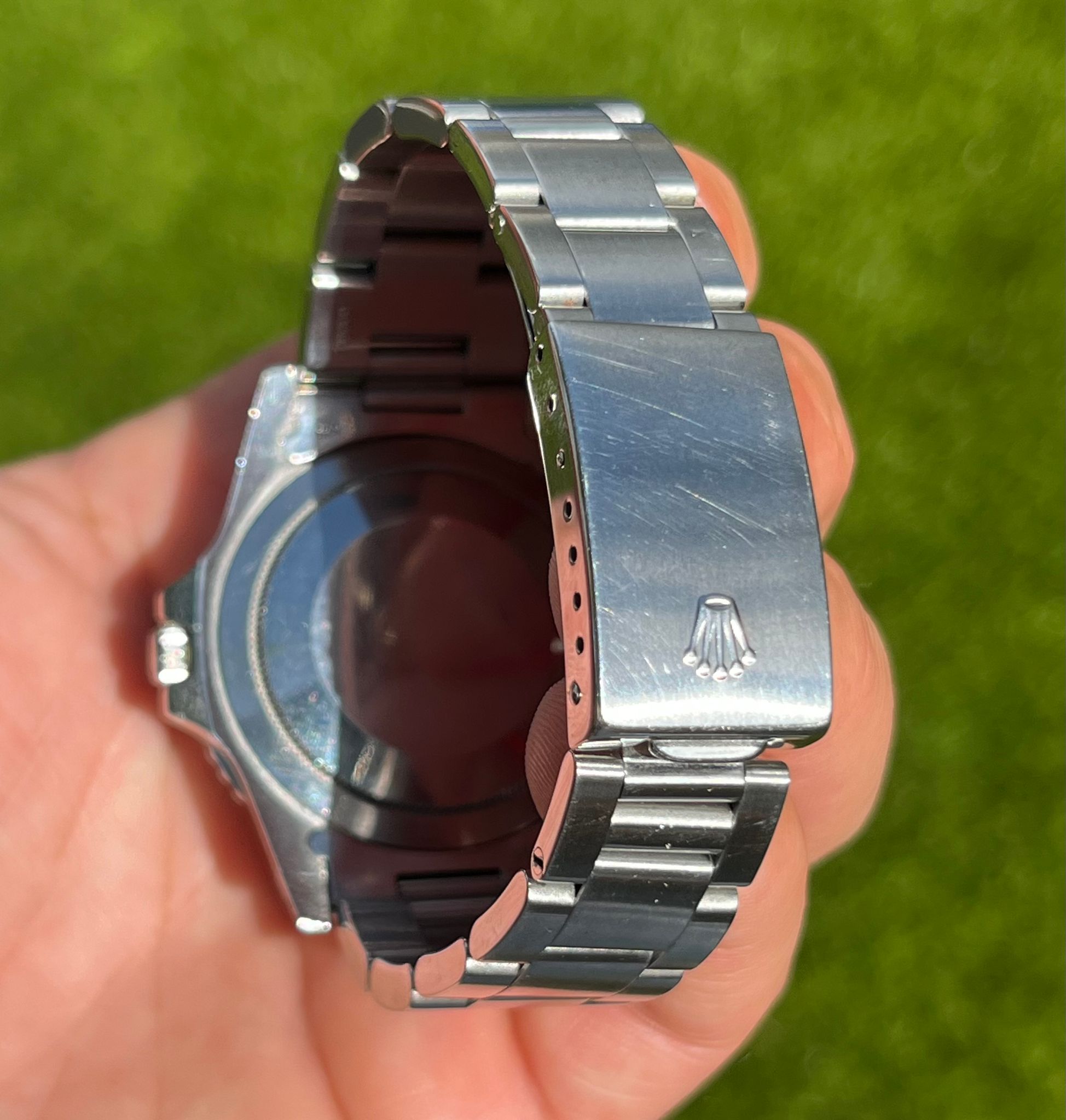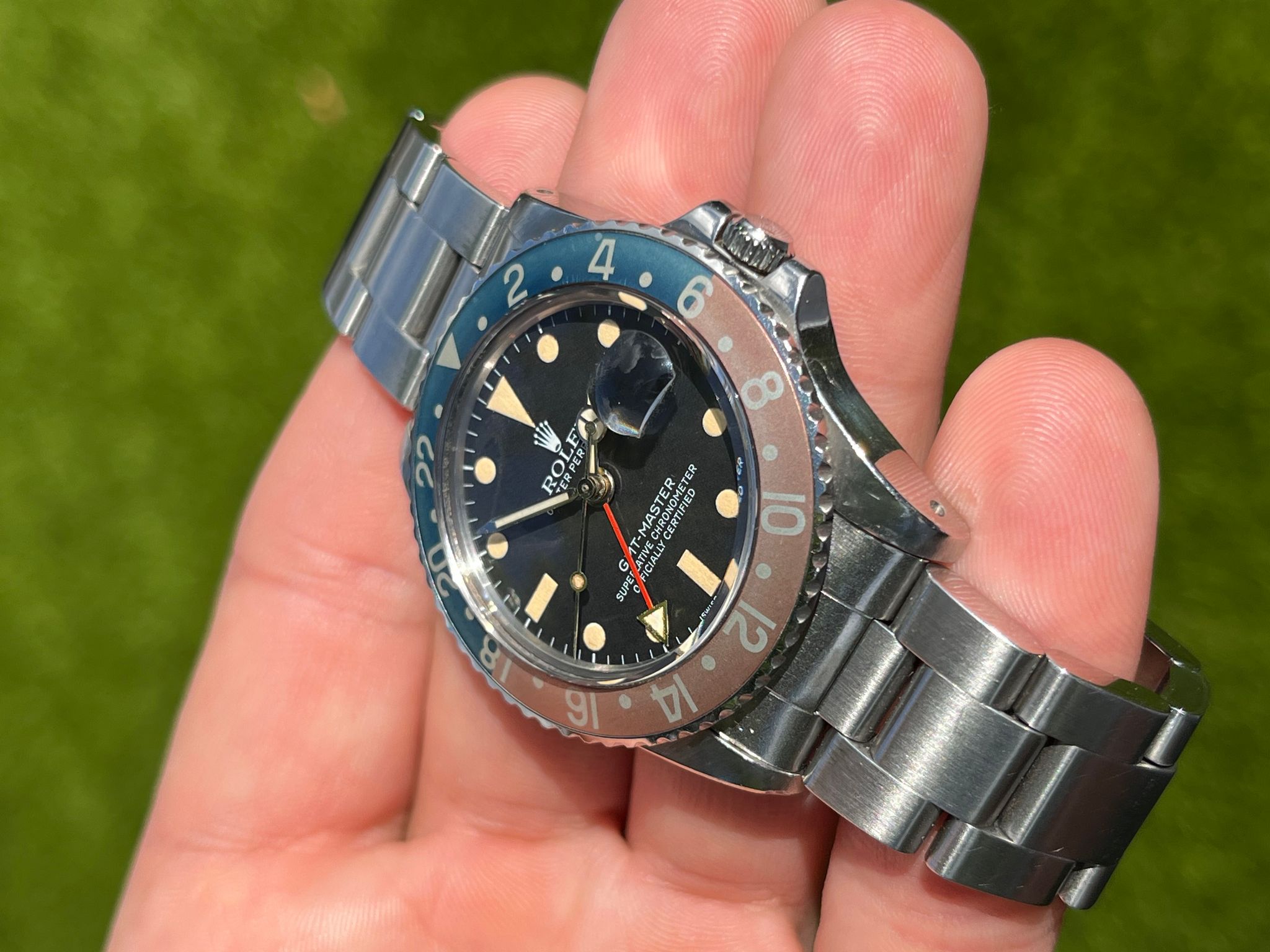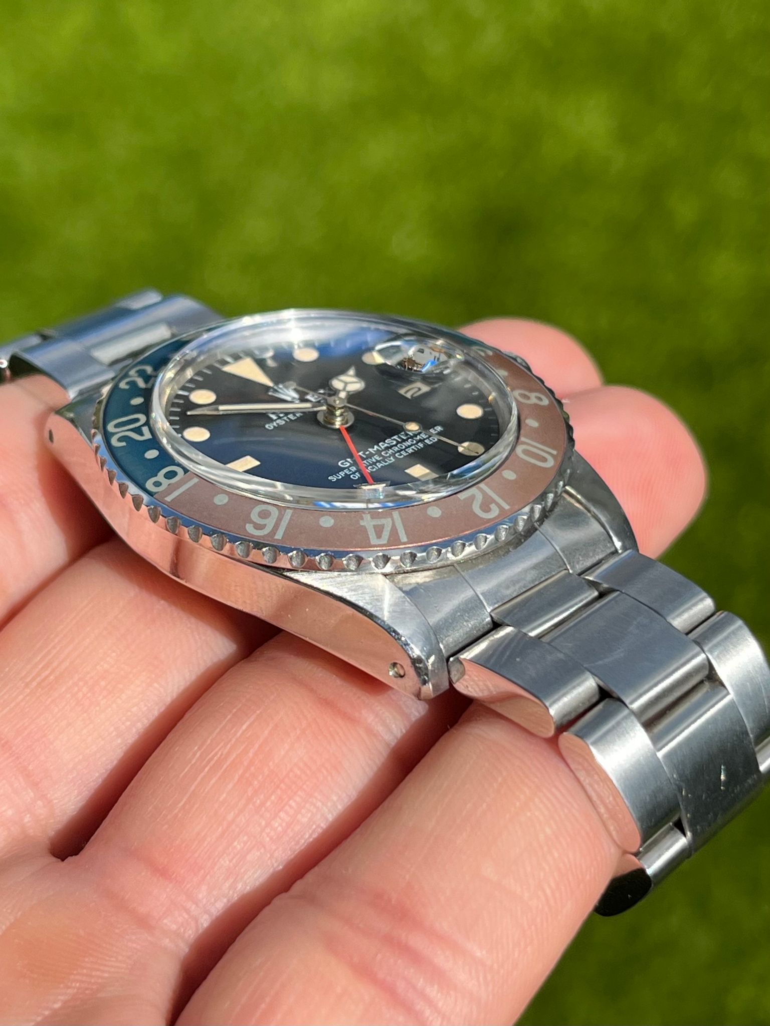 Here we have a lovely original and unpolished example of a MK5 Pepsi GMT. The MK5 dial is beautiful with a warm pumpkin patina on the hr plots. The hands are original and a shade lighter in patina. The case is excellent showing very wide chamfers. The fat font red back insert is beautiful and evenly faded. The 78360 solid link oyster bracelet is fully linked and shows no stretch. The watch is running well and keeping time.