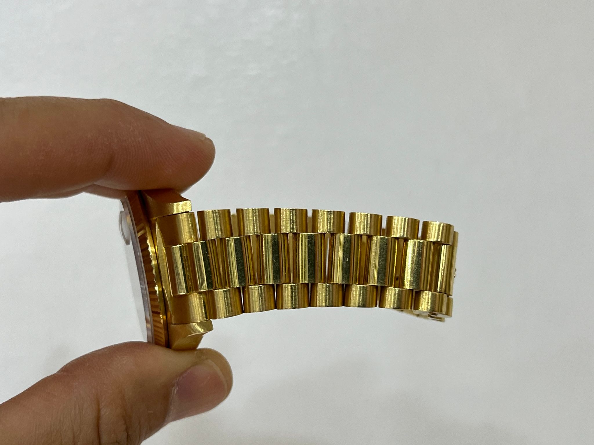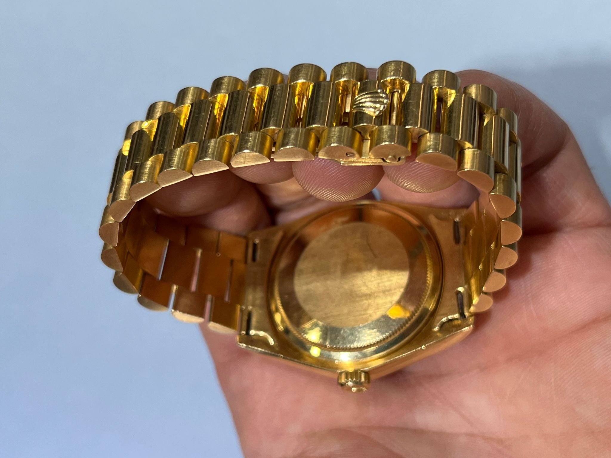 The vintage Rolex President reference 18038 with a rare burl wood dial is a remarkable fusion of luxury and nature's artistry. The burl wood dial showcases unique grain patterns, giving each piece an exclusive and organic aesthetic that contrasts beautifully with the 18k yellow gold case and iconic President bracelet. This specific example features an unpolished case, preserving the watch's original sharp lines and showcasing its untouched vintage charm. Powered by Rolex's reliable Caliber 3055 automatic movement, it offers a quickset date function and legendary performance. A testament to the brand's elegance and innovation, this reference is highly sought after by collectors for its rare dial and unaltered condition.