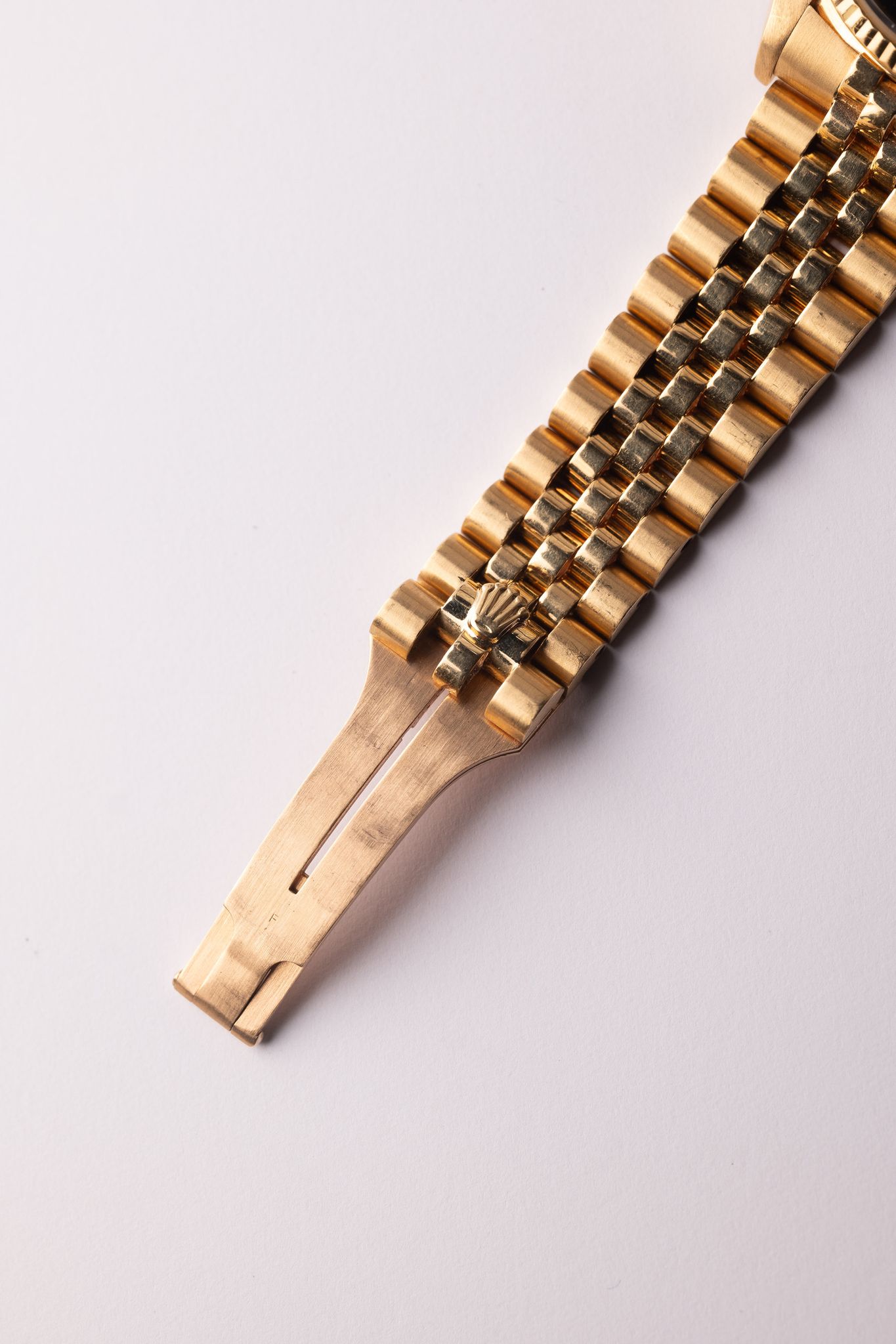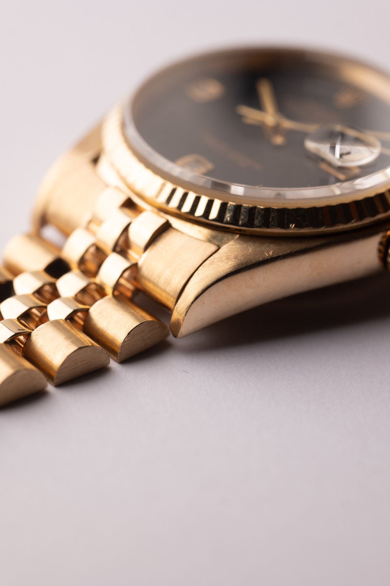 The 16018 Onyx dial datejust on jubilee is in excellent condition. The 6/9 indices are adorned with single diamonds and add a pop to an otherwise deep black dial. The case is excellent and has been lightly polished in the past. The dial is free of defects or blemishes.