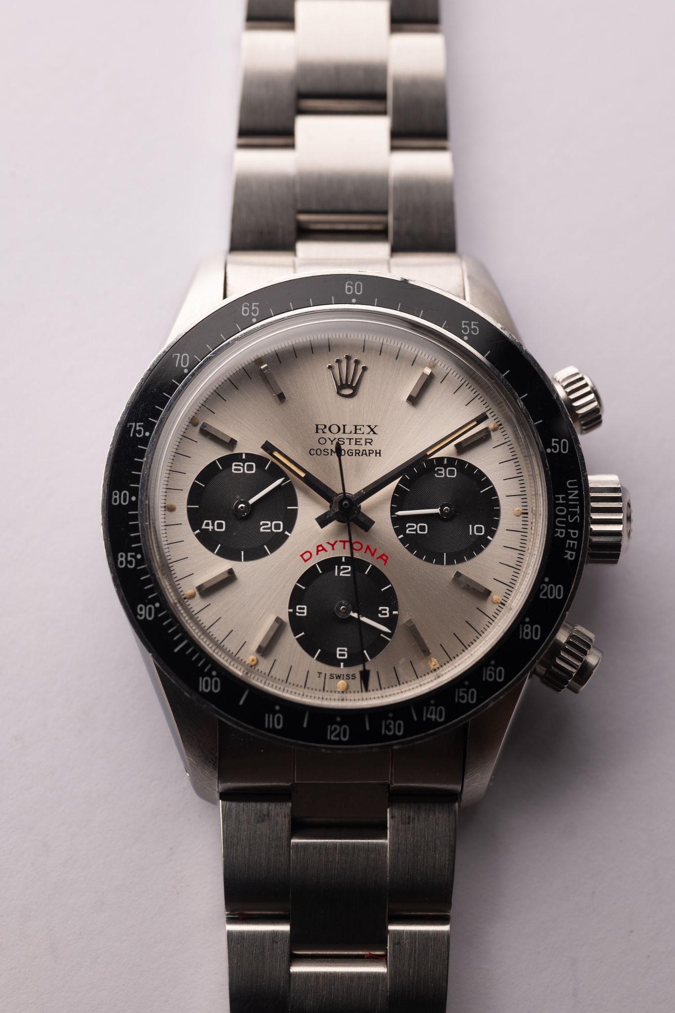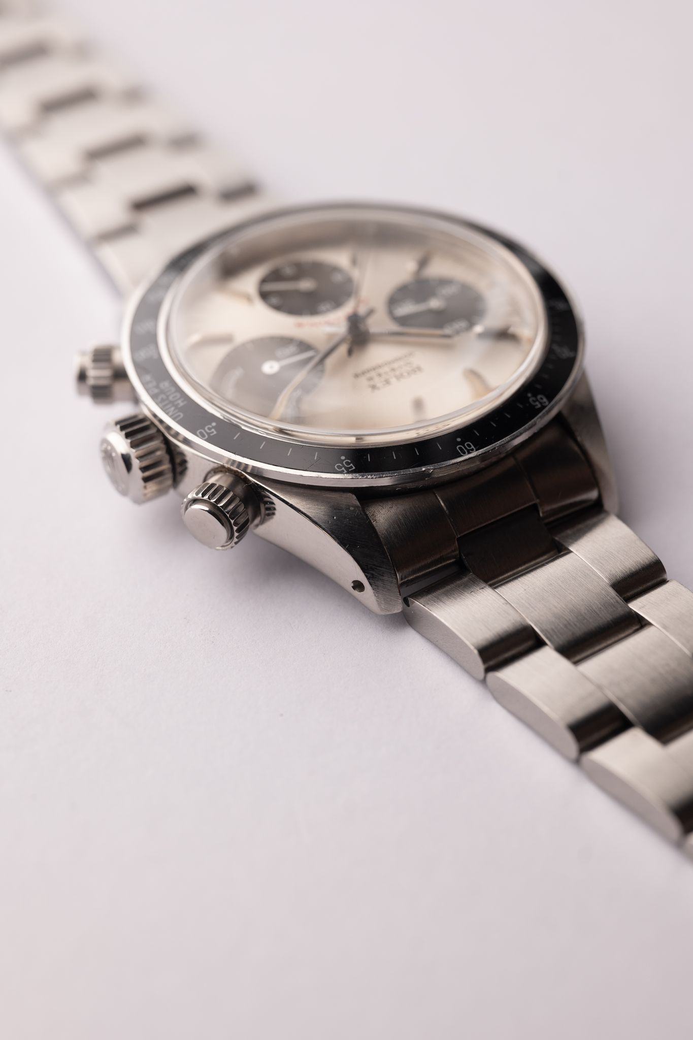 There is certainly something special about the Big Red 6263. Considered the blue print for all modern Daytona’s with its signature “Big Red” Daytona text , to its contrasting black bezel and chunky screw down pushers, the classic 36mm variant was an instant classic in our eyes. Rolex made many variants of the 36mm Daytona from the pre-daytona to the Newman Exotic dials to this specific Big Red, but this variant is always the version we think of when the word Daytona comes to mind. This specific 6263 has a beautiful silver panda dial. Lume plots are saturated yellow and still puffy. Bracelet code is a later 2005 clasp on oyster.