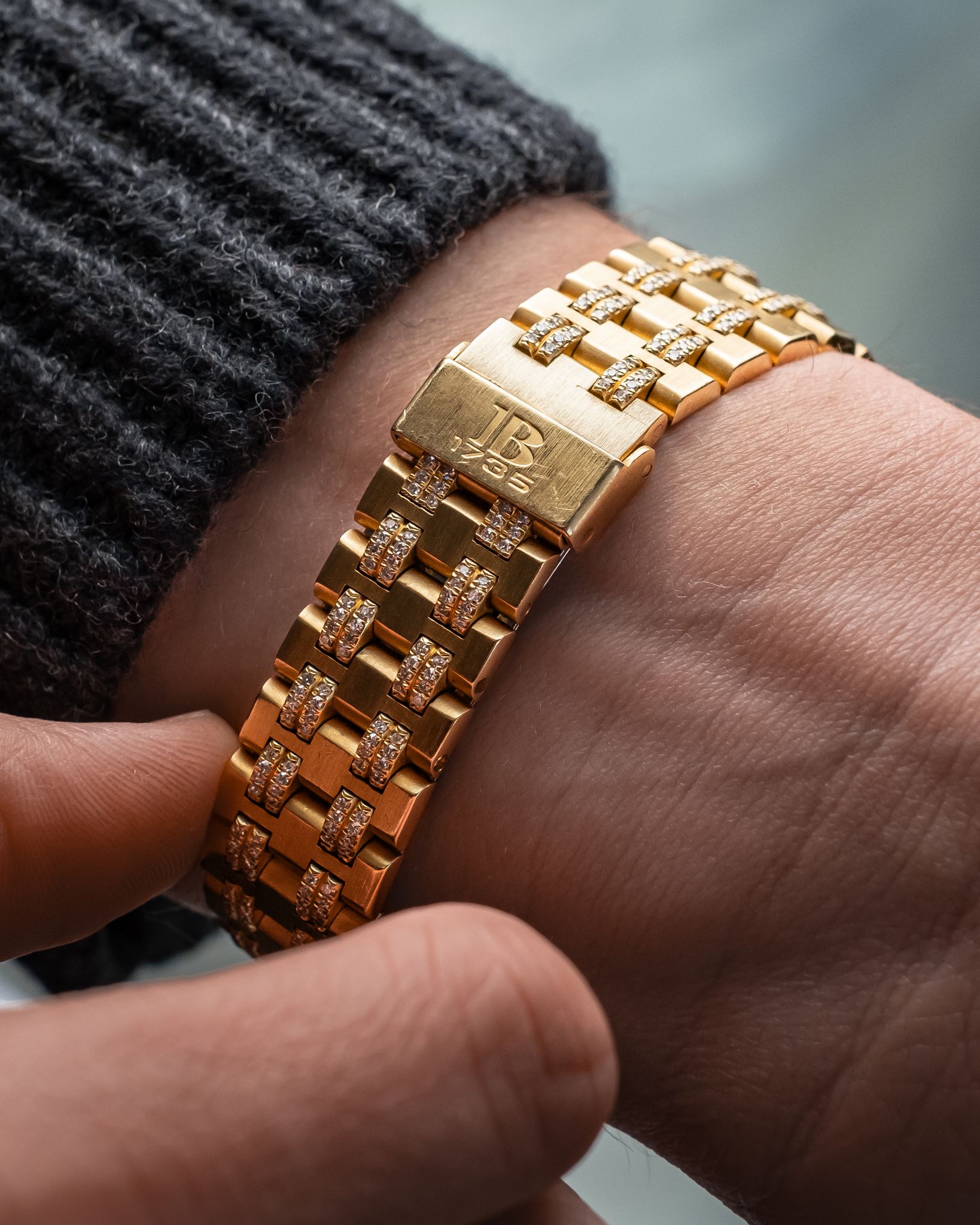Looking at the diamond set bracelet, it was made by the famed bracelet manufacturer, Gay Frères. The bracelet has removable pins and fits up to an 18,5cm wrist. There is little stretch in the links with the watch head sitting upright when placed clasp down, the diamonds in the centre links are a real eye catcher!