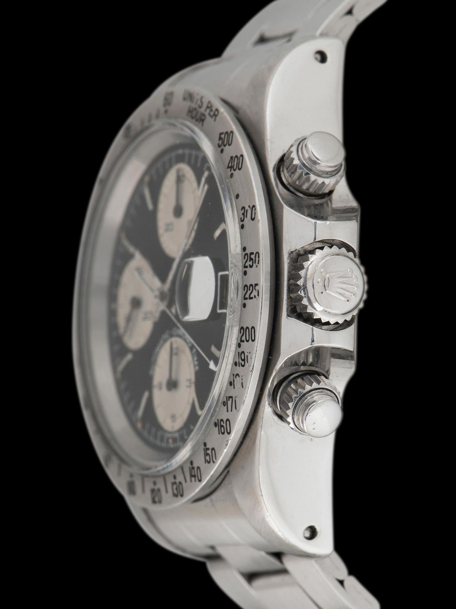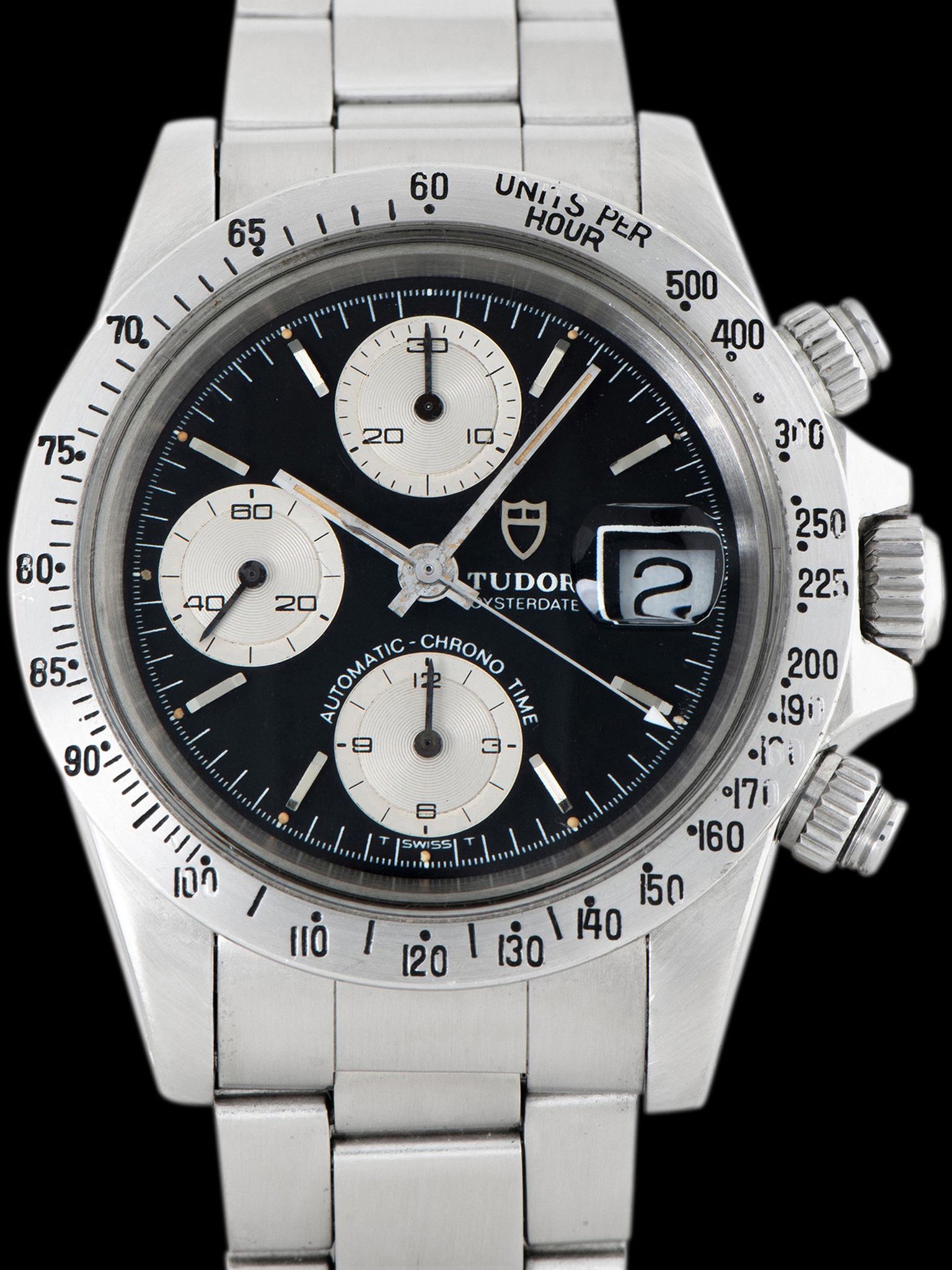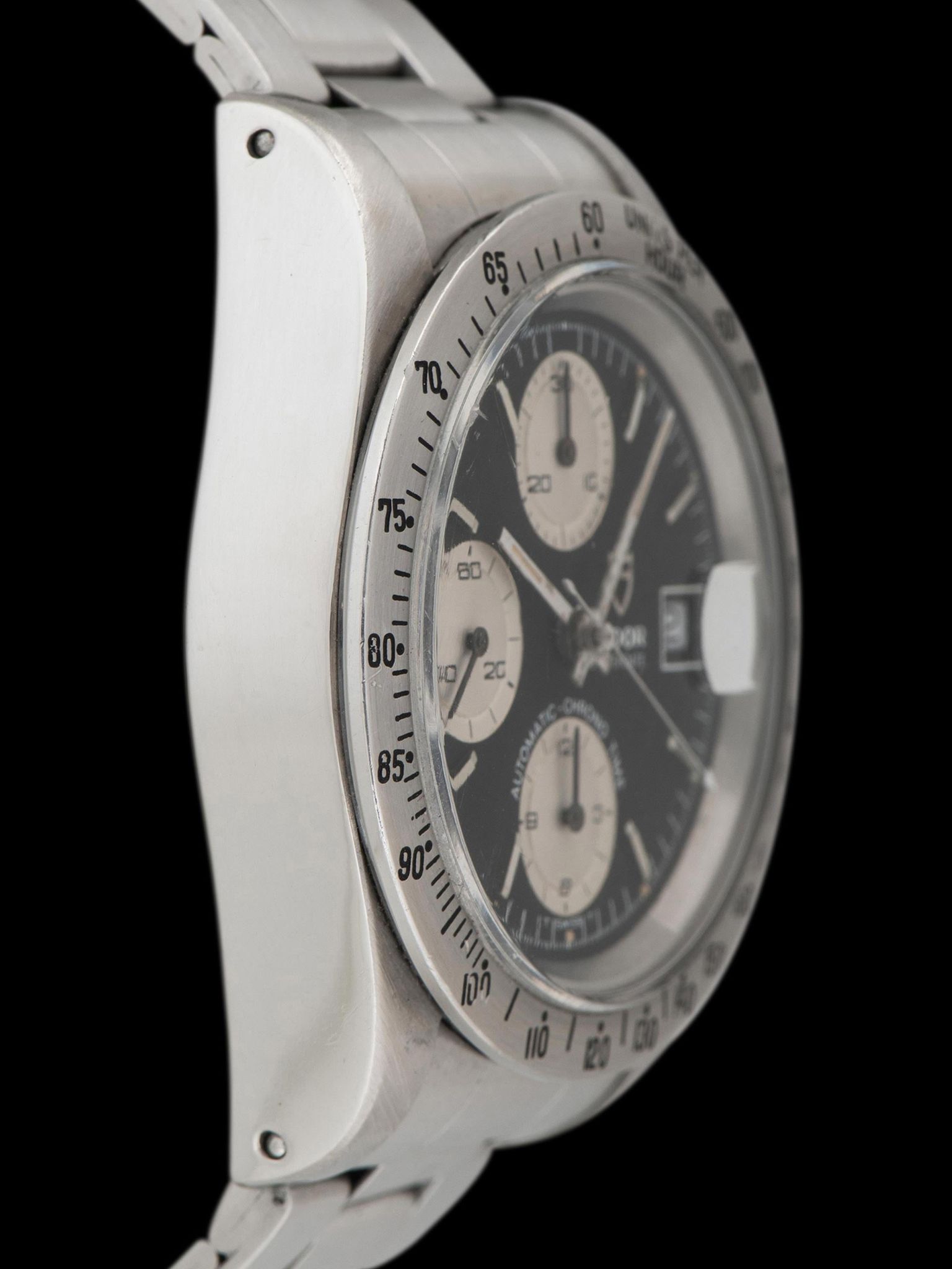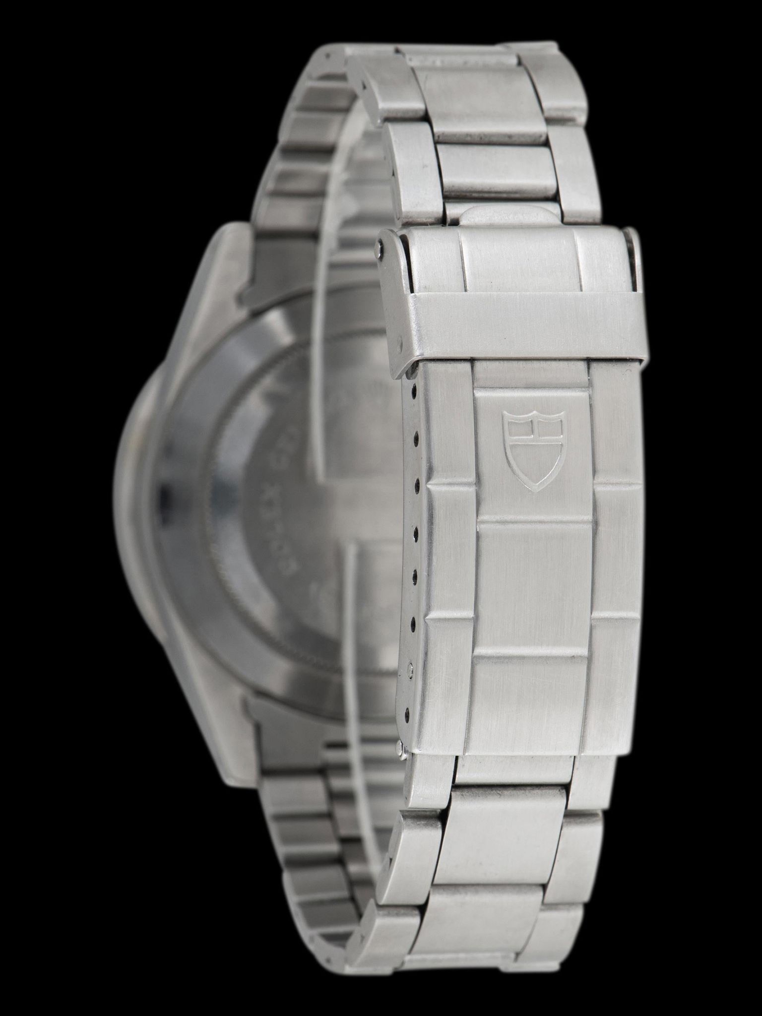 The large and well-preserved case retains full and even lugs that show light evidence of being previously polished, with minimal signs of use present. The fixed stainless steel “Units Per Hour” bezel is also in excellent condition, showing minor loss to the original black enamel with no notable wear present. The case retains its original Rolex trip-lock crown and screw-down pushers. The case back retains all of its factory markings in crisp condition. The Tudor 9315 Oyster bracelet with correct 589 end pieces was sourced with the watch and is era-correct. The bracelet retains 12 links that show minor stretch and will fit up to a 7.5-inch wrist.