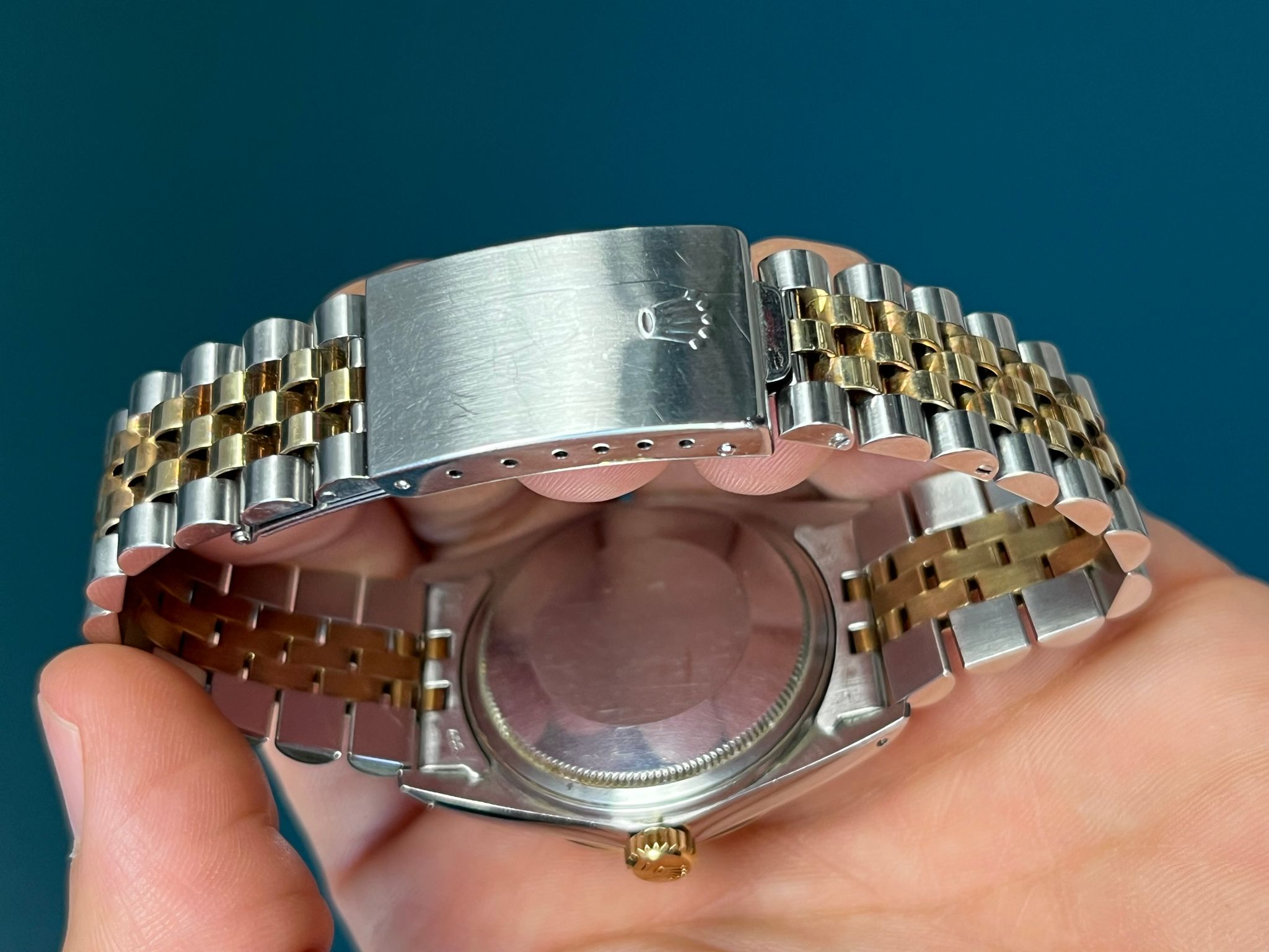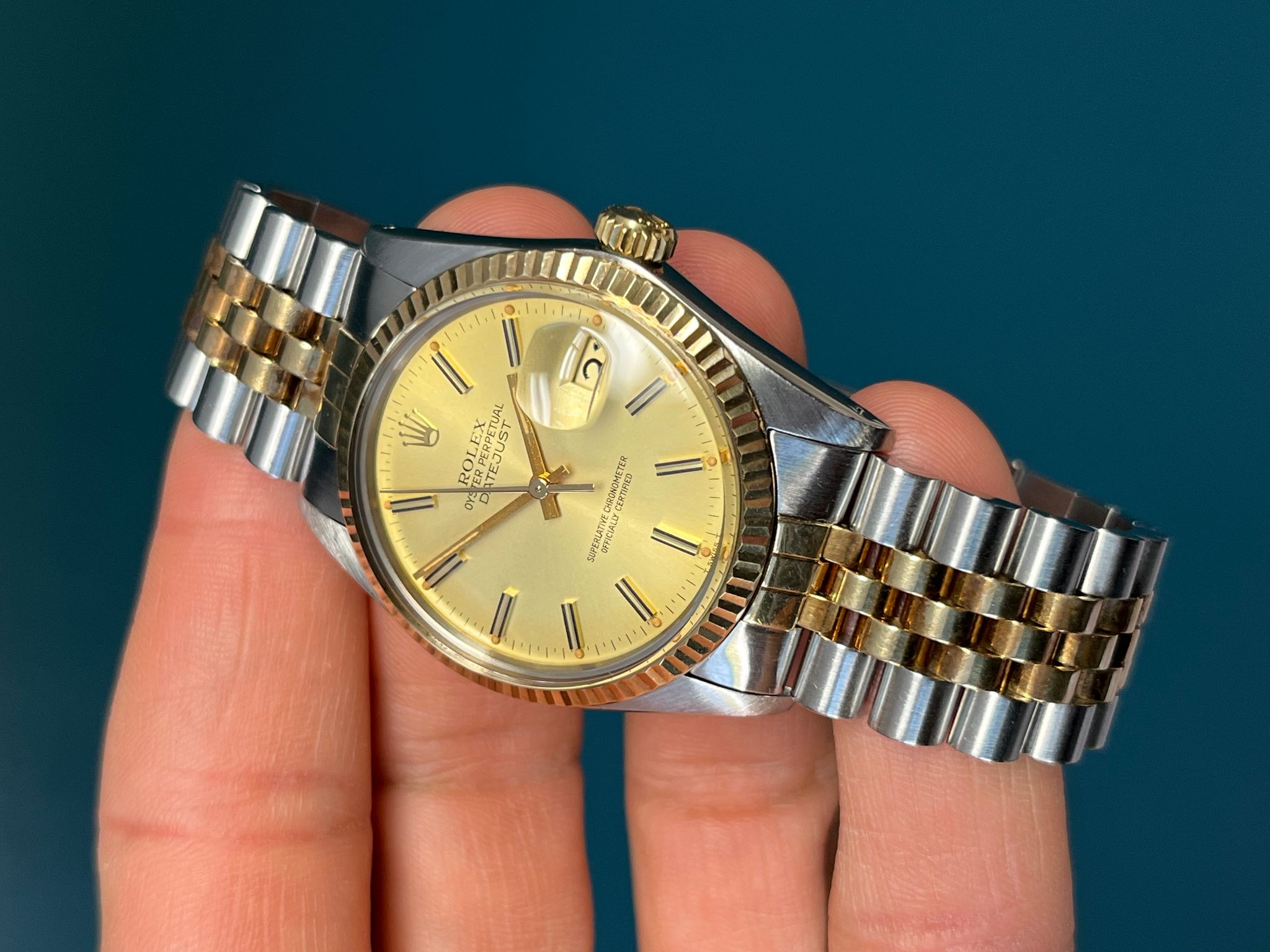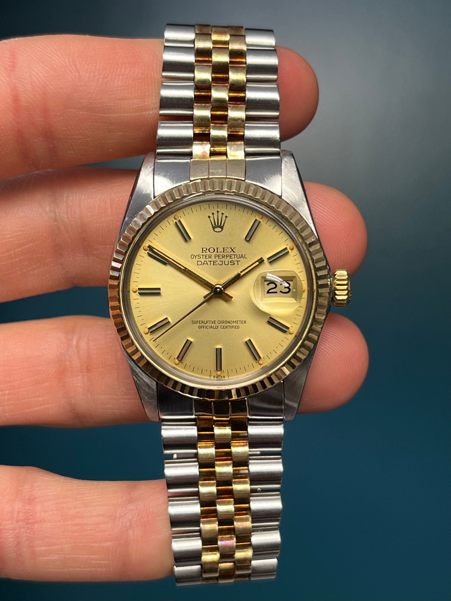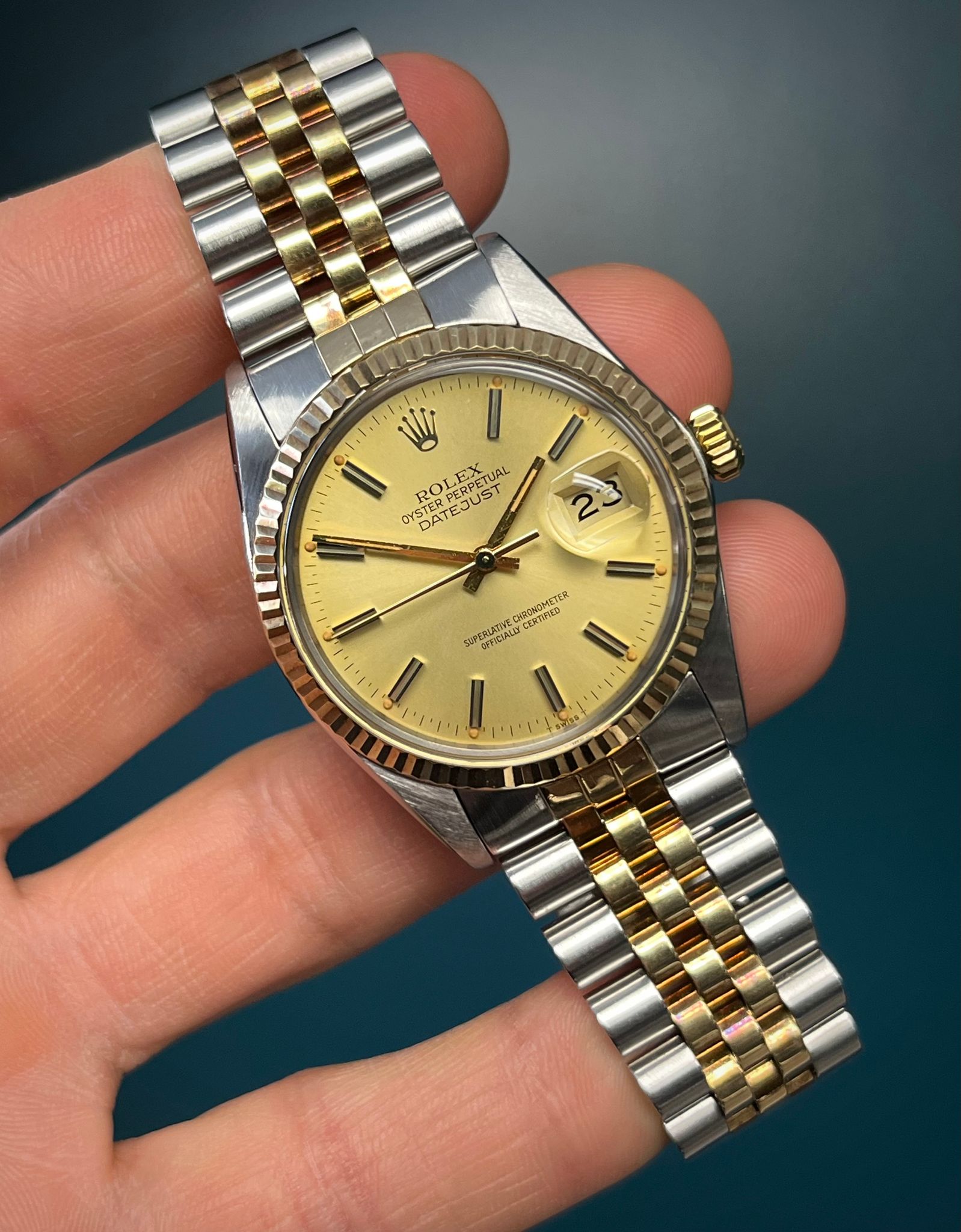 The Vintage Rolex Datejust Reference 16013 with a lemon toned dial with pumpkin patina is a stunning blend of classic elegance and timeless sophistication. Featuring a 36mm stainless steel case paired with a striking 18ct yellow gold fluted bezel, this iconic timepiece captures the essence of Rolex's renowned design ethos. The distinctive lemon toned dial, with its subtle pumpkin patina, adds a unique touch of refinement, beautifully complemented by the applied gold hour markers and hands. Powered by the reliable Rolex Caliber 3035 automatic movement, this watch offers precise timekeeping and the convenience of a quickset date function displayed at 3 o'clock. The two-tone Jubilee bracelet enhances its vintage charm while providing exceptional comfort and style. The Vintage Rolex Datejust 16013 with a lemon toned dial is a must-have for collectors and enthusiasts, epitomizing the perfect blend of luxury and enduring appeal.