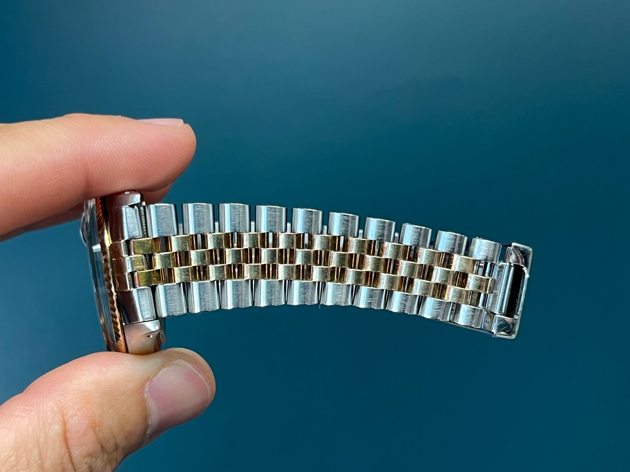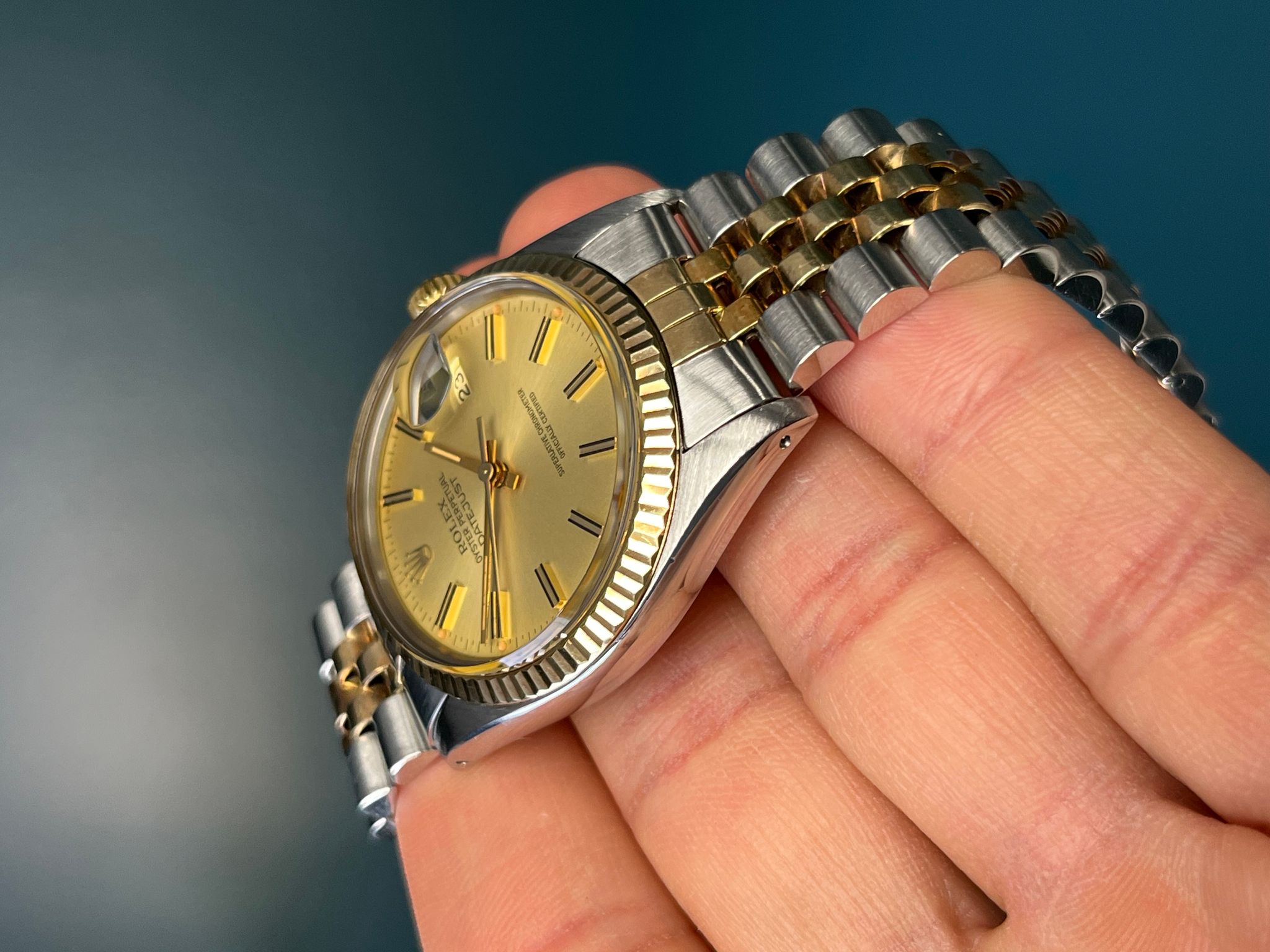 This two-tone Date Just showcases a lemon toned dial with thick pumpkin hr plots and all matching patina, featuring a date display, exemplifying Rolex's commitment to precision and enduring style. The holes case is razor sharp. The plexi is free from wear partnered with its excellent yellow gold fluted bezel. The lemon toned dial is excellent. The two-tone jubilee bracelet has 4 removable screws and shows no stretch making this a top tier example!