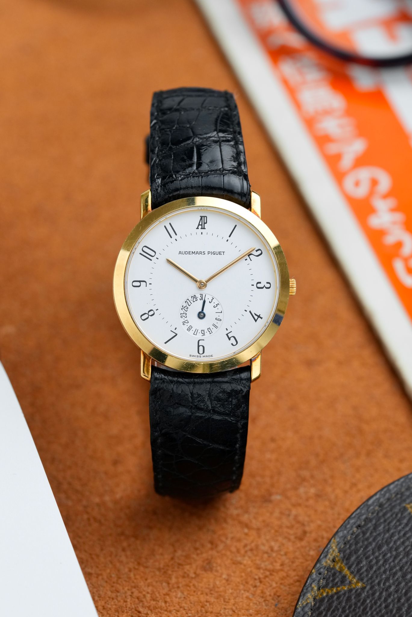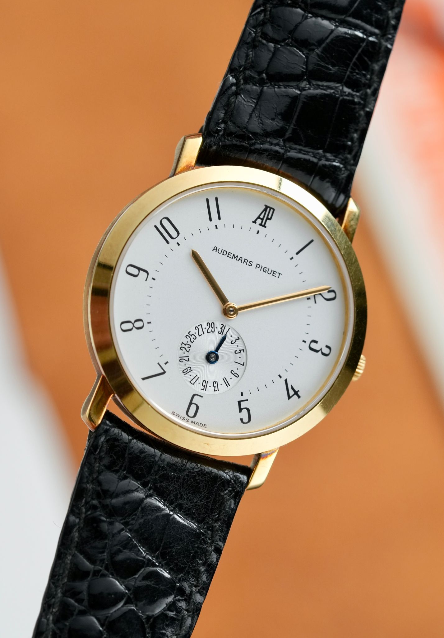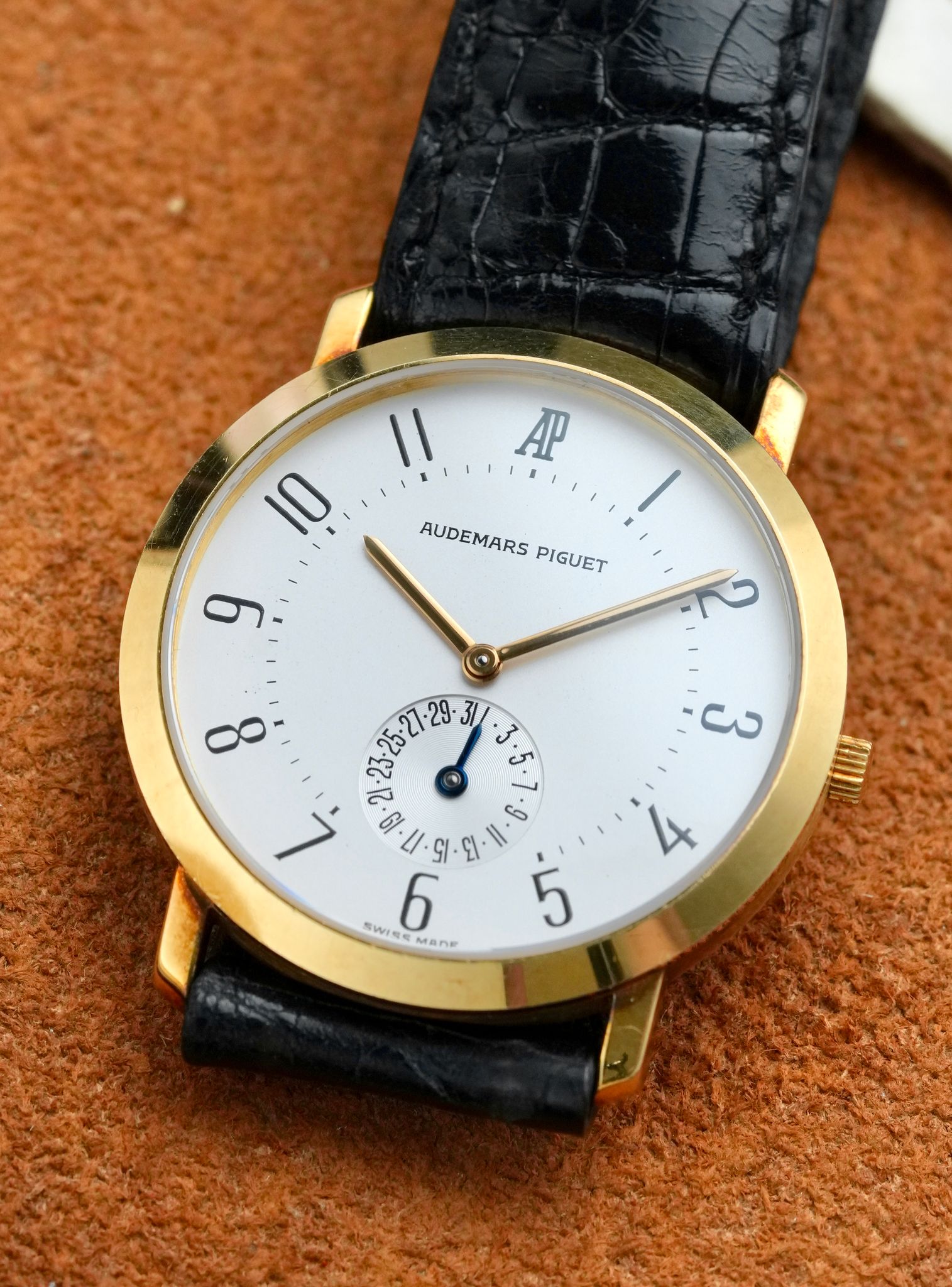 A fantastic 1980s Audemars Piguet dress watch in a 32mm unpolished 18K yellow gold case, with a shimmering dial adorned with painted bauhaus numerals and a sub-register date at 6 o'clock, conspicuously replacing what would traditionally be a small seconds, powered by a manually wound AP caliber, paired on its original AP leather strap and 18K gold