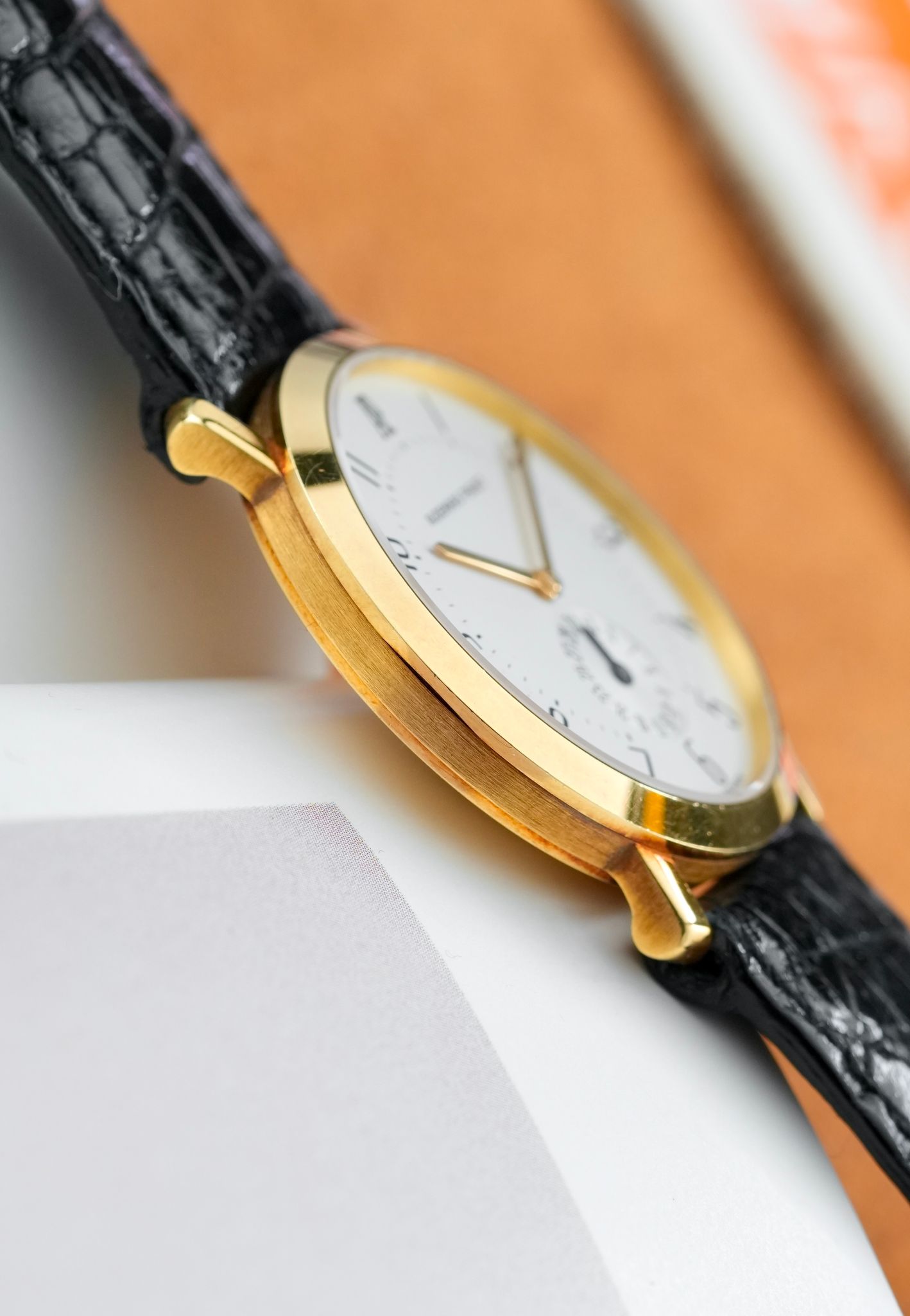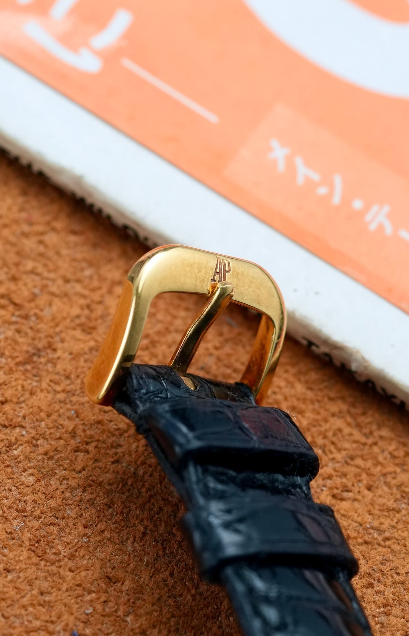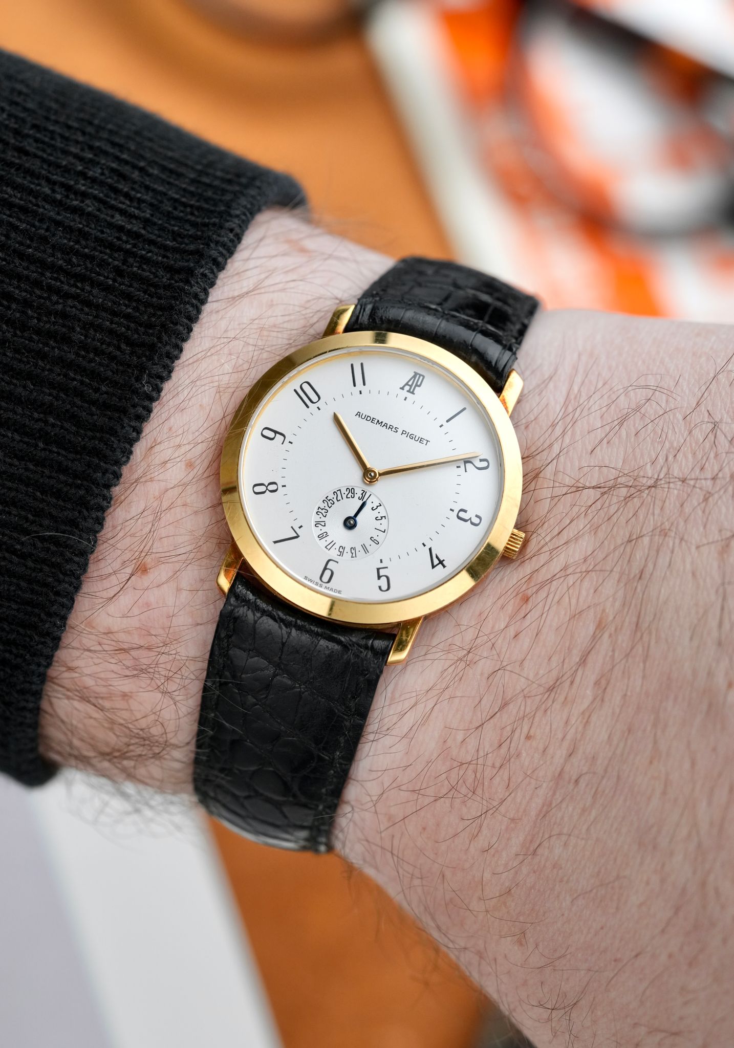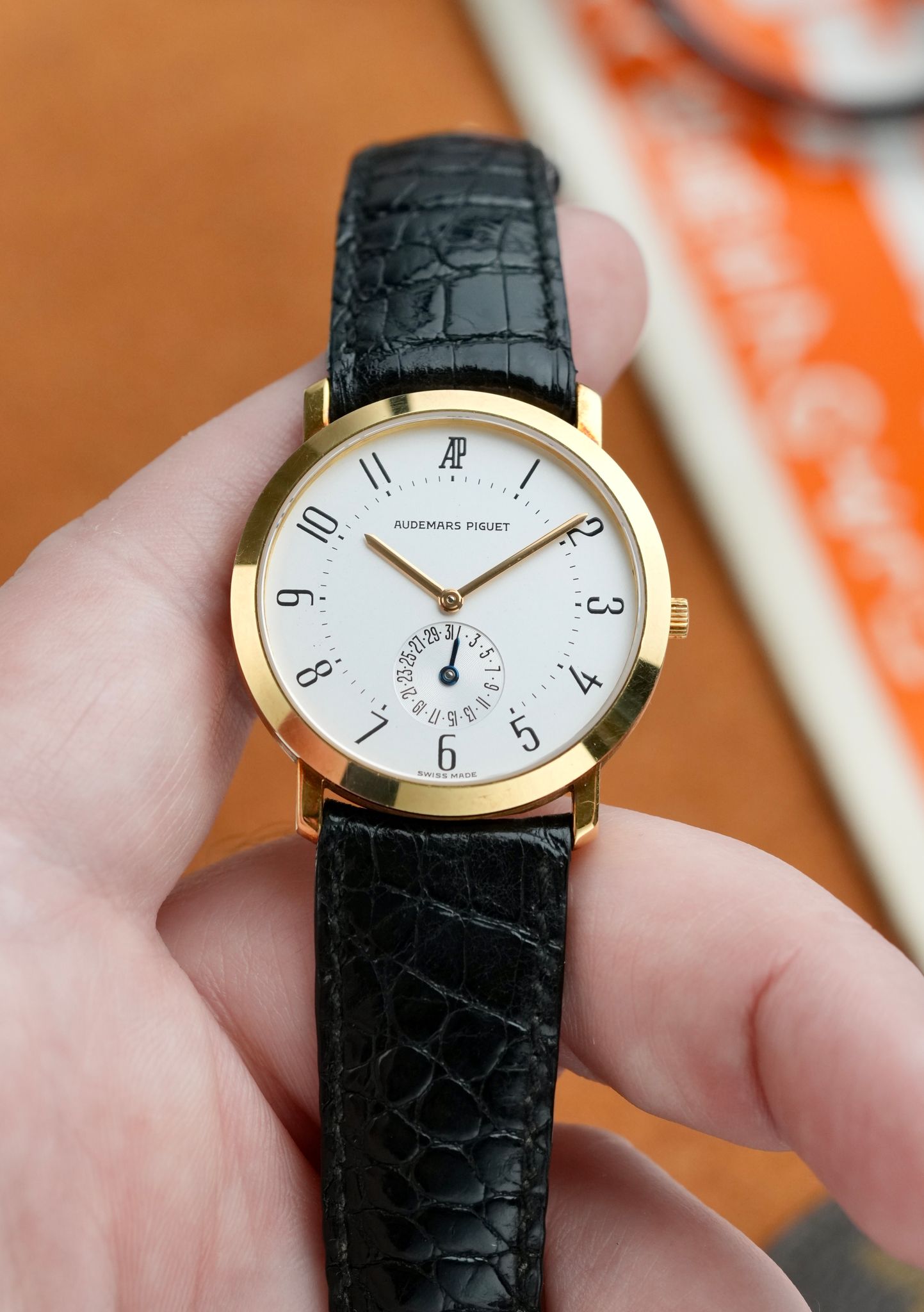 A fantastic 1980s Audemars Piguet dress watch in a 32mm unpolished 18K yellow gold case, with a shimmering dial adorned with painted bauhaus numerals and a sub-register date at 6 o'clock, conspicuously replacing what would traditionally be a small seconds, powered by a manually wound AP caliber, paired on its original AP leather strap and 18K gold