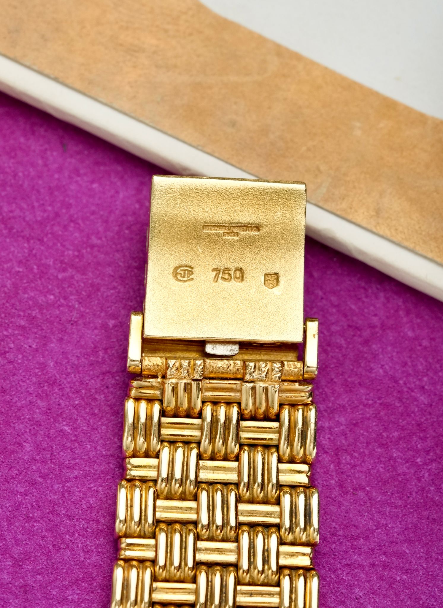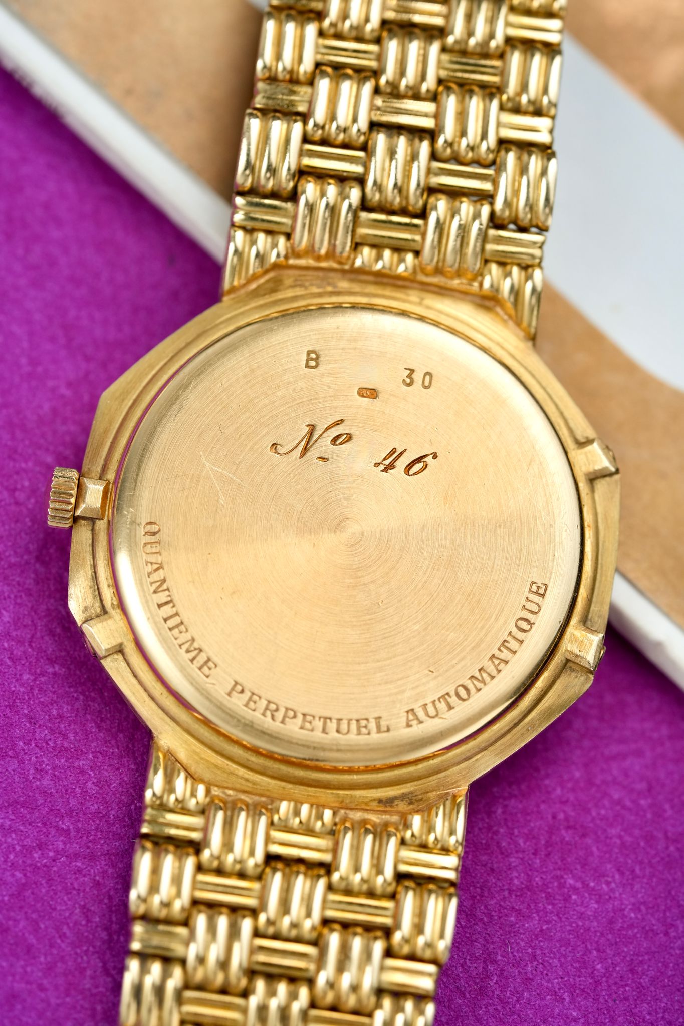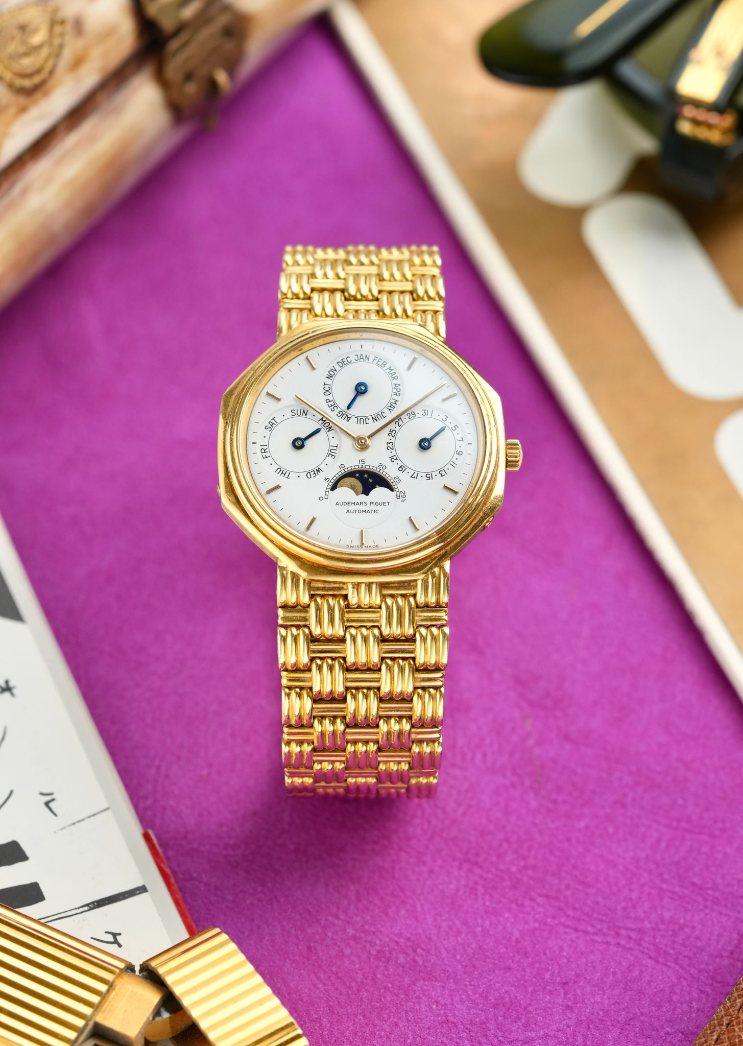 An incredible early 1980s Audemars Piguet Quantieme Perpetual "Octogone" ref. 5557 in solid 18K yellow gold, this a very rare configuration featuring a stepped Royal Oak style octagonal 35.5mm case, interwoven gadrooned & signed bracelet sized to fit a 7.5 inch wrist, powered by the JLC based cal. 920 self-winding perpetual calendar module that later powered the first Royal Oak QPs.