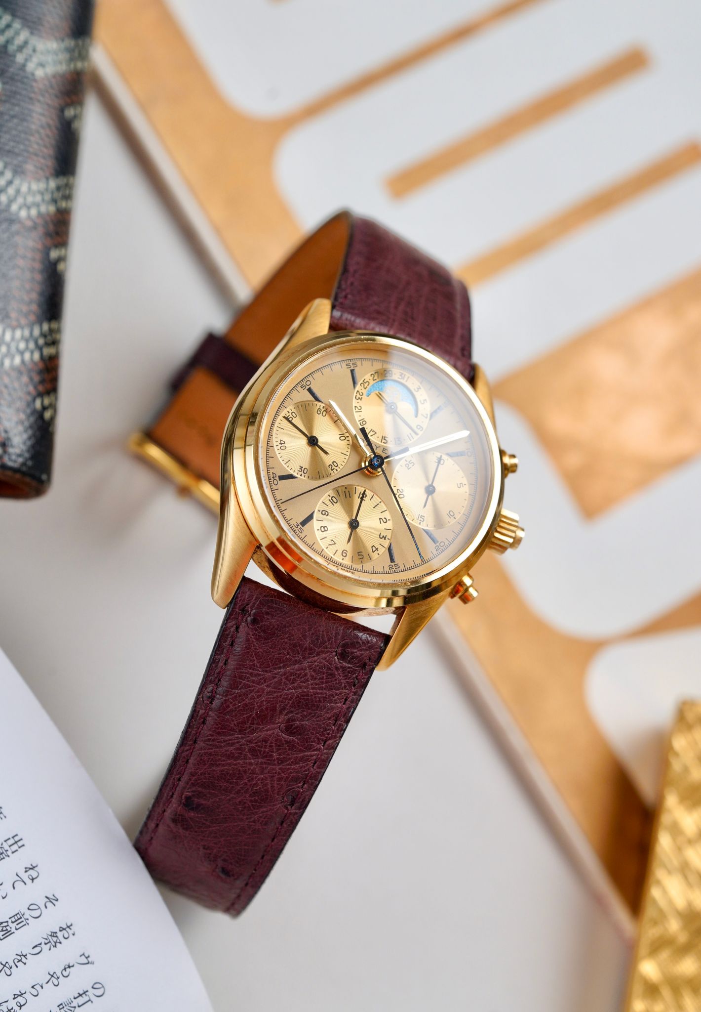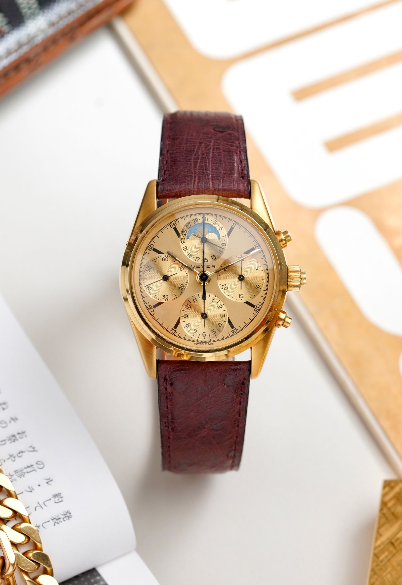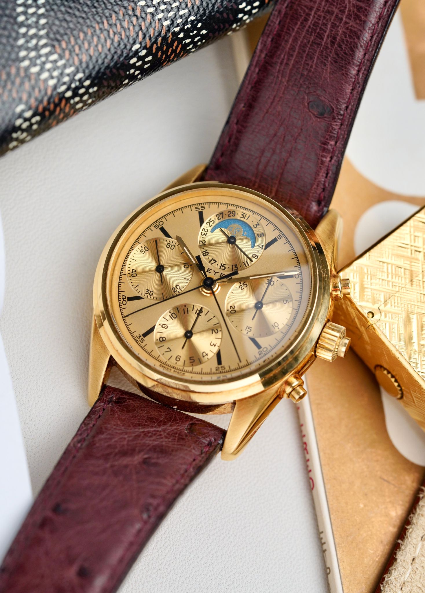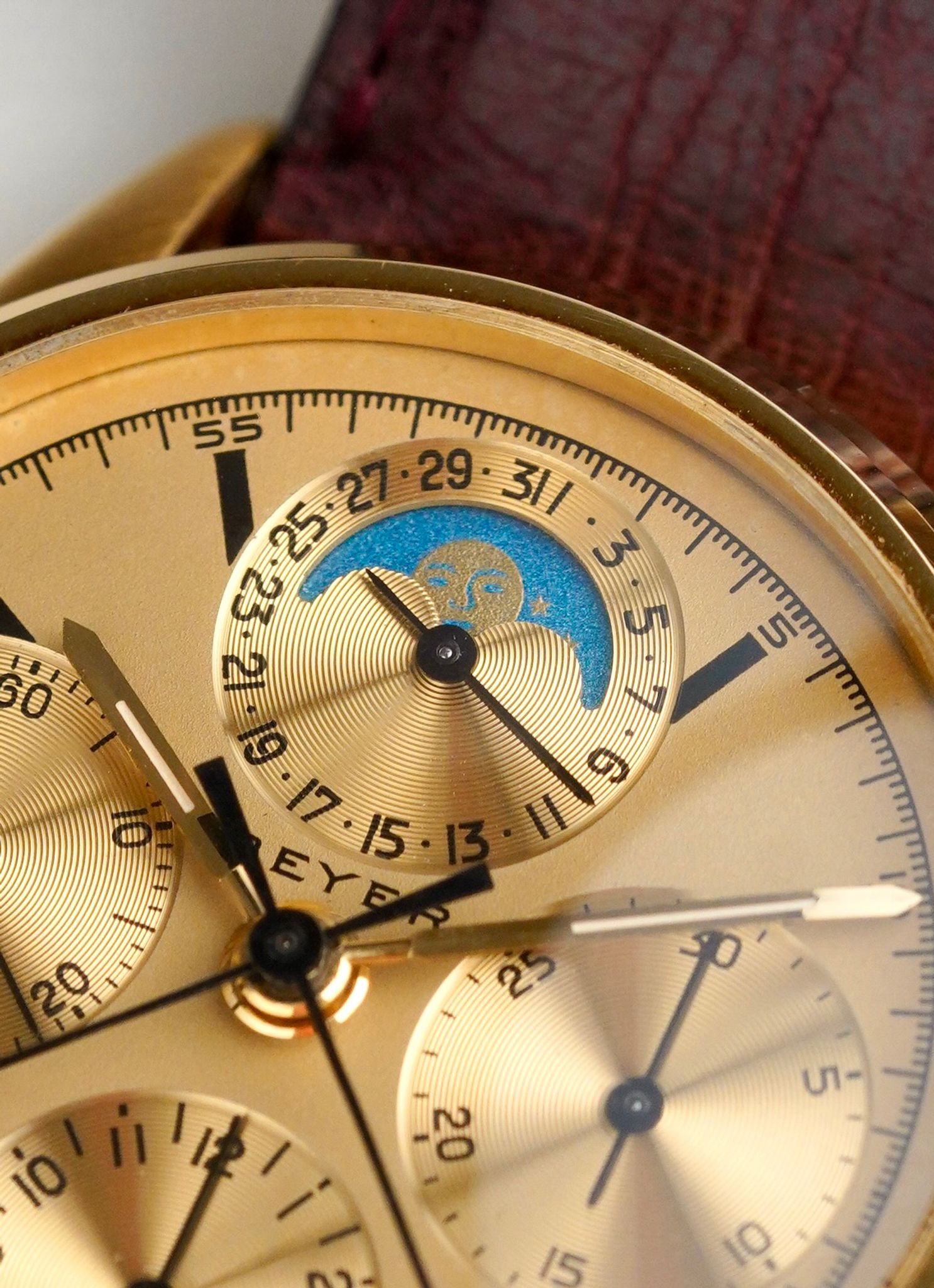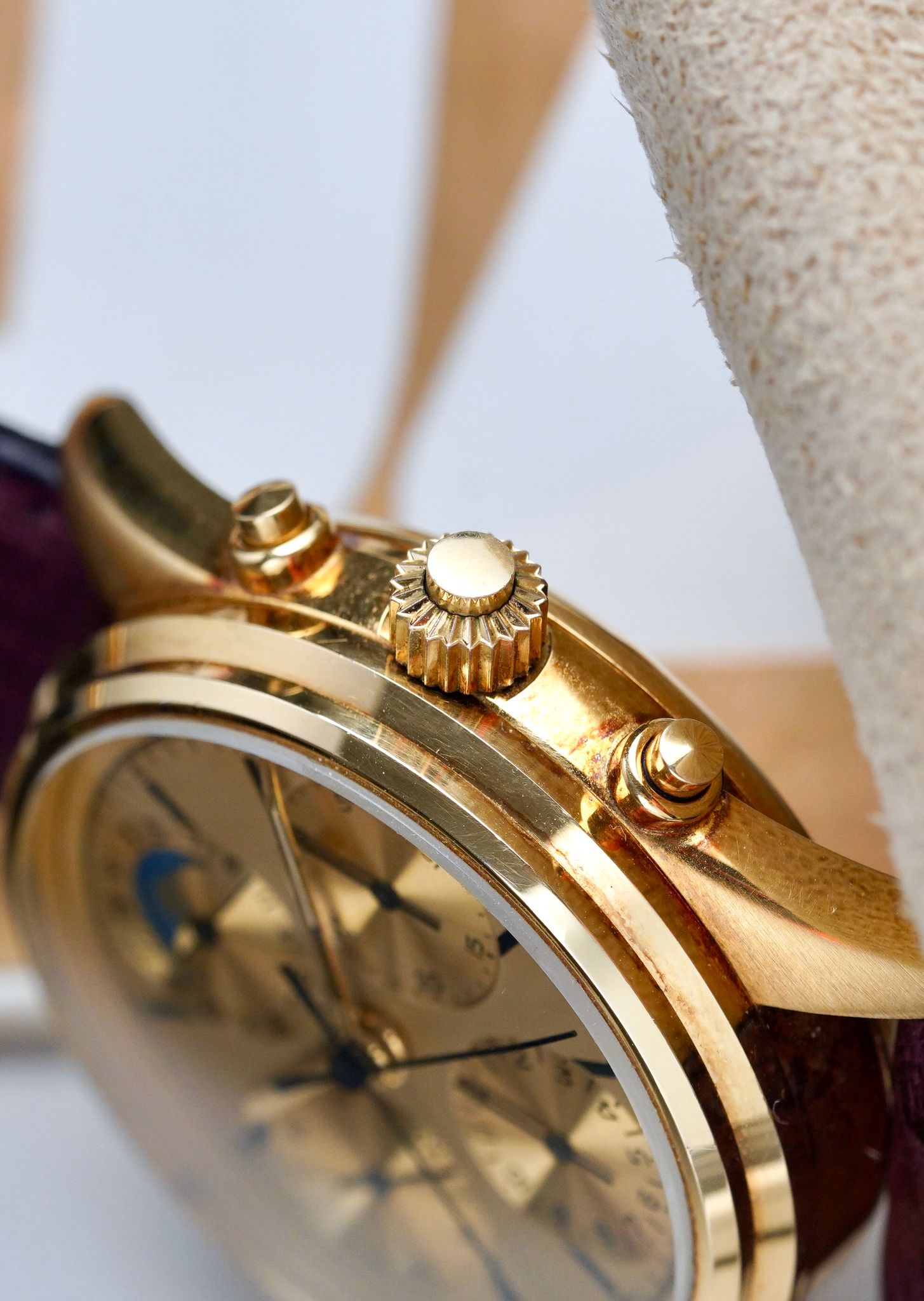 An outstanding and extremely rare Beyer Rattrepante Moonphase from 1982, in a 36mm 18K yellow gold case, doubled stepped bezel, large crown and glimmering champagne dial, powered by a modified Venus 178 caliber with enormous depth and finishing.