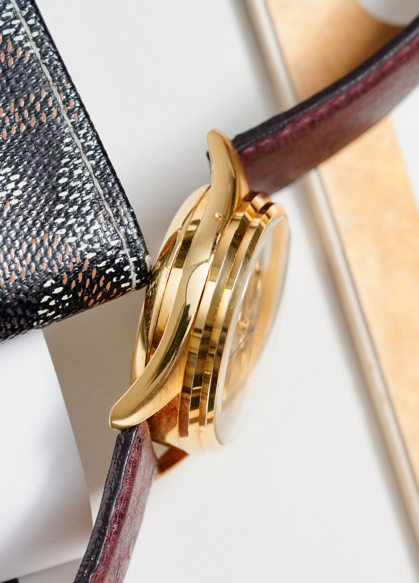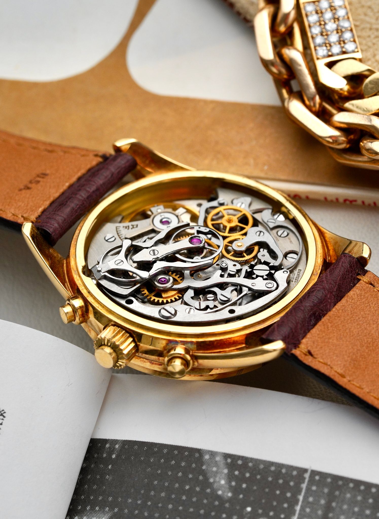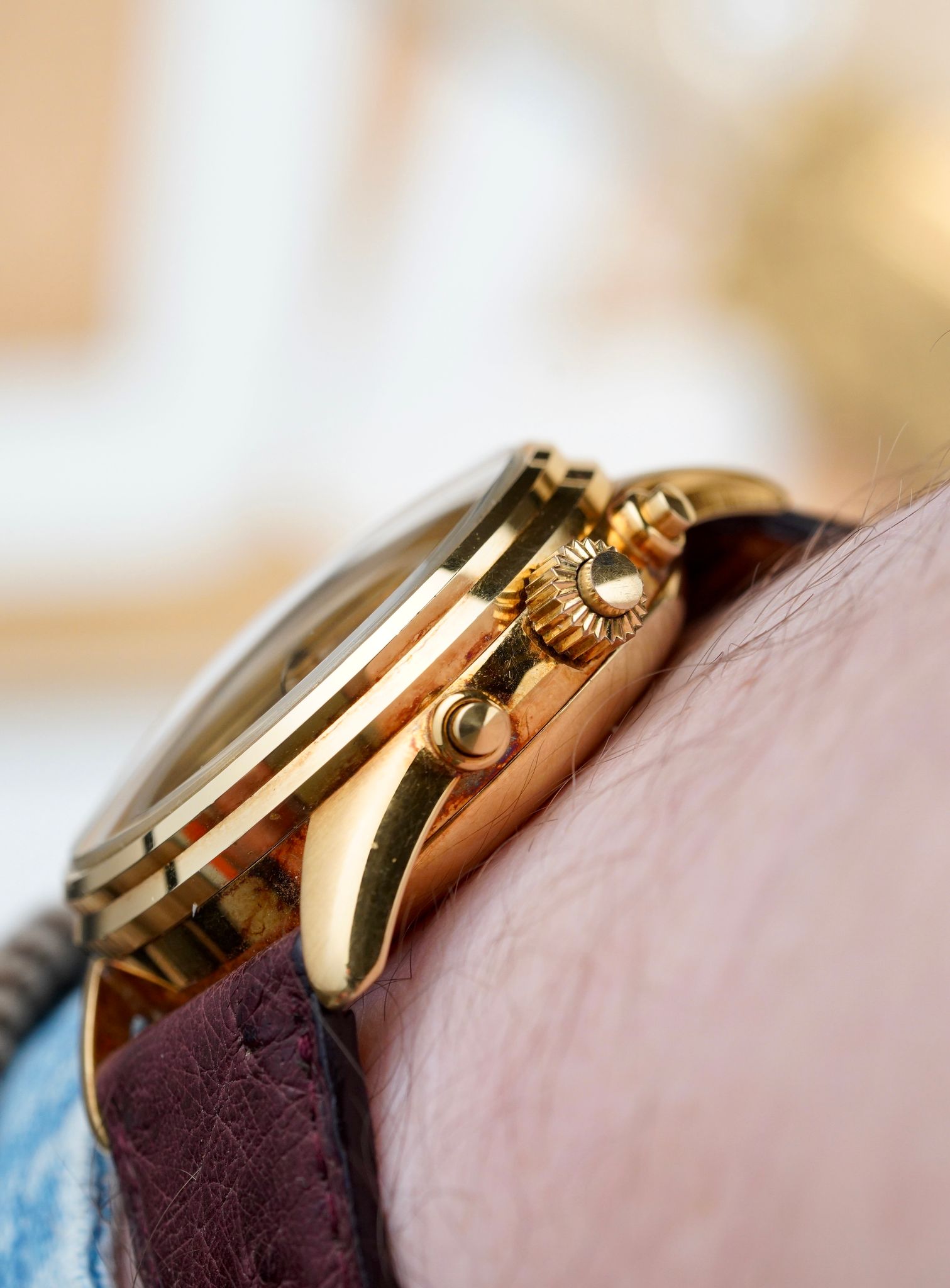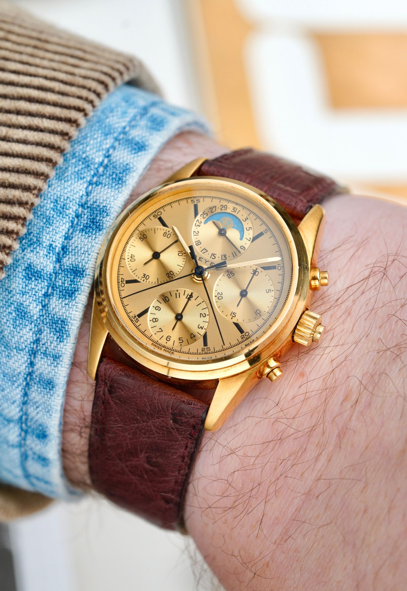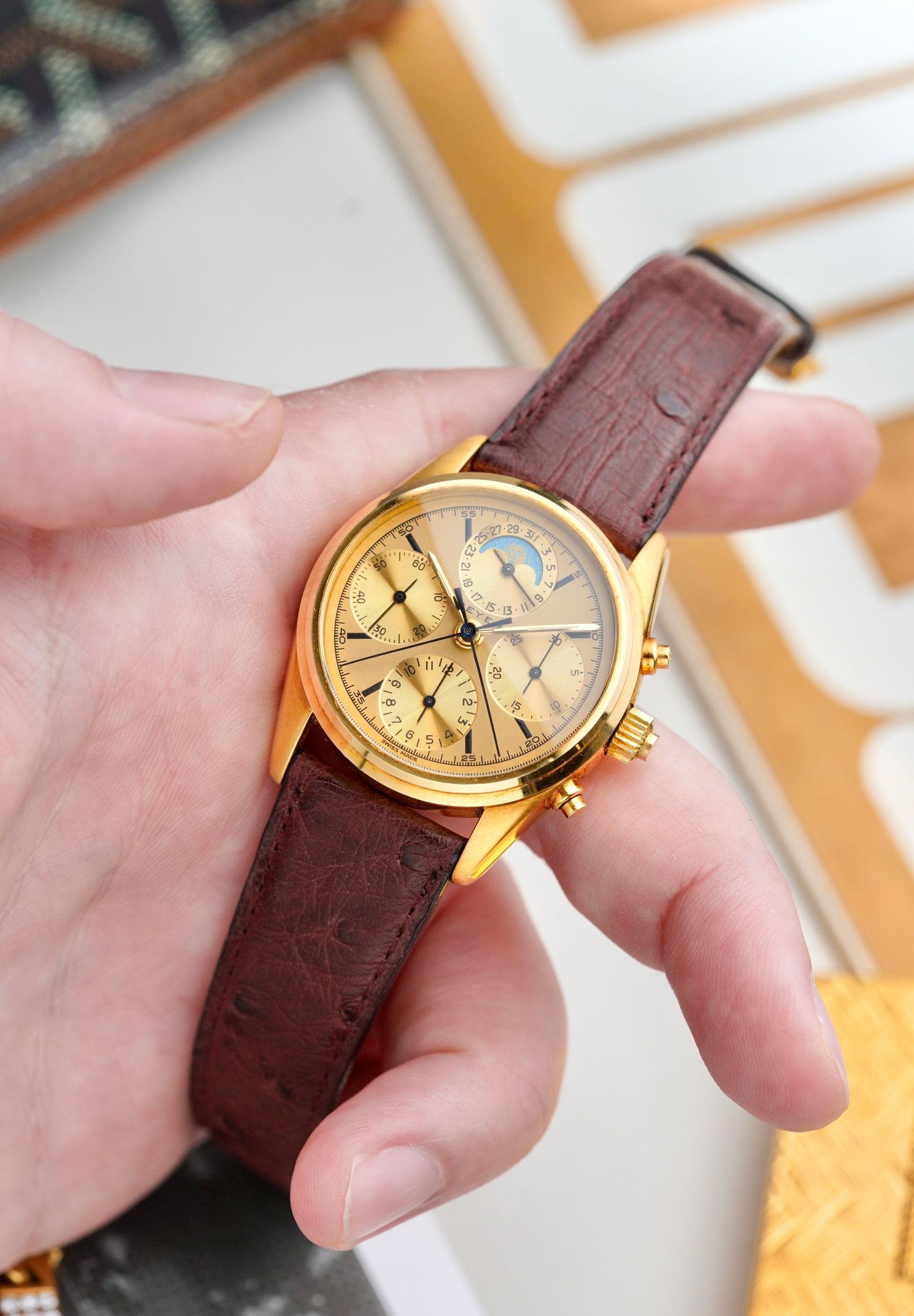 An outstanding and extremely rare Beyer Rattrepante Moonphase from 1982, in a 36mm 18K yellow gold case, doubled stepped bezel, large crown and glimmering champagne dial, powered by a modified Venus 178 caliber with enormous depth and finishing.