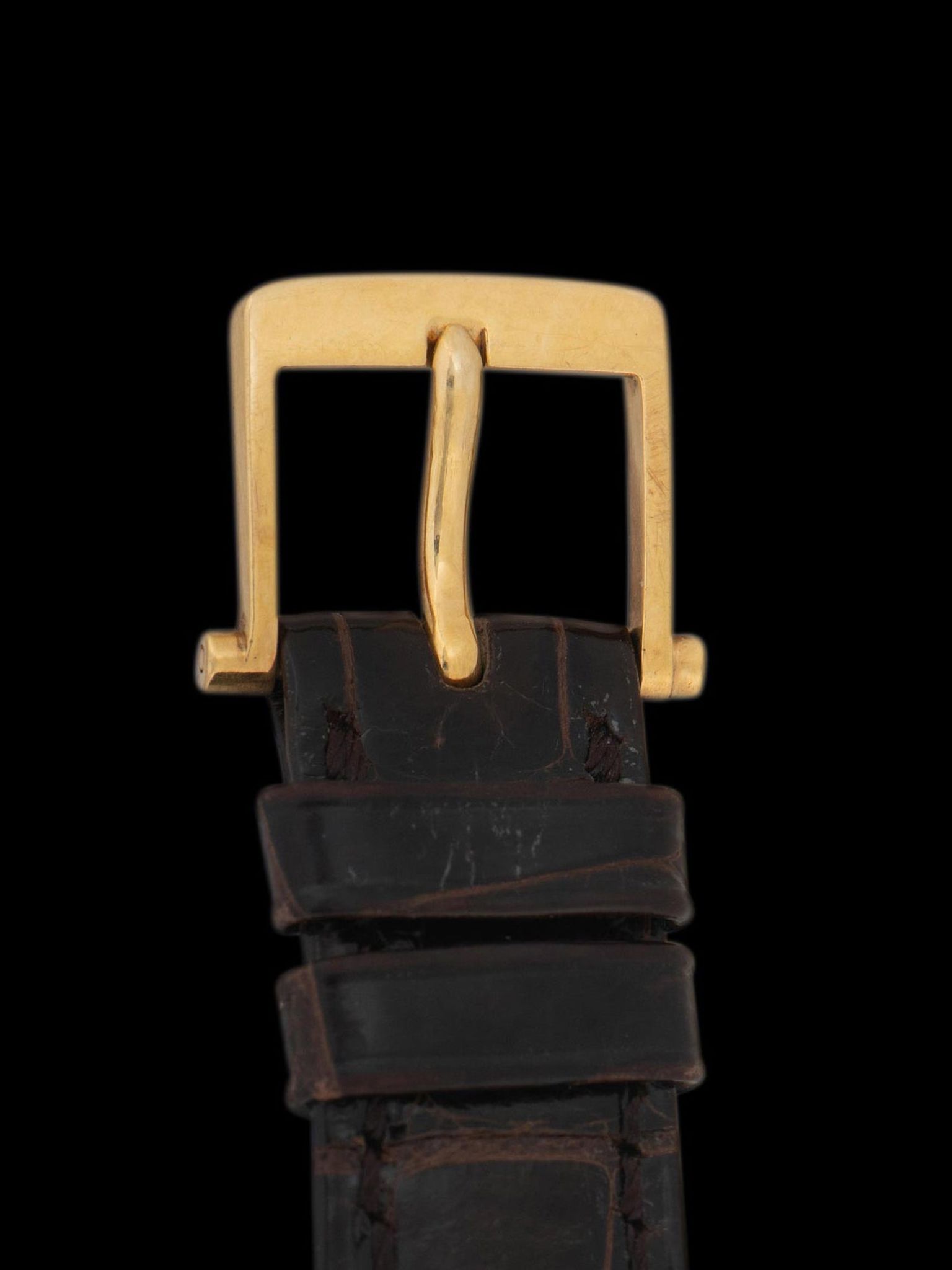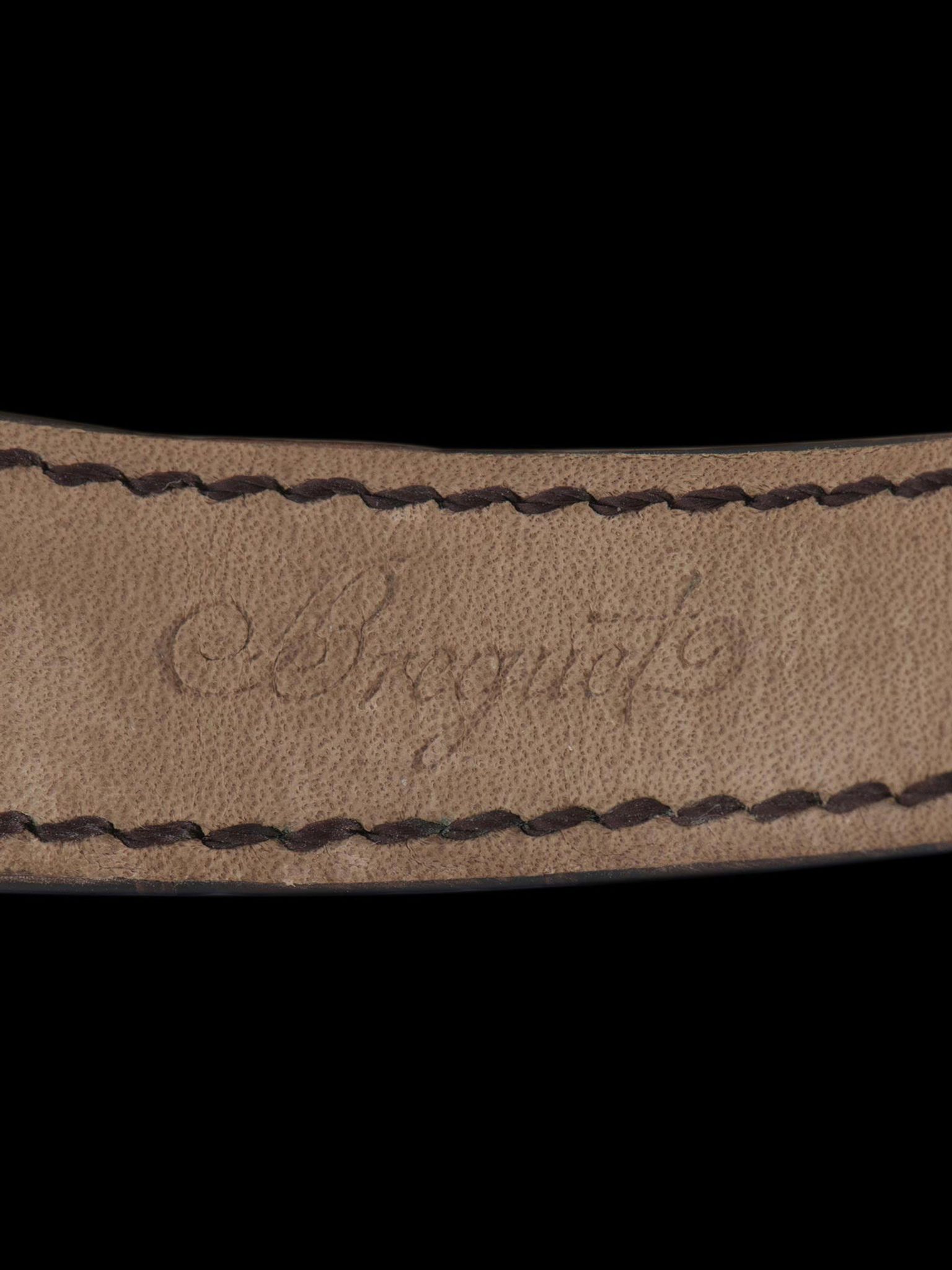 The 18K yellow gold cushion-shaped case is beautifully preserved and features lugs that increase the overall visual size of the watch. The case exhibits minimal signs of use with no notable evidence of previous polishing. The case features the classic "coin-edge" detailing to the side of the case and retains the original blue sapphire cabochon crown. The factory markings and hallmarks remain in deep and fully present condition throughout the case and case back. The watch comes supplied on a 2-piece brown alligator "cousu main" Breguet strap, along with the original 18K white gold Breguet tang buckle.