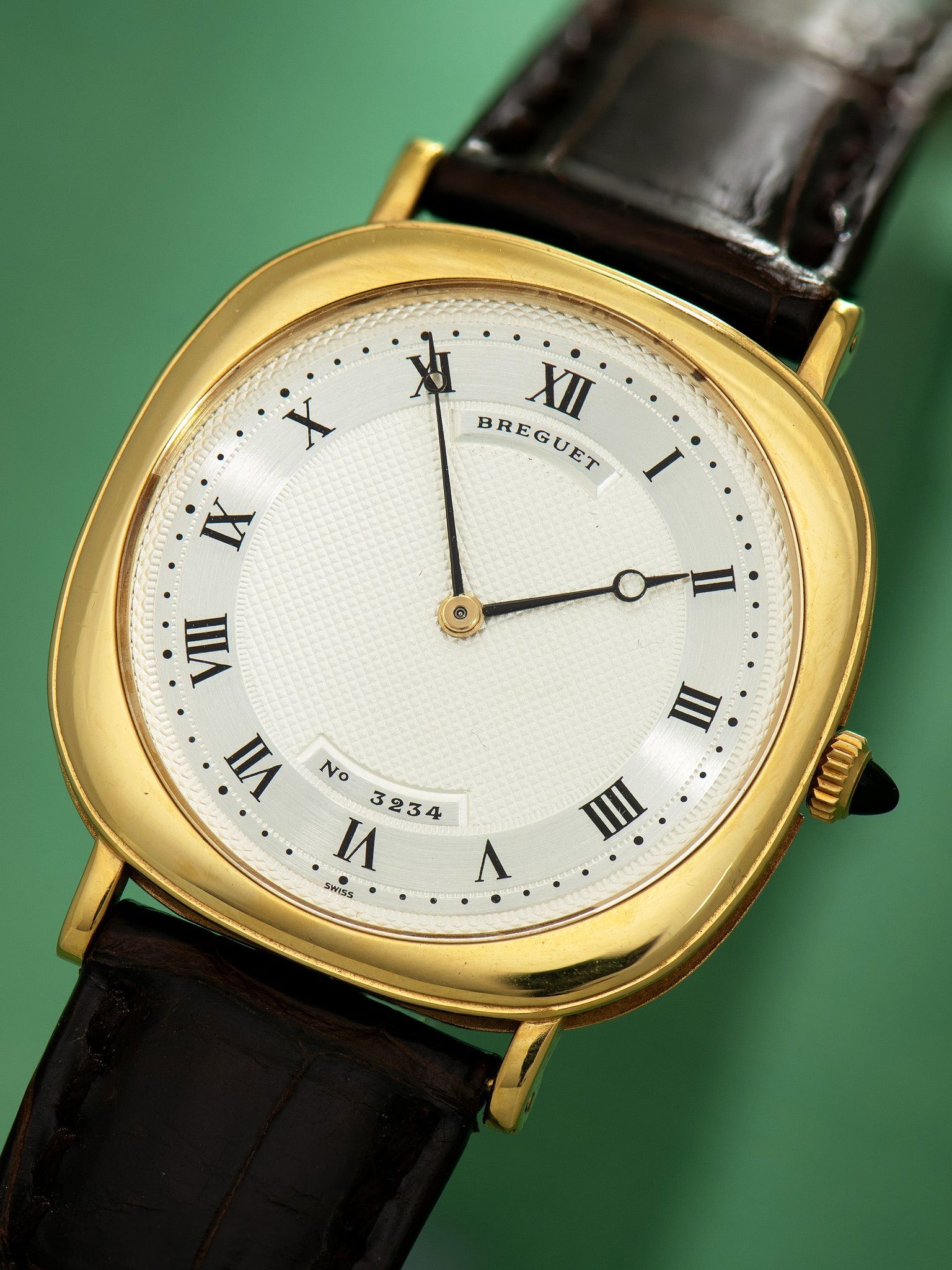 While the cushion-shaped case of this Breguet ref. 3560 is truly uncommon for the brand, this model retains all of the classic Breguet characteristics we know and love from the brand, resulting in an exciting, attractive, and truly rare offering. The cushion case offers soft, more organic dimensions, which are then contrasted by the intricately executed hand-engraved guilloche dial and coin-edge motif on the case sides. All these details are perfectly proportioned in a thin case with the help of the ultra-thin automatic movement