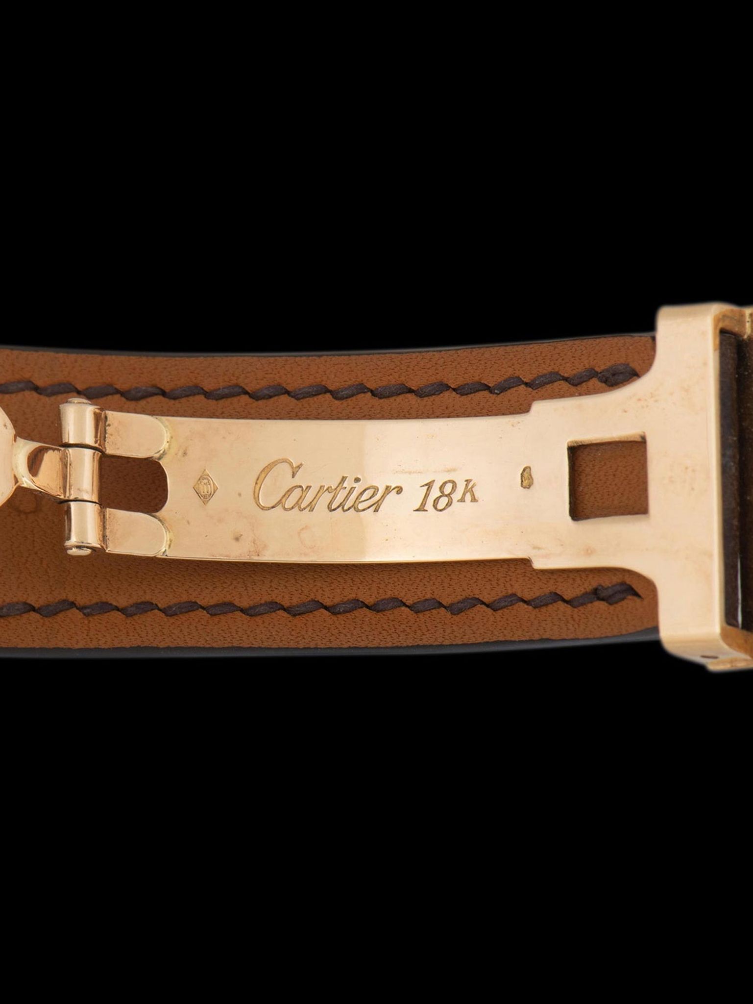 The extra thin or "Extra Plate" 18K yellow gold case is exceptionally well-preserved, retaining crisp hallmarks, factory finishing, and dimensions throughout. The case displays normal signs of gentle use with minimal evidence of being previously polished present. The original sloped-glass crysta shows subtle signs of use and is relatively unnoticeable while on wrist. The case retains its original blue sapphire cabochon crown. The uncommon back-screw case features some light wear with the factory finishing, original engravings, and hallmarks all present. The watch comes supplied on a 2pc handmade leather strap with the original Cartier 18K yellow gold deployant clasp.